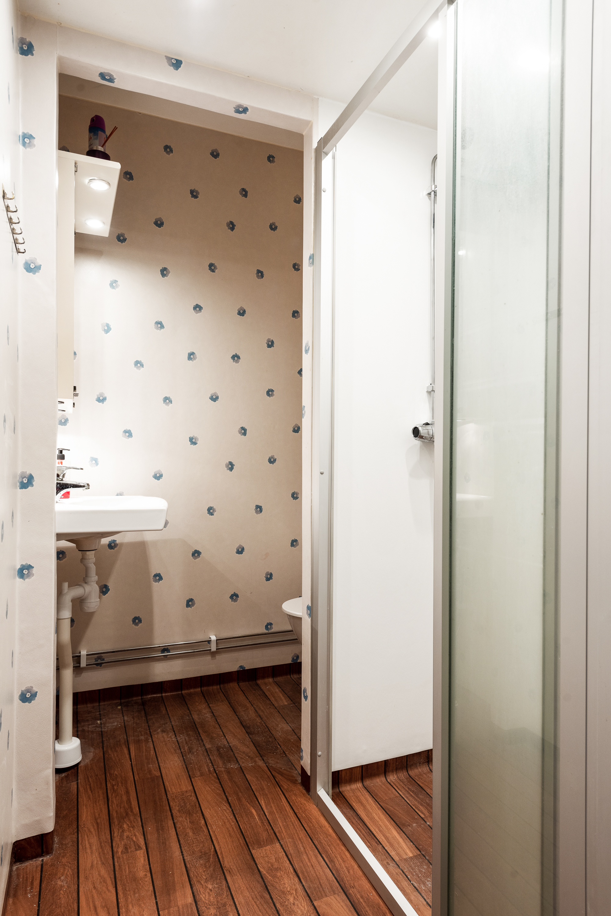 Rymligt duschrum med WC, handfat, duschhörna, badrumsskåp med spegelluckor och belysning. I taket sitter spotlights. Duschhörnan är renoverad 2022.
