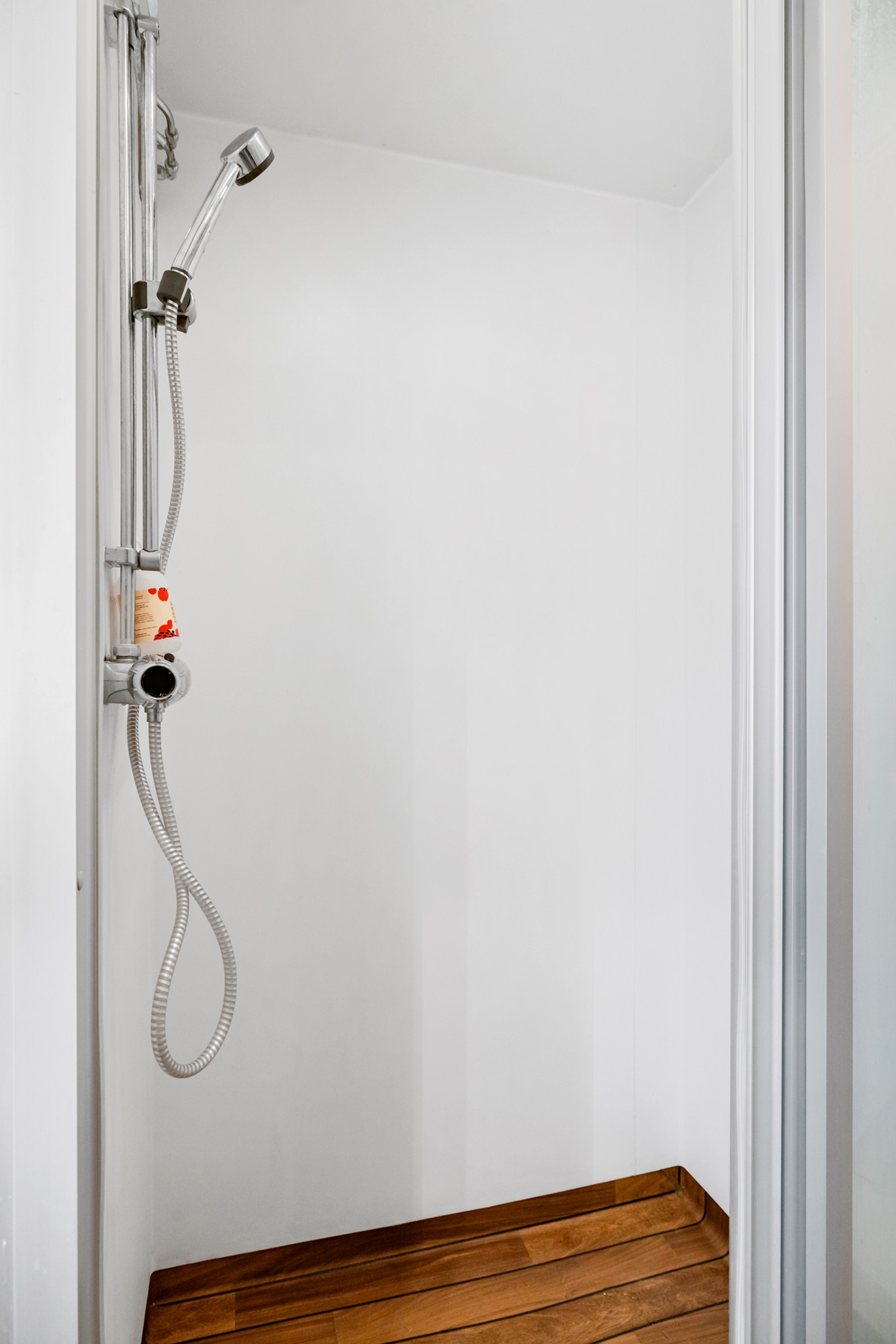 Praktiskt kokvrå med induktionshäll, fläkt, kyl med frysfack, diskho och förvaring i skåp bakom vita luckor. Eluttag finns och på väggarna sitter vitt kakel.