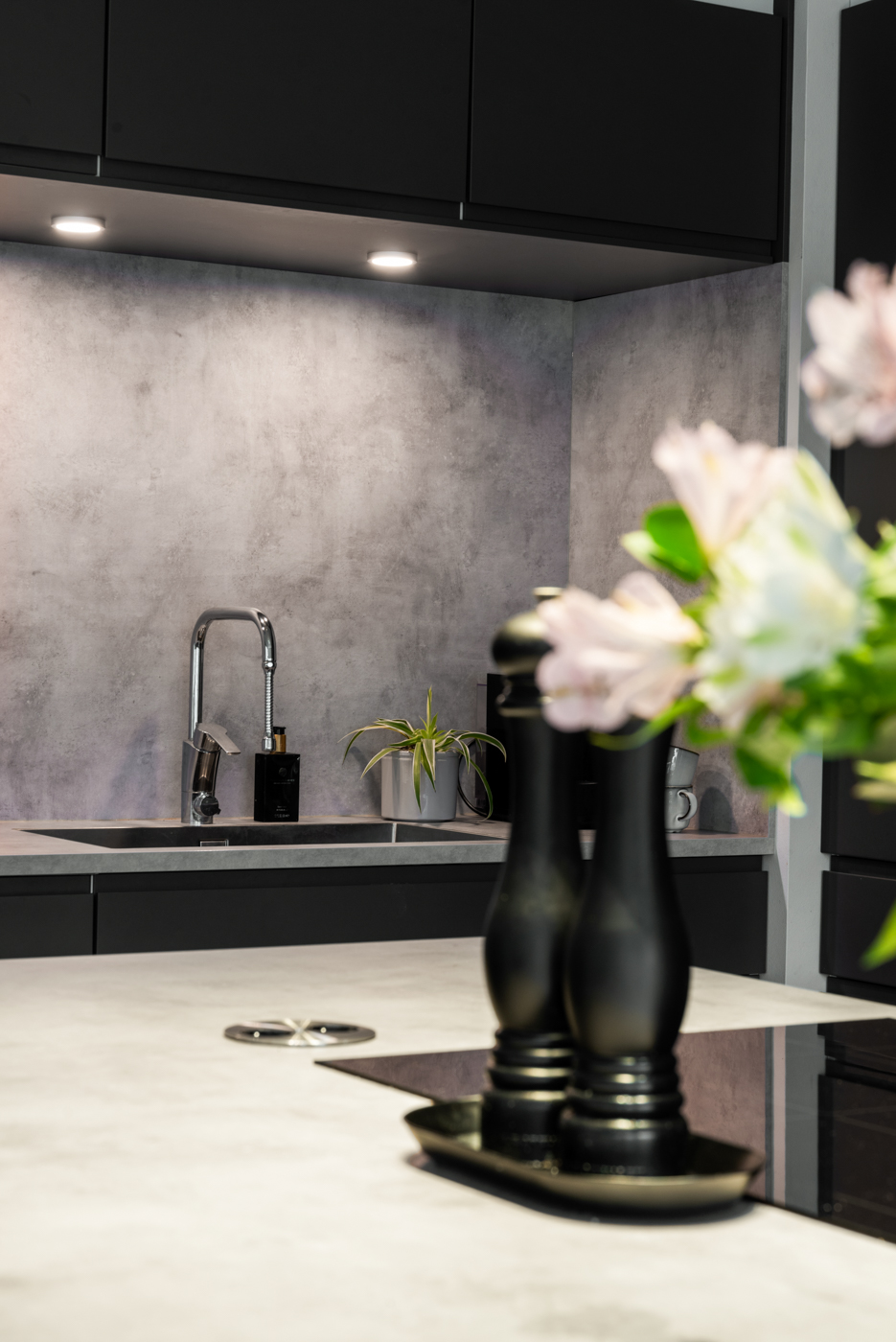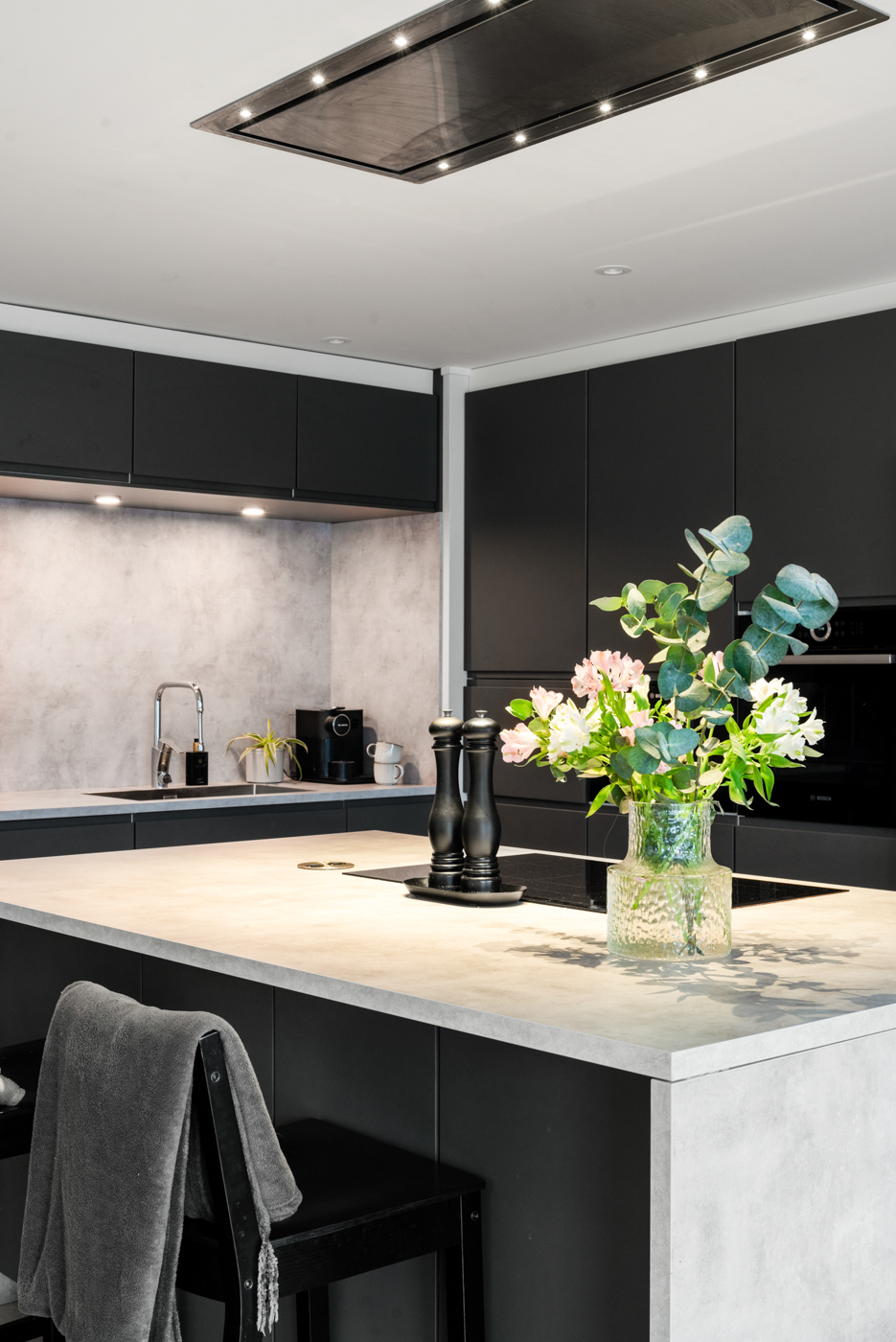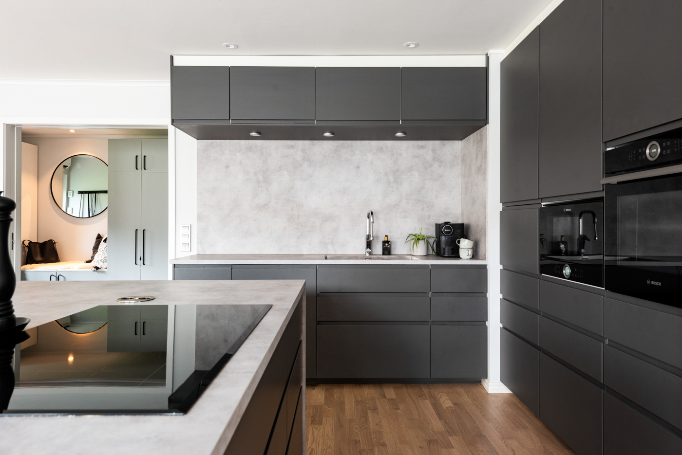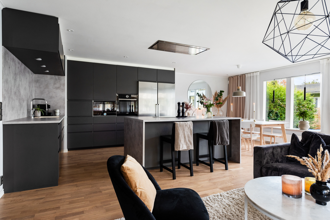 Modernt och exklusivt kök i mycket trivsam planlösning med köksö. Svårslagen social yta där köket har goda arbetsytor och förvaringsmöjligheter. Den öppna ytan mot vardagsrummet erbjuder flera möbleringsmöjligheter för matbord och köksön är både en trivsam arbetsyta men också en fin servieringsyta med sittplatser. I köksön finns en extra bred induktionsspishäll och ovan är in inbyggd fläkt i taket. I köksön finns även eluttag och förvaring i skåp. Kökets maskinpark är komplett och från Bosch med kyl och frys i fullhöjd, ugn, kombiugn/micro, integrerad diskmaskin och diskho. Infällda spotlights i taket och ett snyggt stänkskydd ovan köksbänk.