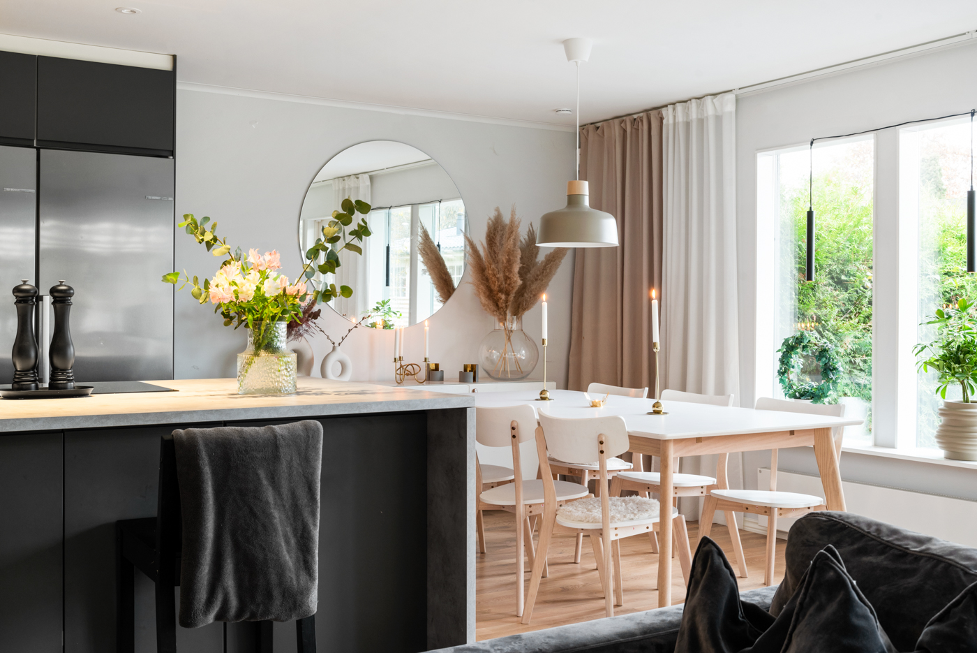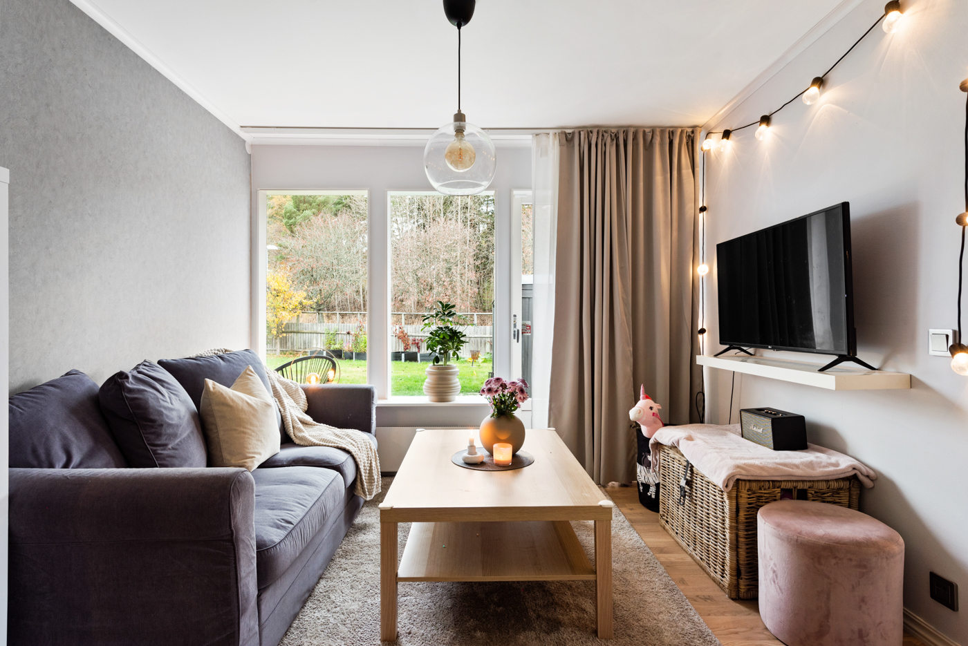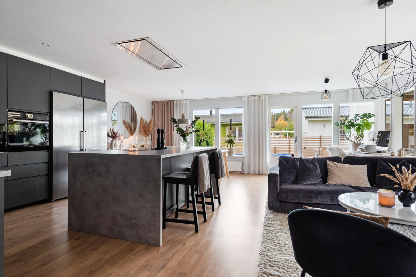 Rymligt och ljust vardagsrum i öppen yta mot köket rymmer den stora familjen och större sällskap. Häftig yta med stora fönsterpartier i två väderstreck samt utgång till uteplatsen under tak. Här finns flera möbleringsmöjligheter som rymmer både matbord och sittgrupper samt TV-hörna. Ljust målade väggar och ljust ekparkettgolv.