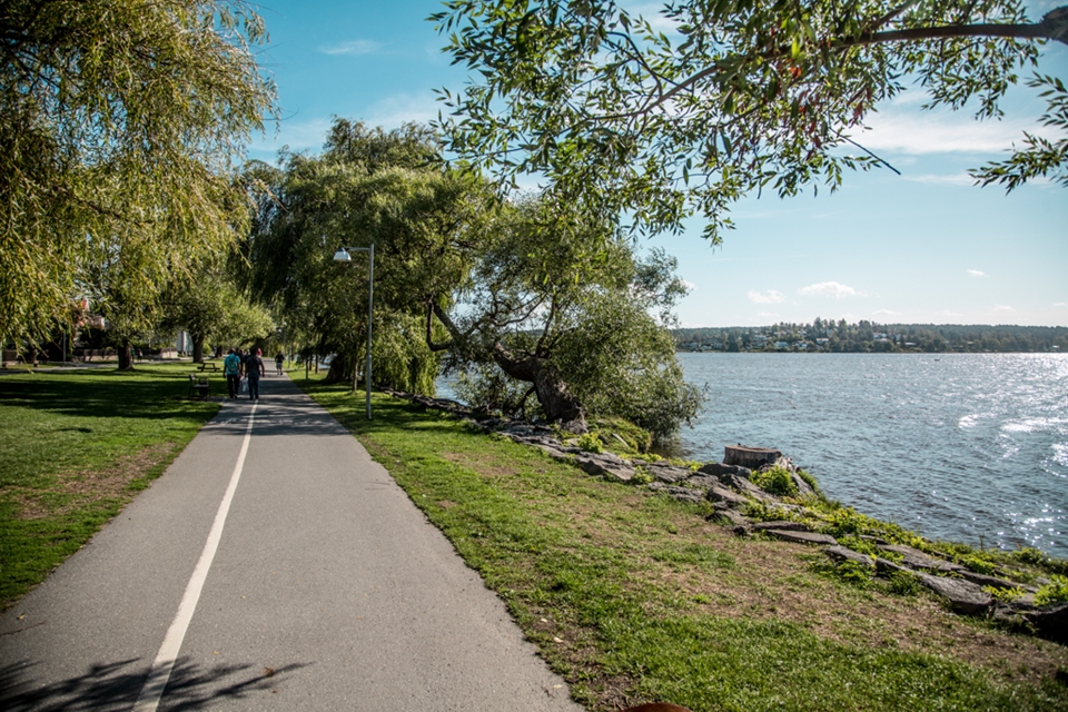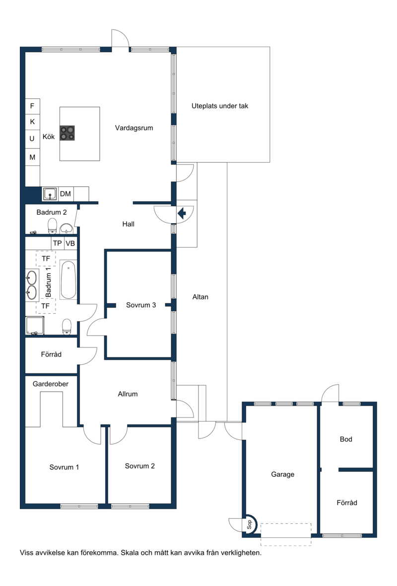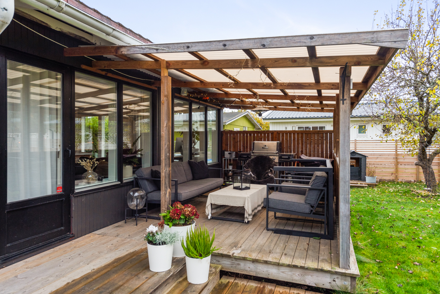 Rymligt och ljust vardagsrum i öppen yta mot köket rymmer den stora familjen och större sällskap. Häftig yta med stora fönsterpartier i två väderstreck samt utgång till uteplatsen under tak. Här finns flera möbleringsmöjligheter som rymmer både matbord och sittgrupper samt TV-hörna. Ljust målade väggar och ljust ekparkettgolv.
