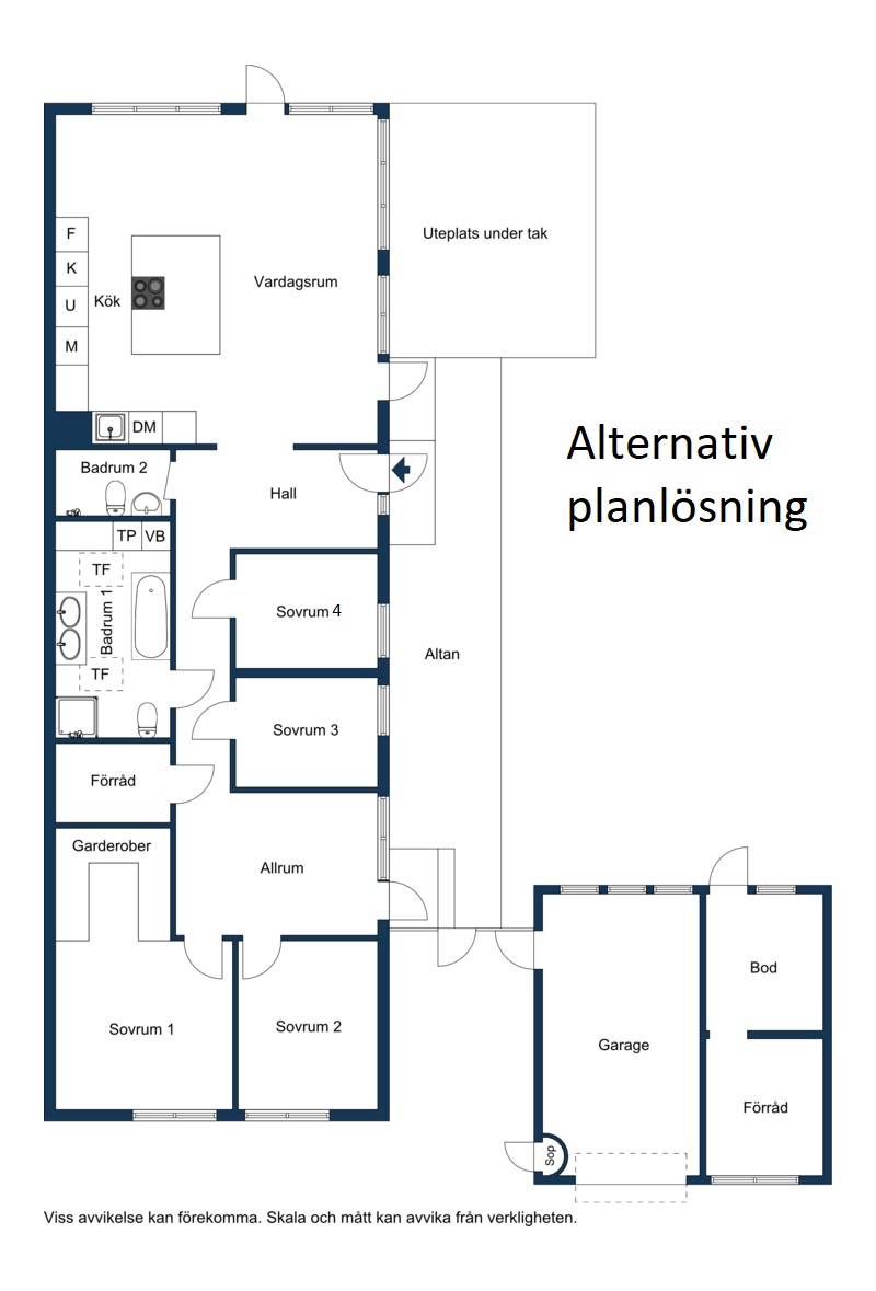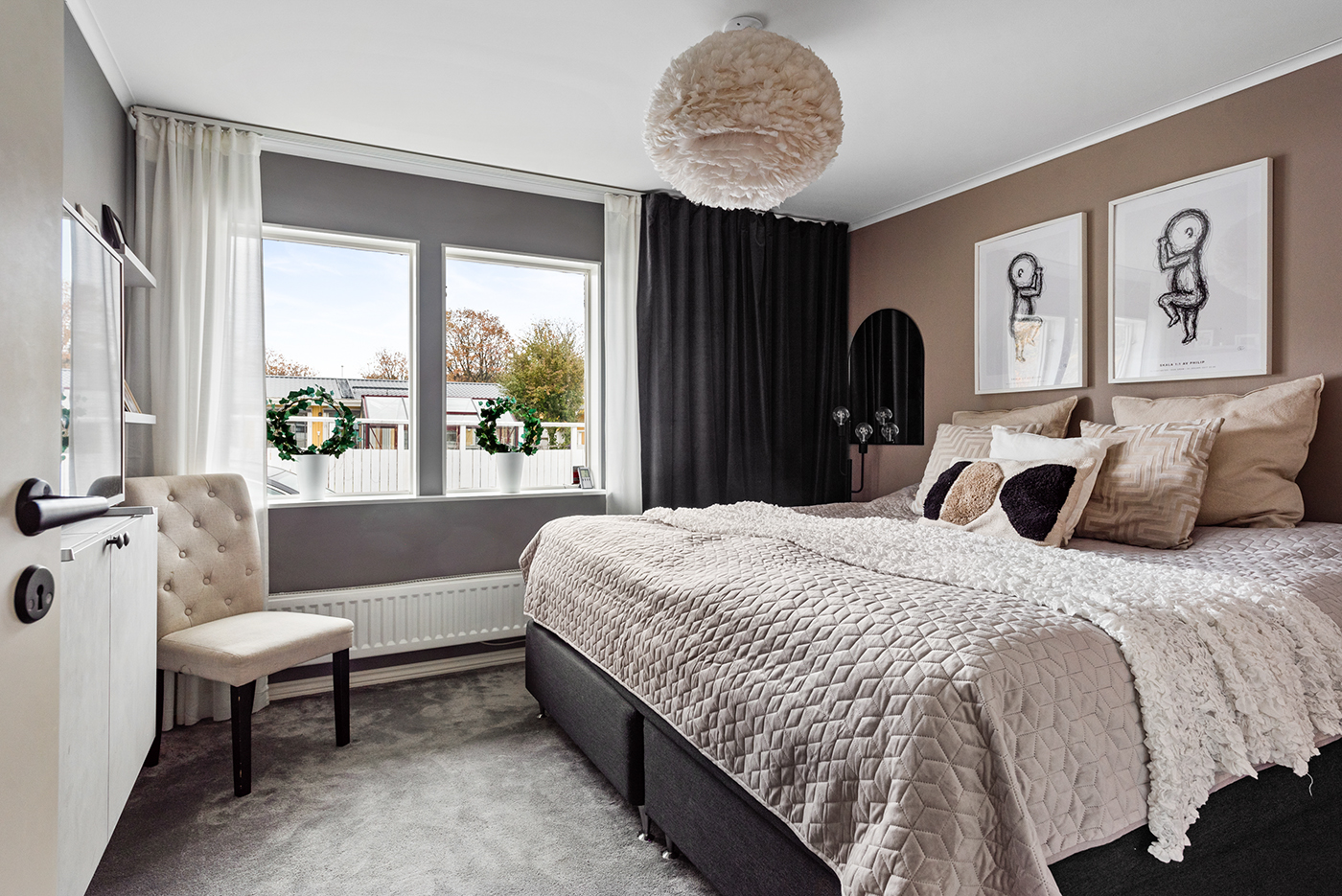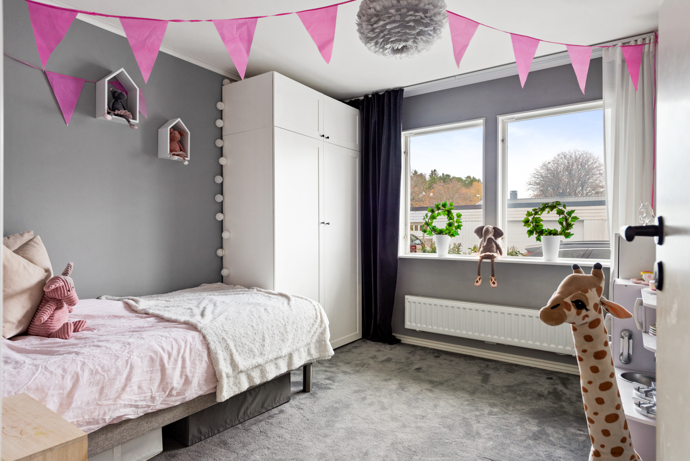 Stort sovrum sov tidigare varit två sovrum. Kan återställas genom att sätta upp den avskiljande väggen och öppna upp dörren. Målade väggar och matchande heltäckningsmatta på golvet.