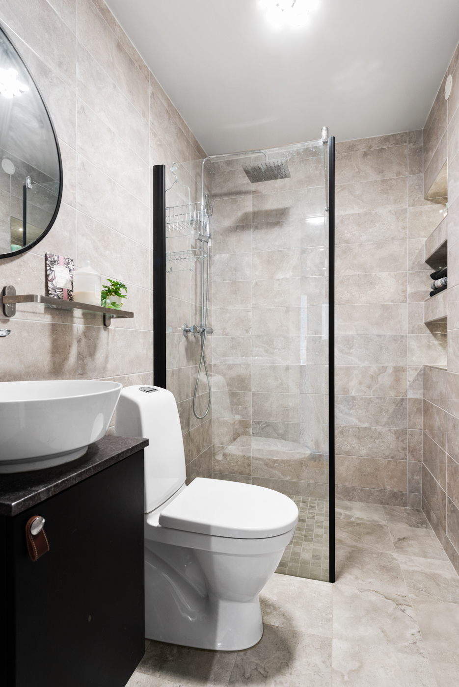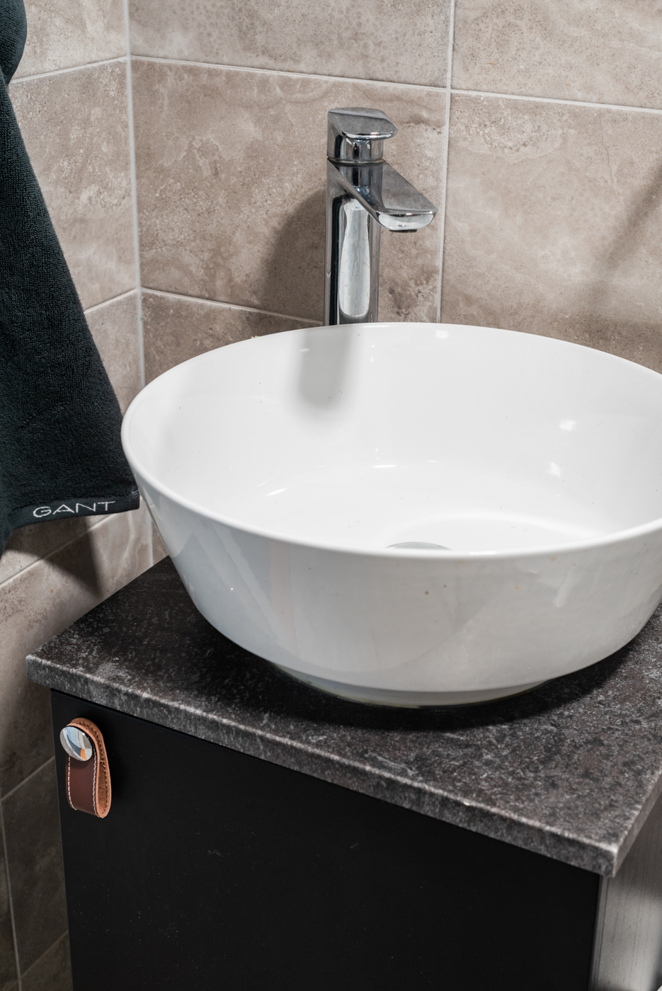 Även detta badrum är påkostat och mycket stilrent. Stora och matchande kakel- och klinkerplattor på golv och väggar. Runt handfat på skiva och med skåp under. Hyllplan i glas och matchande spegel ovan. Duschvägg i glas och inbyggda hyllplan med inbyggd belysning ger badrummet en modern karaktär. Takdusch och golvvärme.