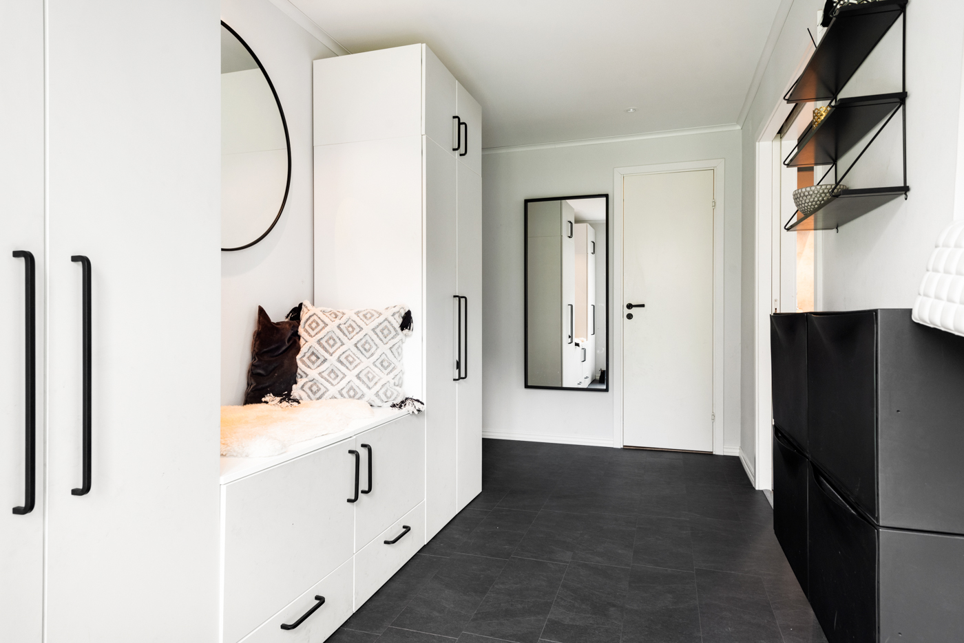 Redan i hallen presenterar sig husets höga standard och moderna skick. Här finns gott om svängrum och plats för klädhängare, hattylla, skoställ och garderober eller byråer. Ljust målade väggar och matchande laminatgolv. Infällda spotlights i taket. Längre in i hallen finns ett förråd som ger extra förvaringsyta.