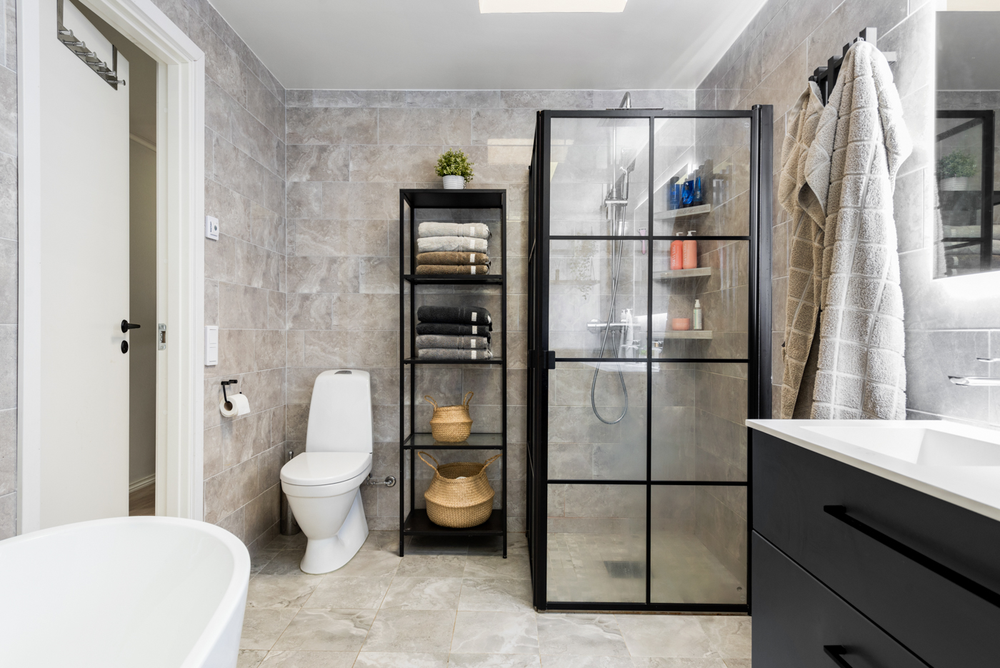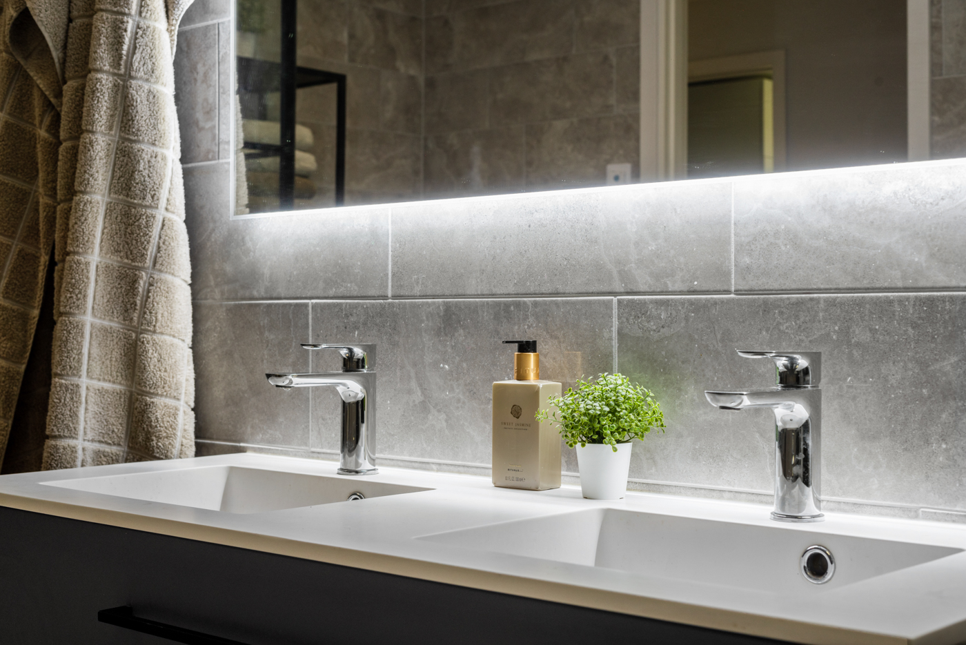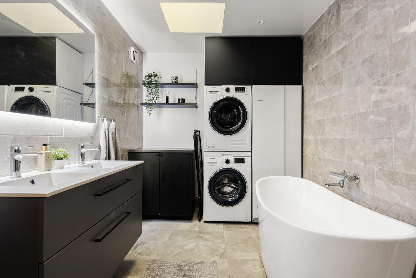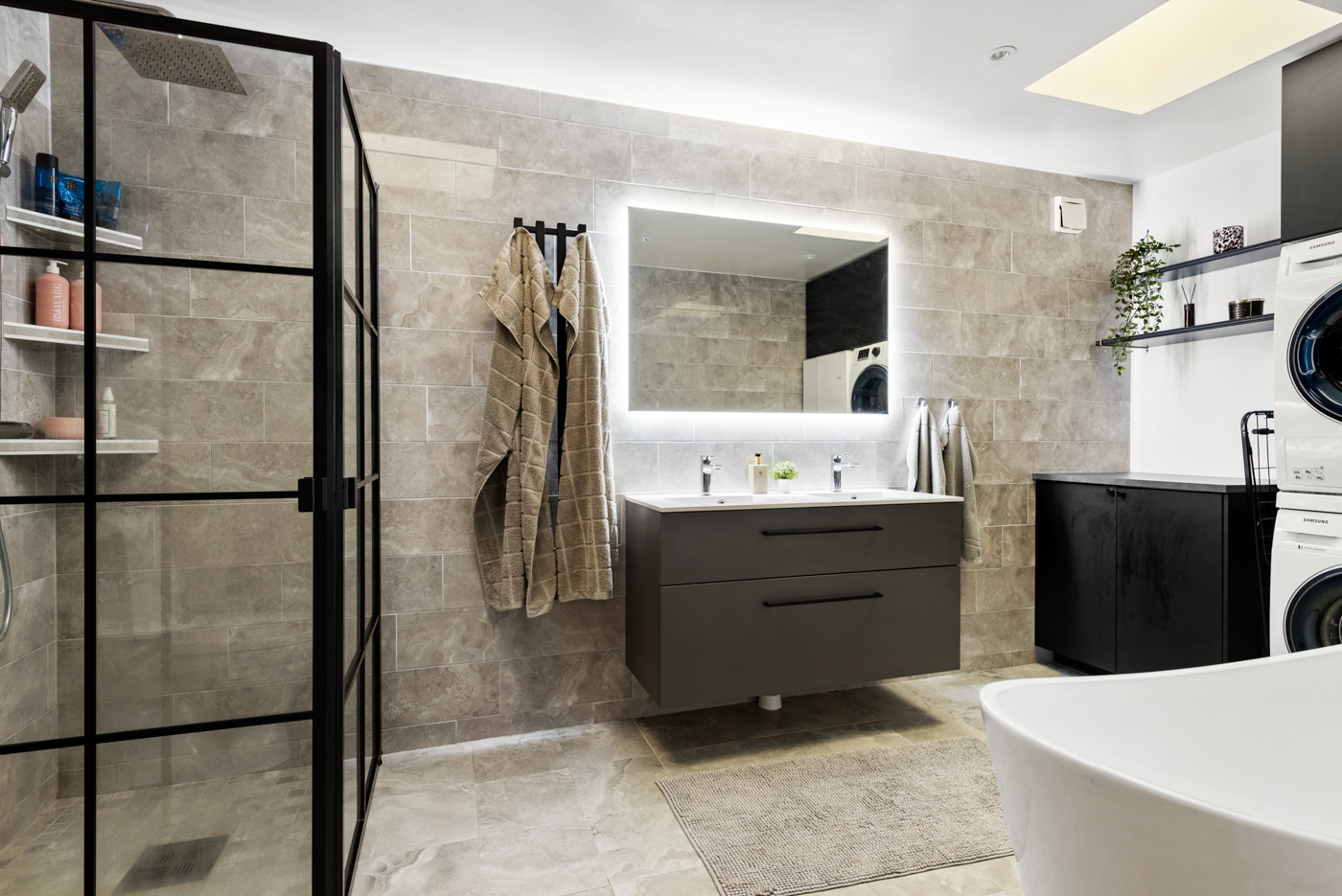 Exklusivt och lyxigt badrum med stor yta och både dusch och badkar! Väl valda materialval och ytskikt med stora och matchande klinker- och kakelplattor samt golvvärme. Takdusch bakom vikbara duschväggar i glas och en bred handfatskommod med två blandare. Stor spegel med inbyggd belysning. Här finns även en tvättdel med skåp och bänk och tvättmaskin och torktumlare. Här står även varmvattenberedaren och två takfönster ger behagligt ljusinsläpp.
