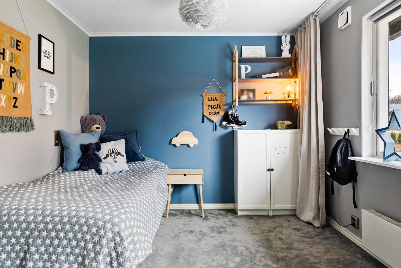Även detta sovrum är rymligt och är enkelt att inreda. Målade väggar och matchande heltäckningsmatta på golvet.