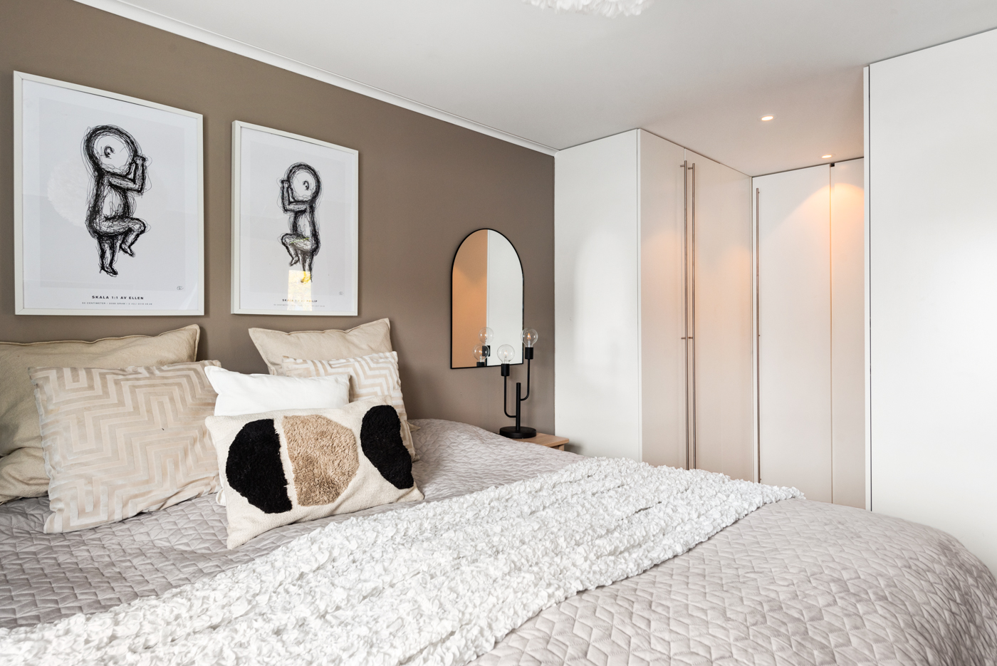 Rymligt sovrum som är enkelt att möblera. Här ryms dubbelsäng och övriga möbler som nattduksbord och byrå. Walk-in closet med infällda spotlights i taket och flera garderober ger extra förvaringsutrymme. Målade väggar med matchande heltäckningsmatta på golvet.
