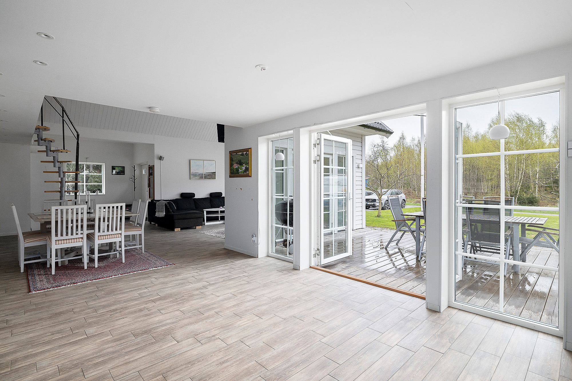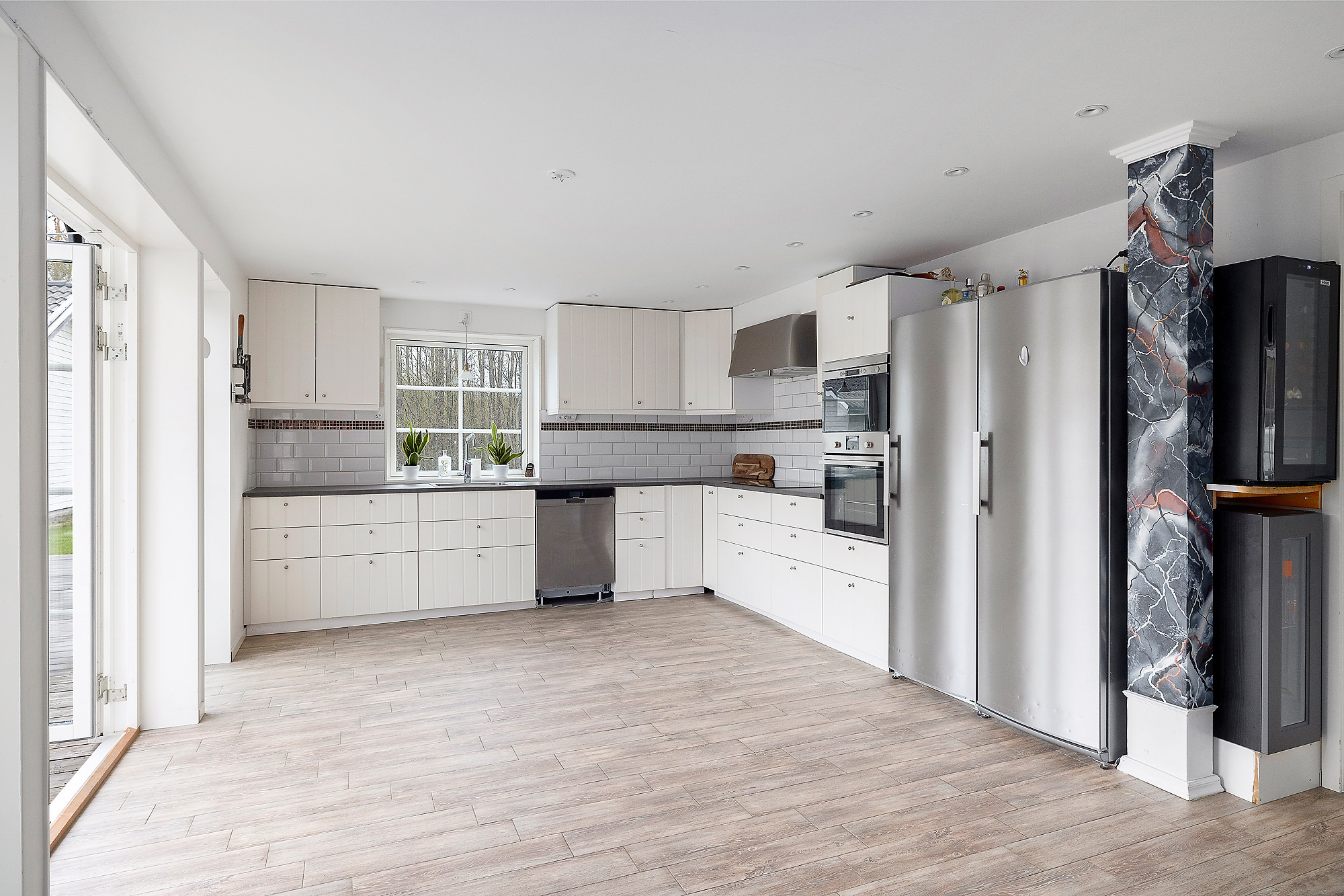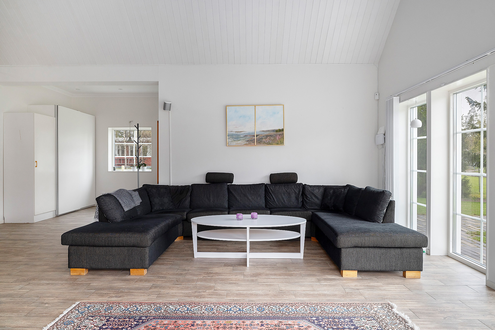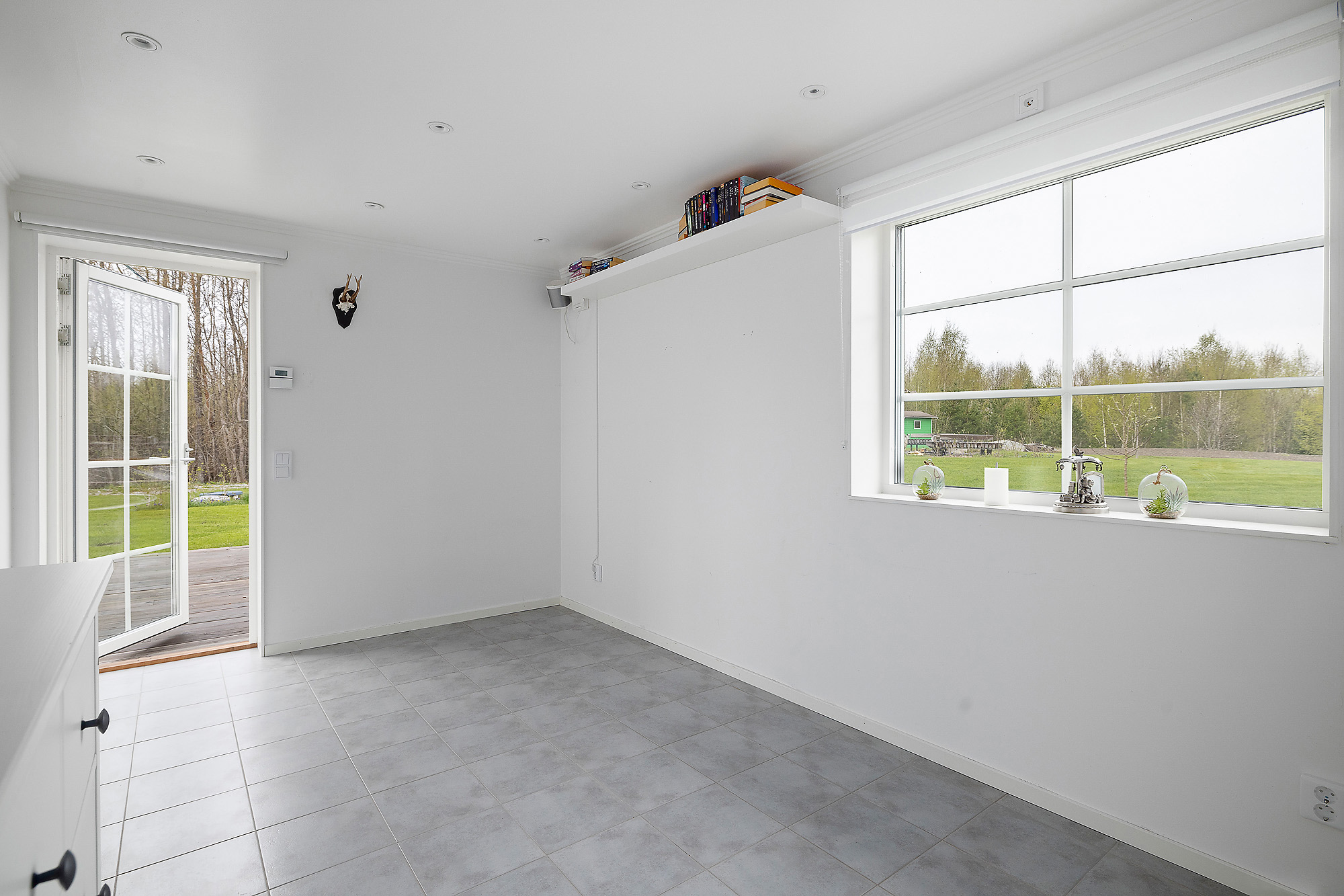 Här finns gott om stora fönsterpartier som verkligen bidrar med ljus och rymd till hela huset. Dubbeldörrar som leder ut till altanen. Även här klinkergolv med golvvärme samt vitmålade väggar.