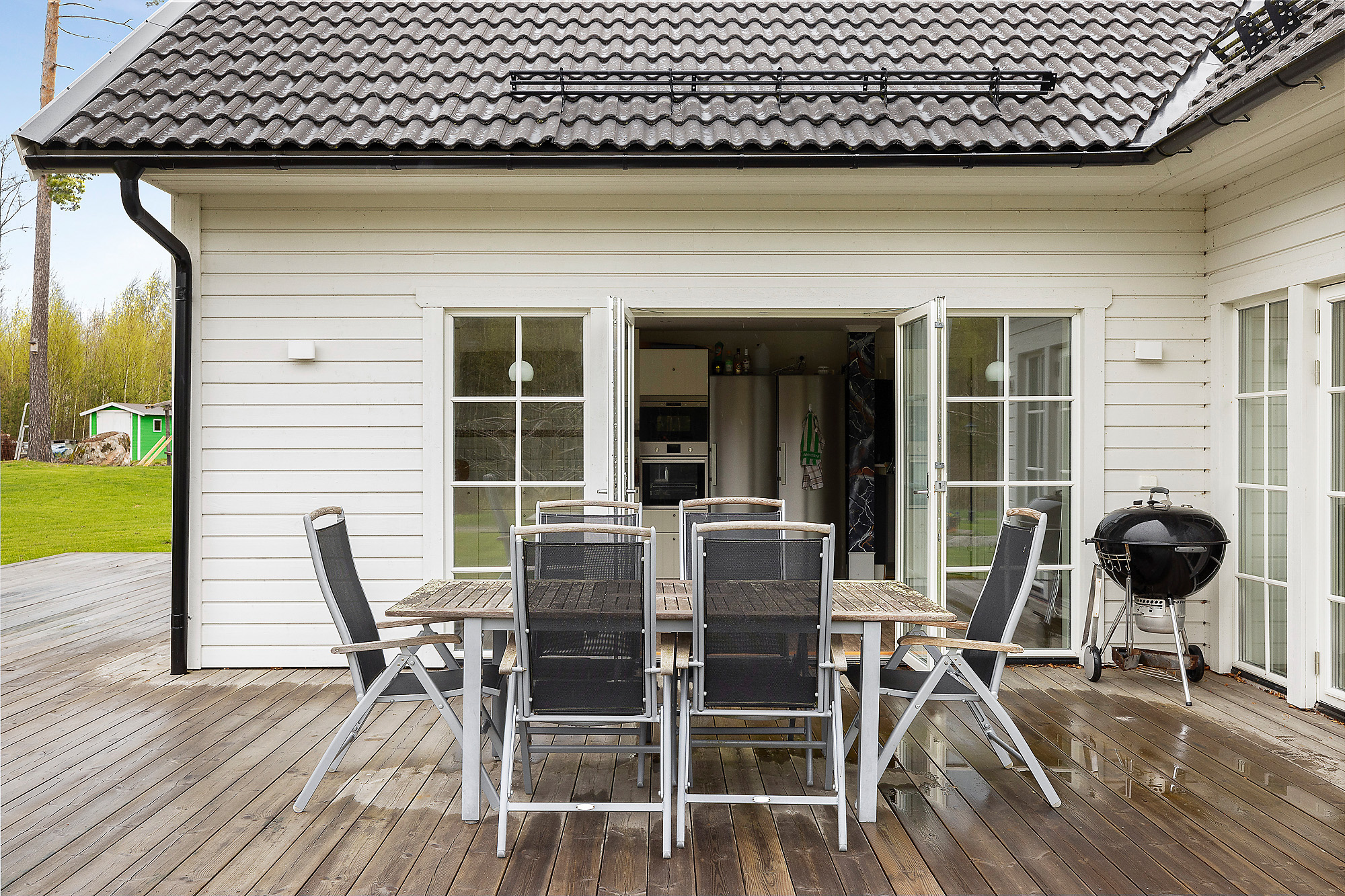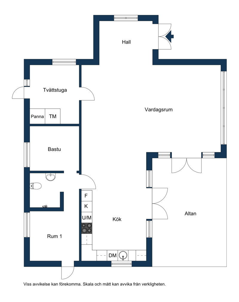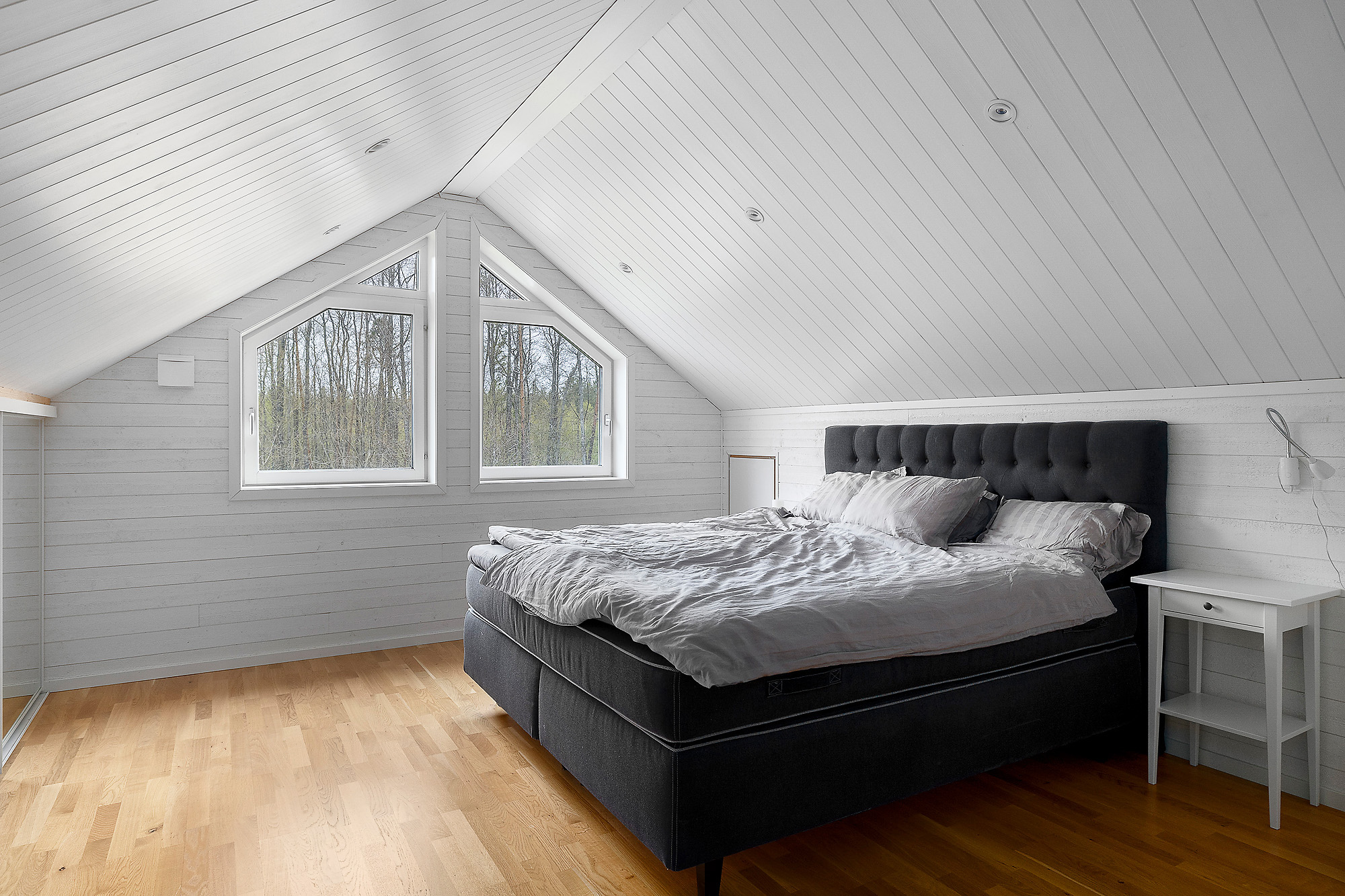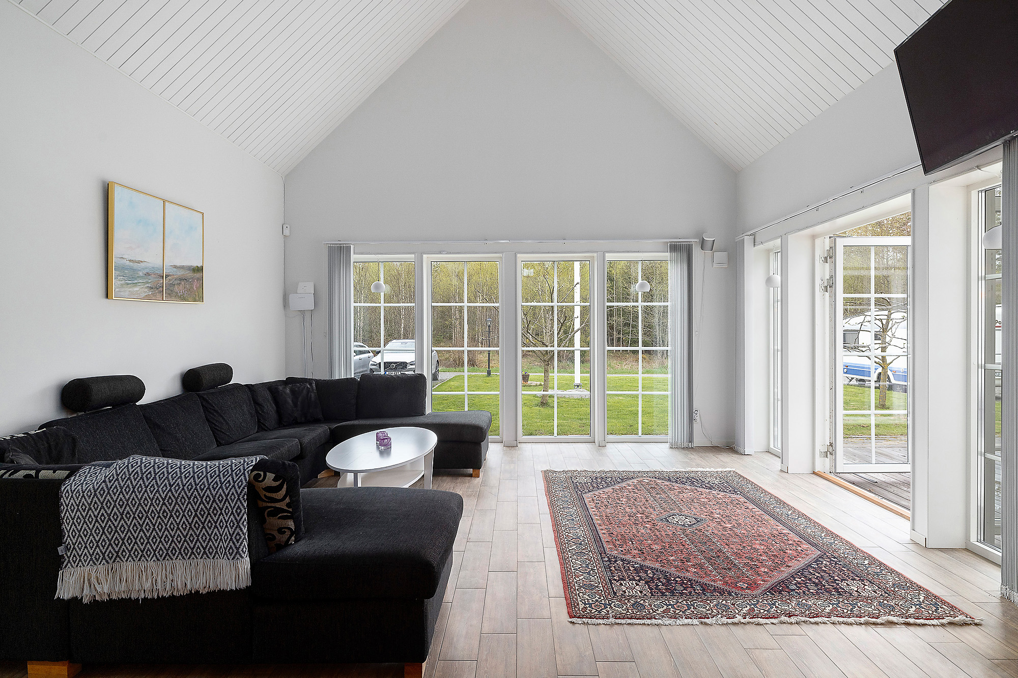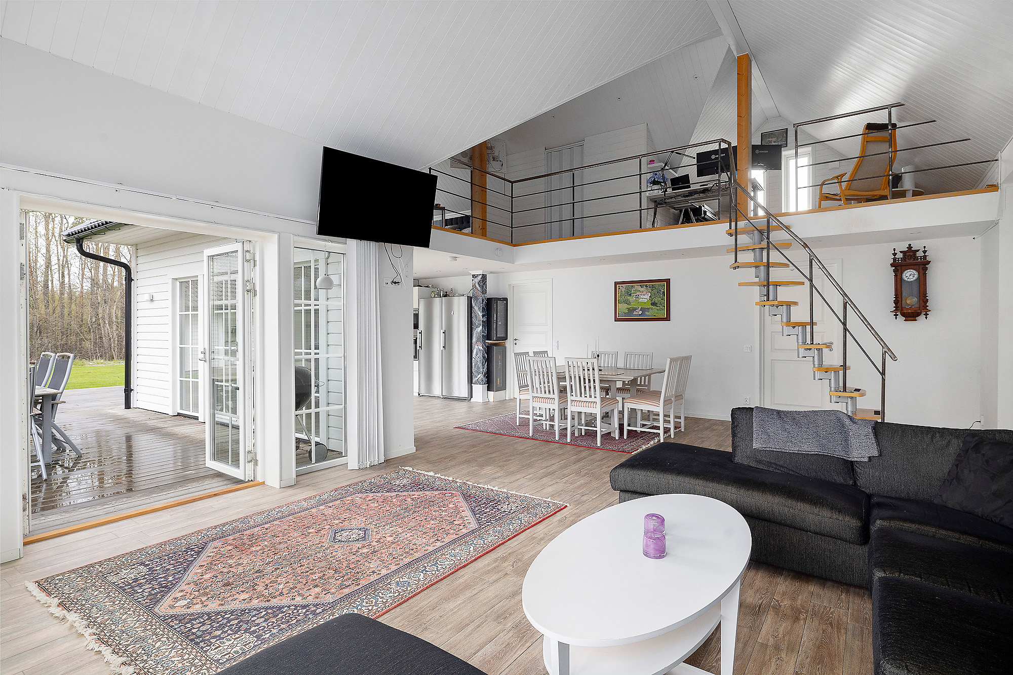 Här finns gott om stora fönsterpartier som verkligen bidrar med ljus och rymd till hela huset. Dubbeldörrar som leder ut till altanen. Även här klinkergolv med golvvärme samt vitmålade väggar.