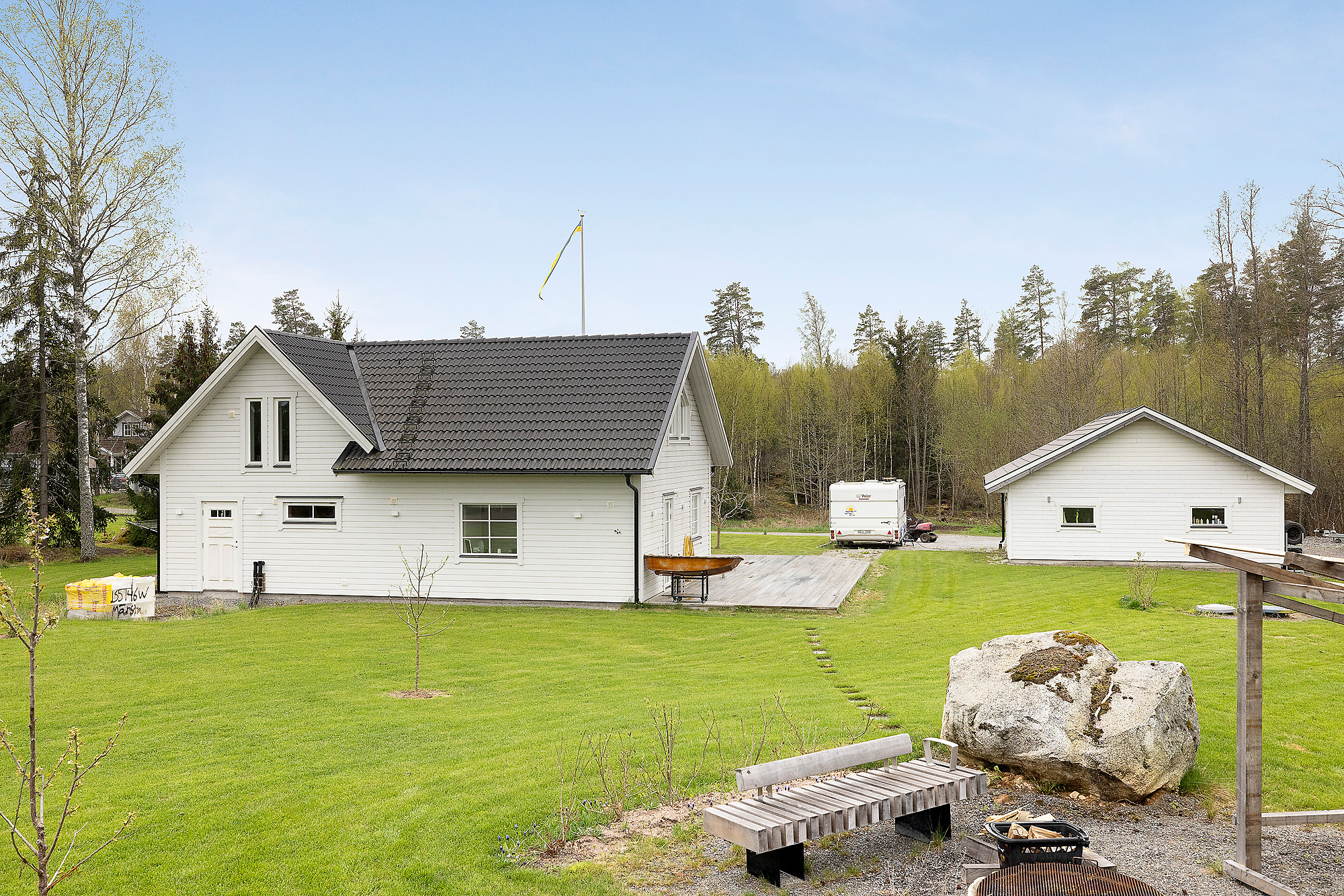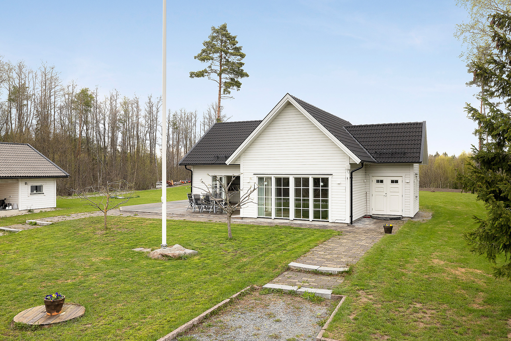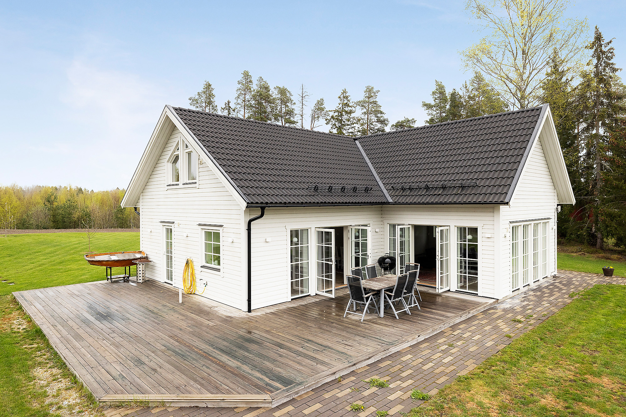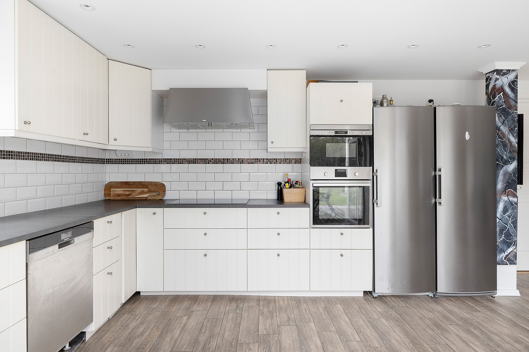 Här finns gott om stora fönsterpartier som verkligen bidrar med ljus och rymd till hela huset. Dubbeldörrar som leder ut till altanen. Även här klinkergolv med golvvärme samt vitmålade väggar.