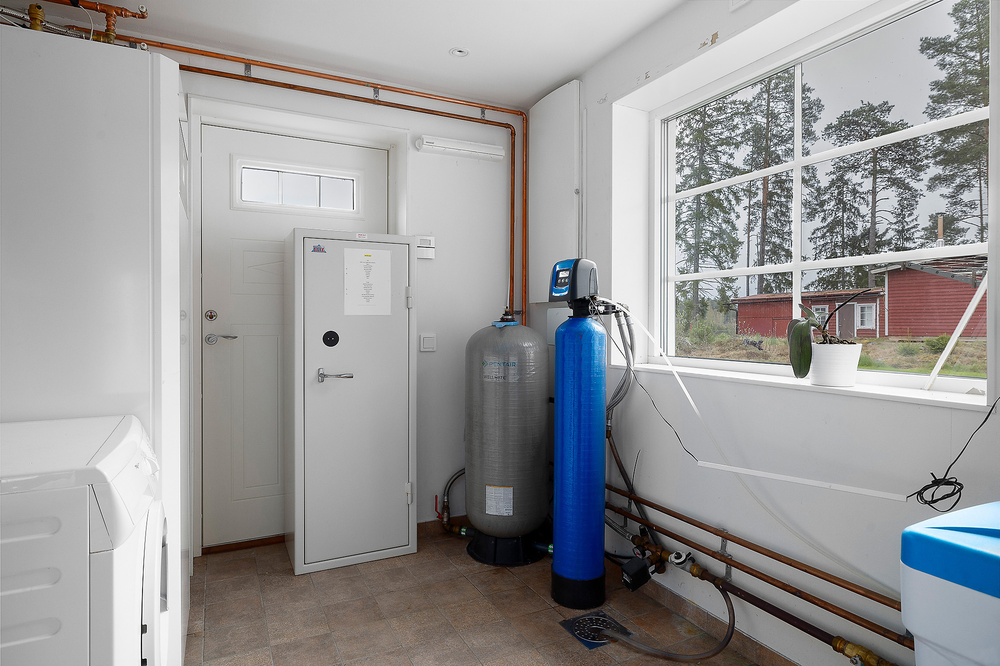 Tvättstuga med groventré. Klinkergolv och vitmålade väggar samt fönster. Här står även pannan. Tvättmaskin.