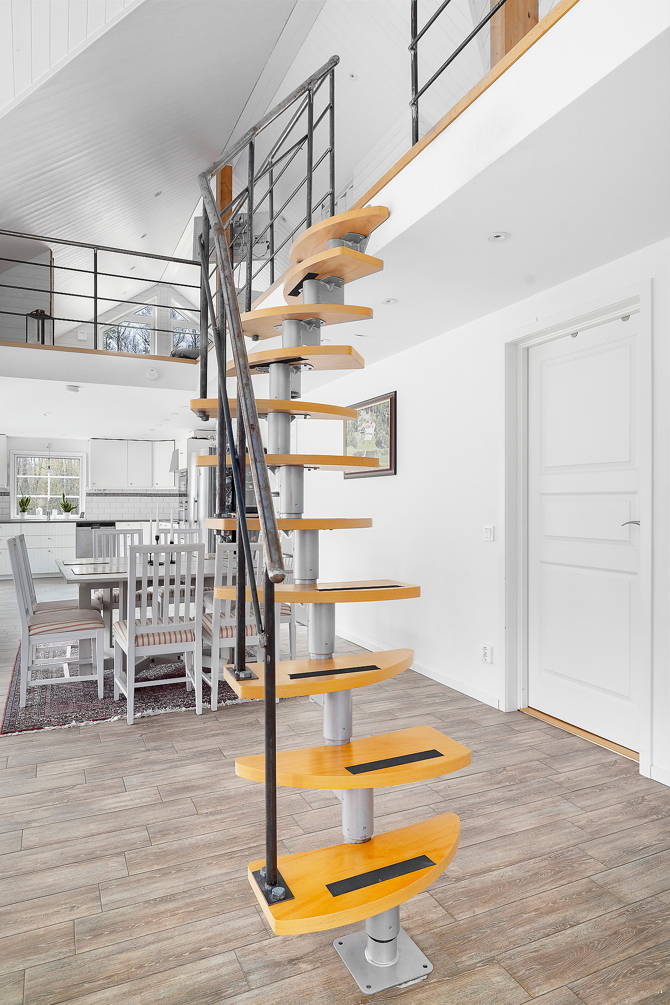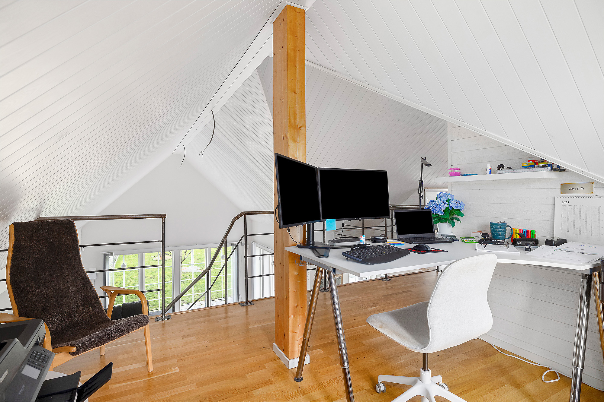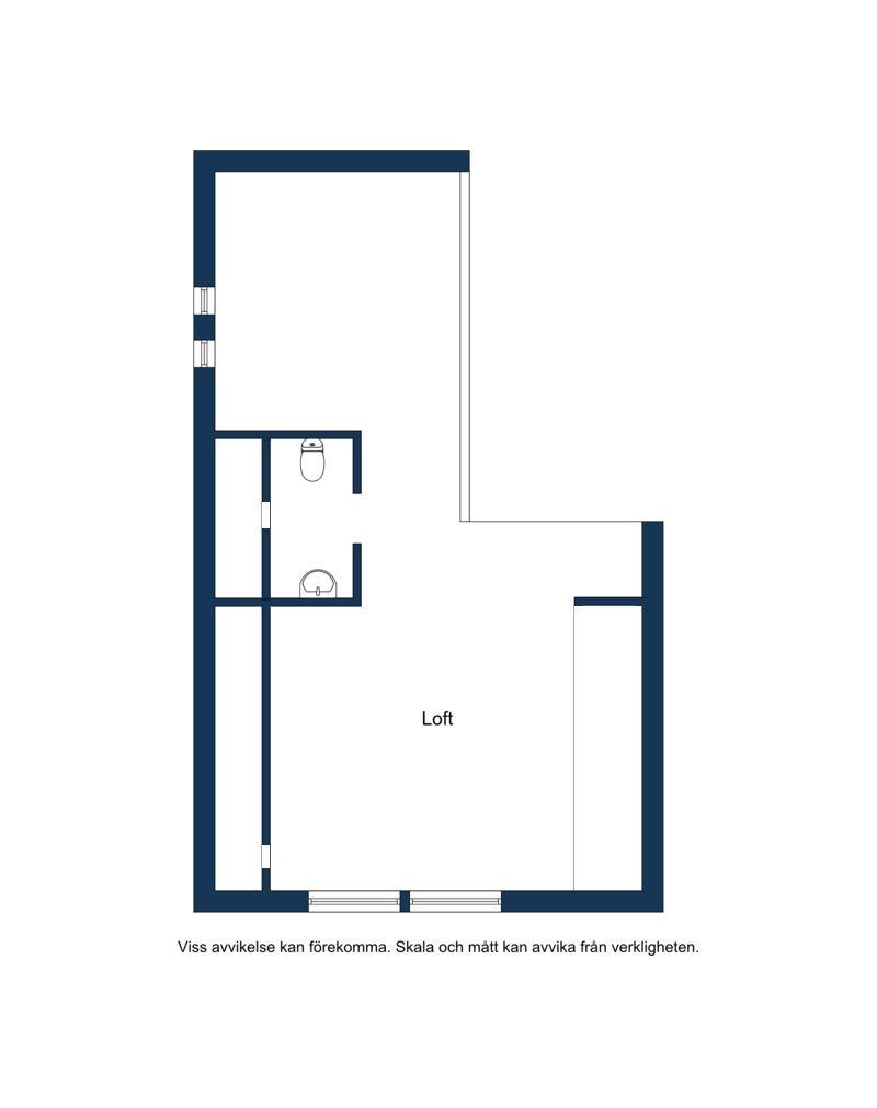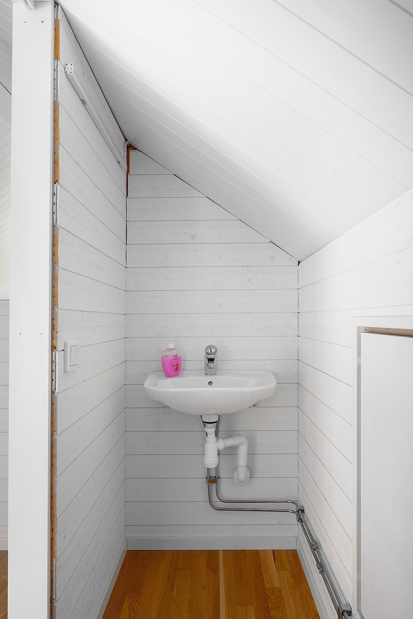 Loft med utrymme för t.ex. arbetshörna, sängplats mm. Här finns även en WC med handfat (WC:n är en kvarntoalett kopplad till reningsverket). Ekparkett på golvet och vitmålade väggar. Bra förvaringslösning längs långsidorna.