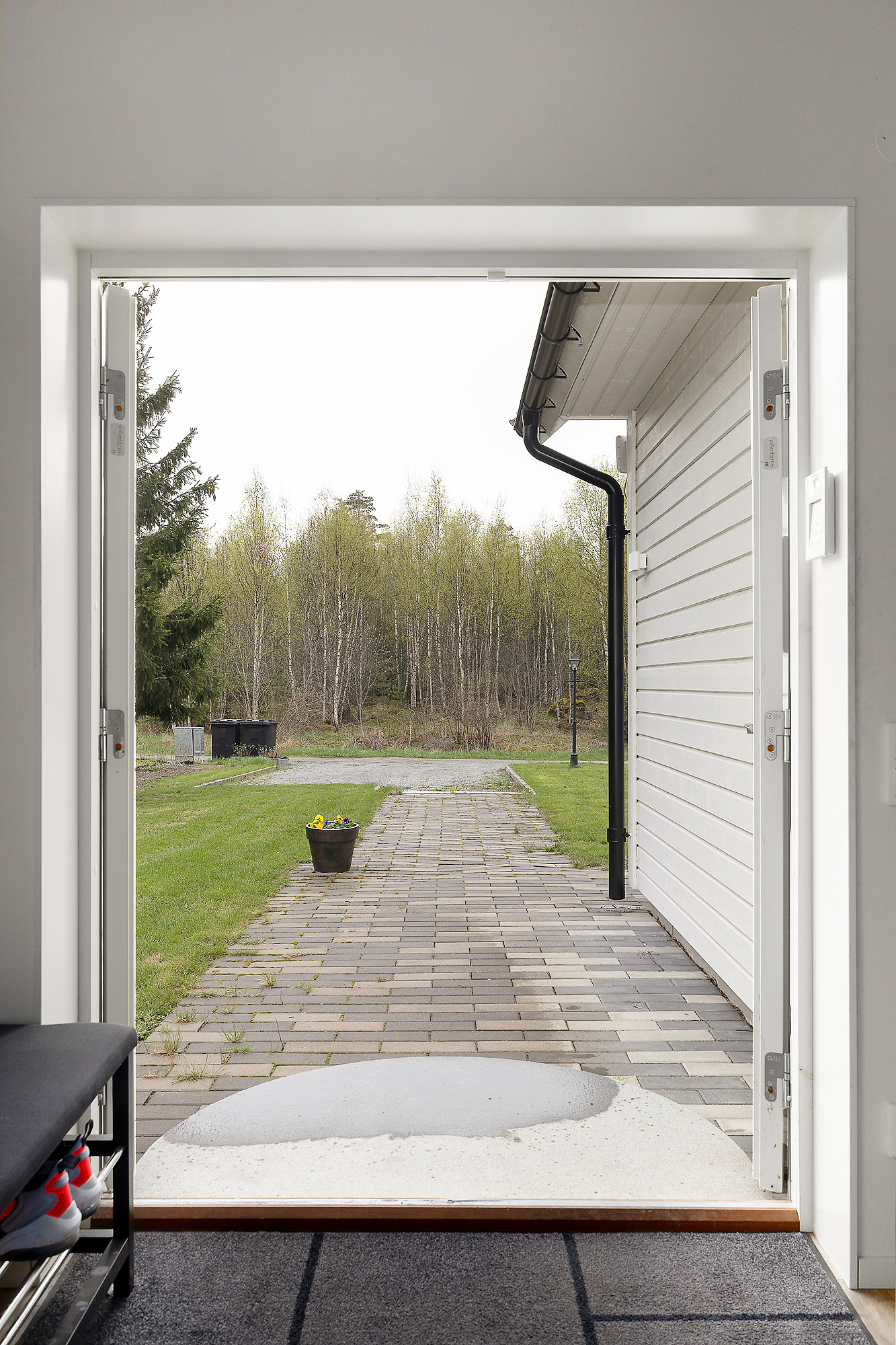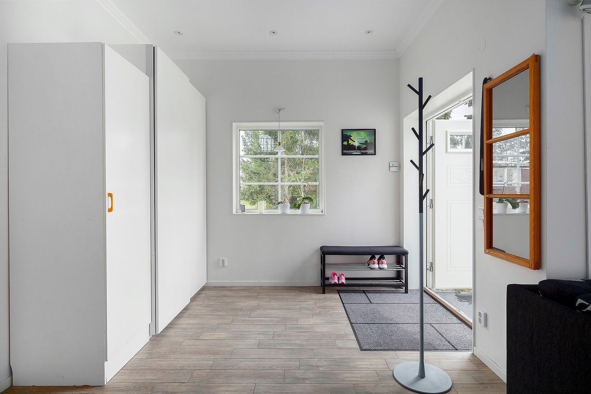 Luftig hall med gott om utrymme för möblering och klädavhängning. Vitmålade väggar och infällda spotlights i taket. Golvvärme och snyggt klinkergolv som går enhetligt in i vardagsrum och kök. Tak upp till nock.