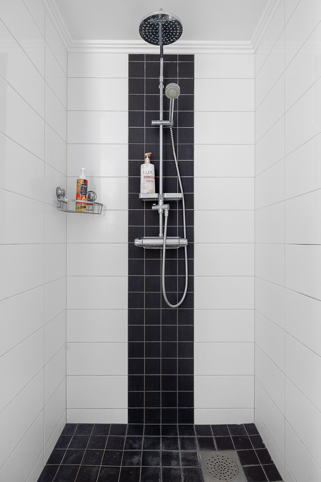 Duschdel med gott om utrymme. Handdukstork samt golvvärme. Handfatskommod med tillhörande förvaring samt badrumsskåp med spegelluckor ovan. Bastu med fönster mot baksidan.