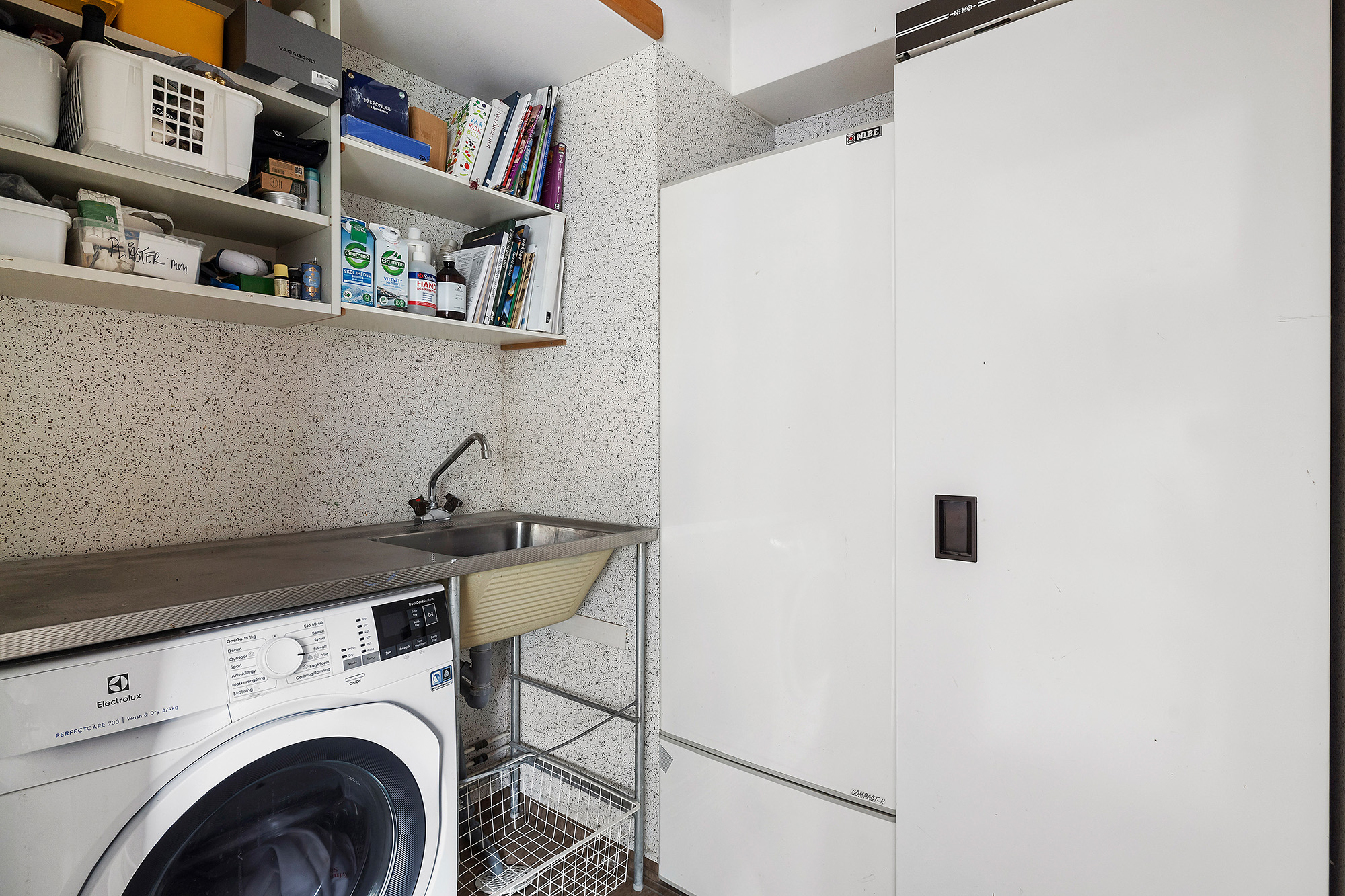 Tvättstuga med tvättho och skåp för förvaring. Kombimaskin och torkskåp (äldre torkskåp). Matta på golvet och tapet på väggarna. Här står även värmepannan.