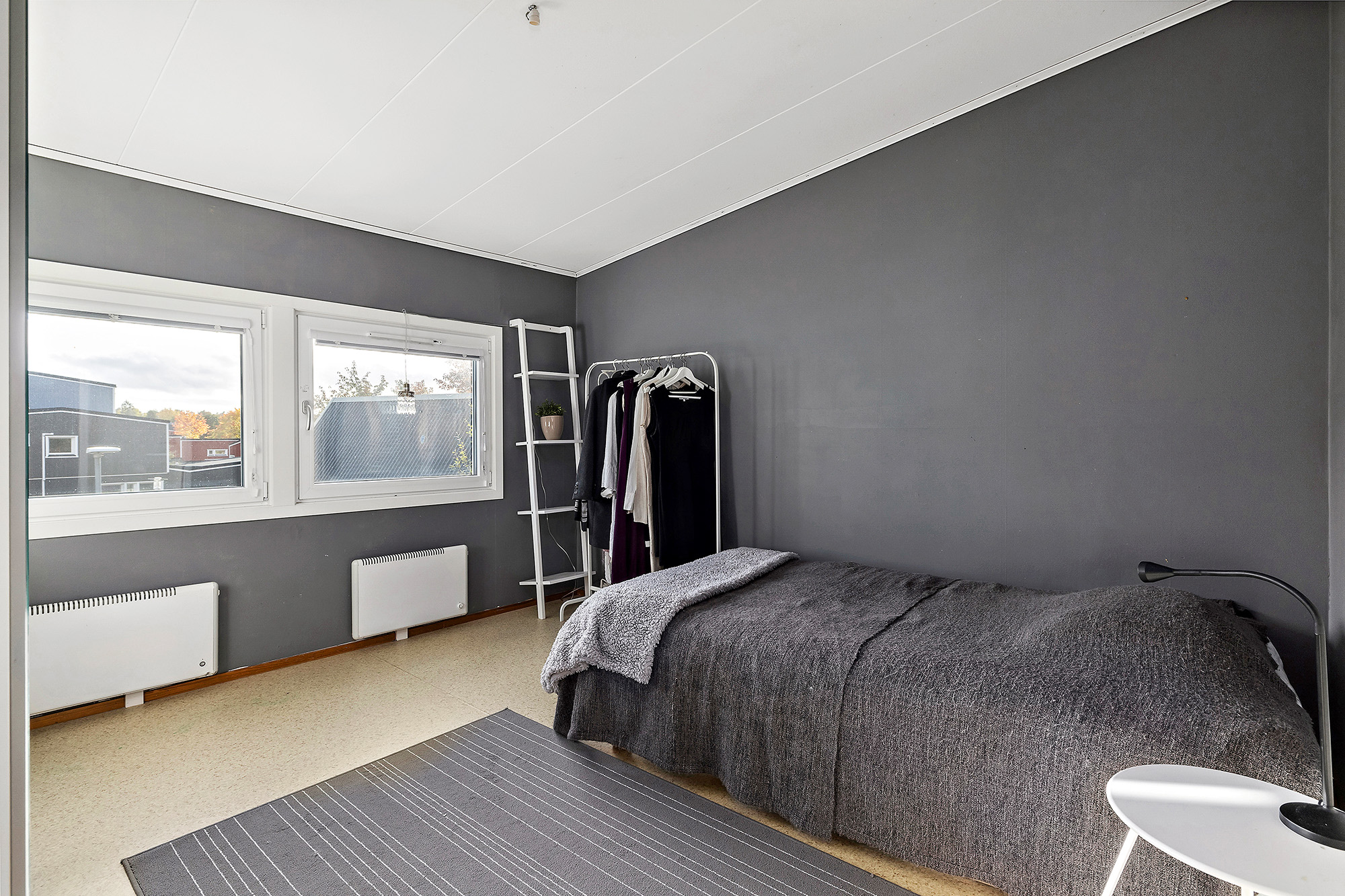 Målade väggar och matta på golvet. Här står en garderob.