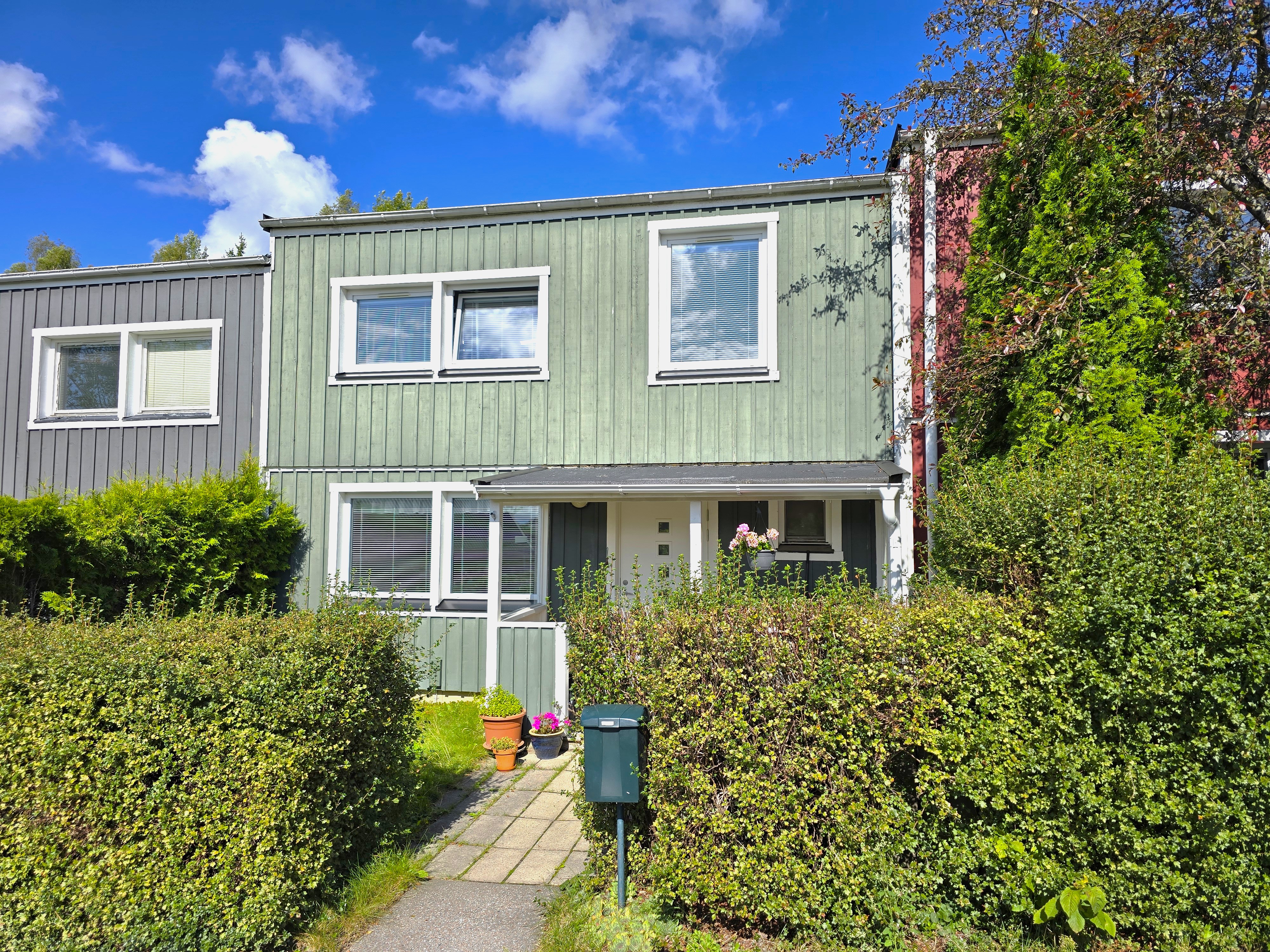 Målade väggar och matta på golvet. Här står 2 st garderober med spegeldörrar. Ingång till klädkammare.