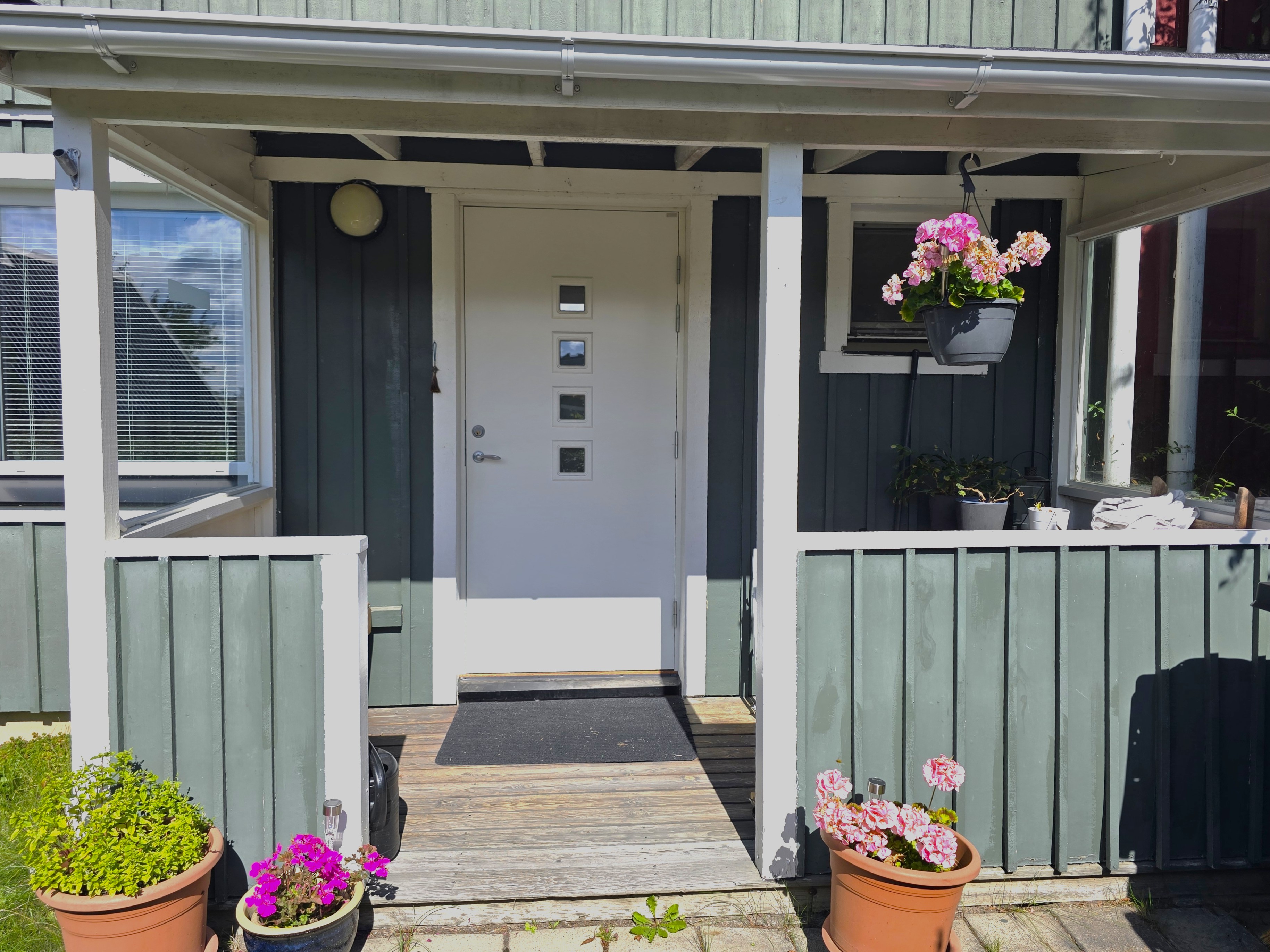 Målade väggar och matta på golvet. Ingång till klädkammare.