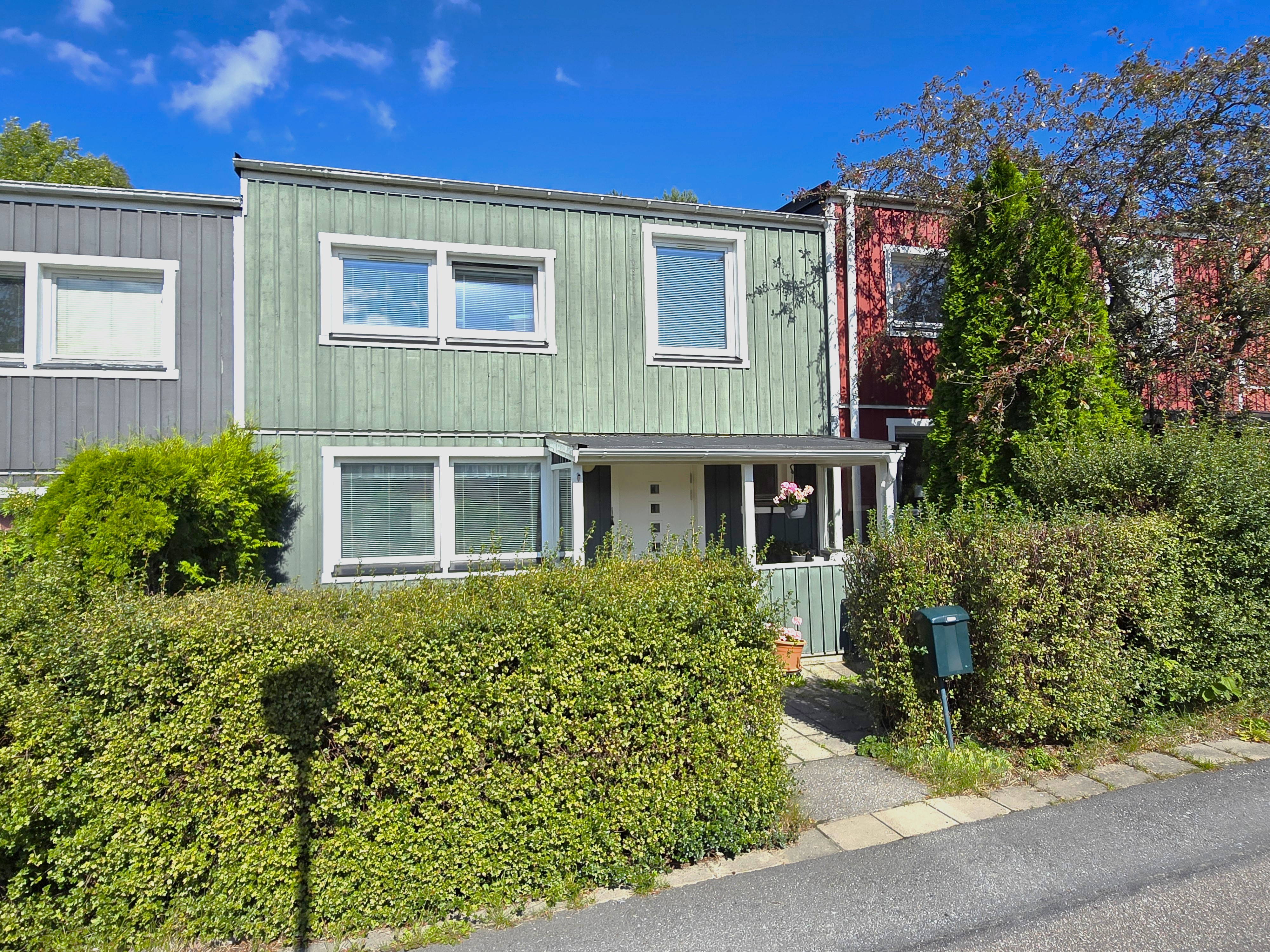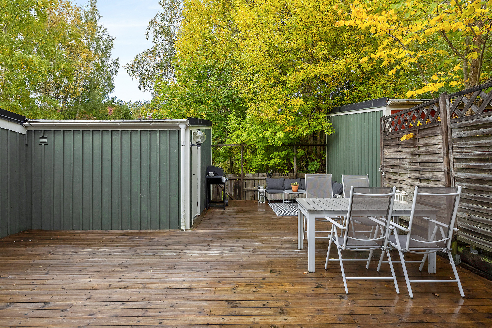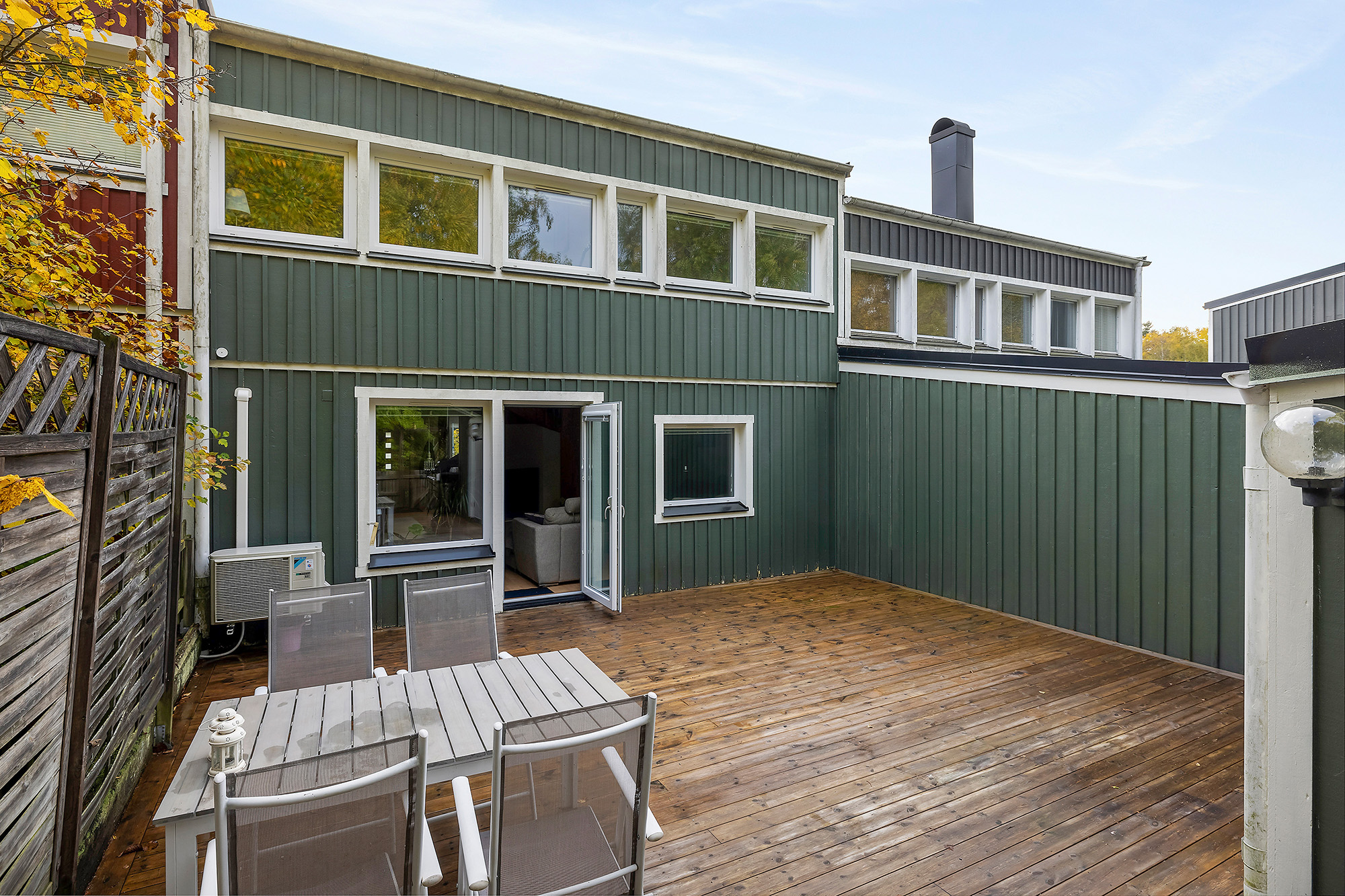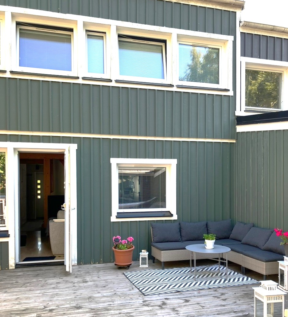 Rymligt vardagsrum som rymmer det mesta som soffgrupp och t.ex. extra matbord. Utgång till altan och uteplats mot allmänning. Trälaminat på golvet och ljusa tapeter på väggarna.