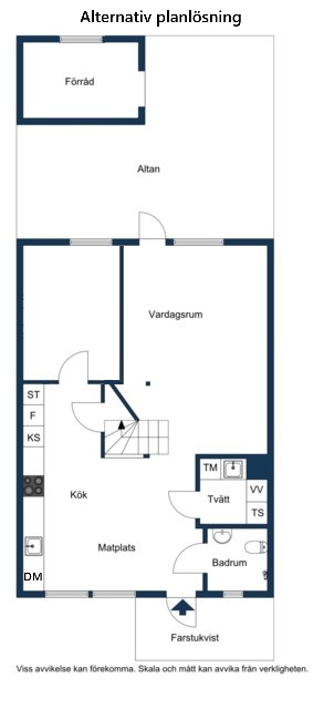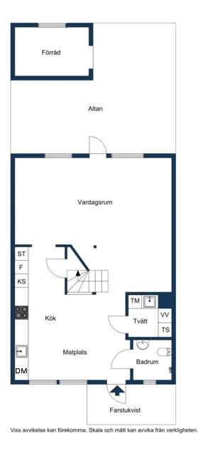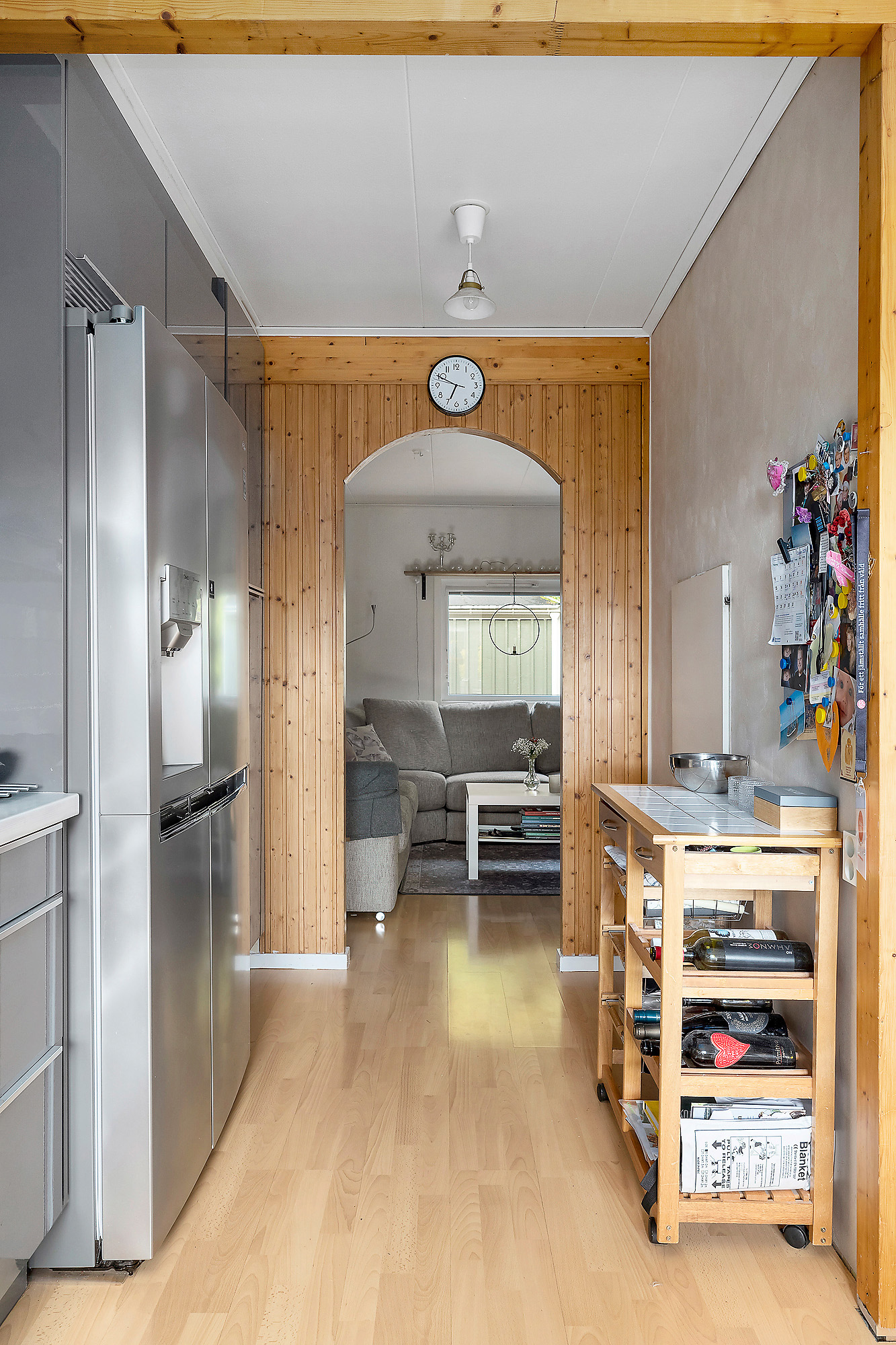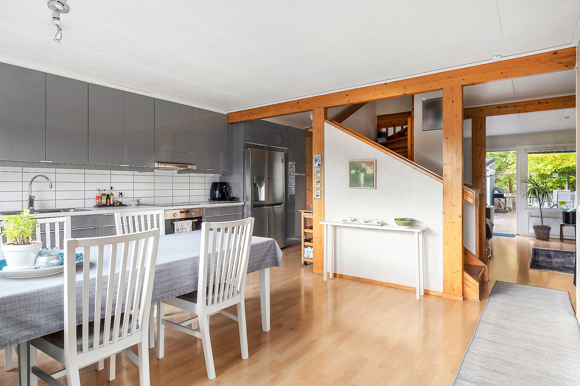 Stilrent Ikea-kök med flera skåp och lådor för förvaring. Integrerad diskmaskin, rostfri ugn, rostfri fläkt, induktionsspishäll, kyl och frys från 2022 med is- och vattenfunktion. Ljusa tapeter på väggarna och trälaminat på golvet. Litet förråd finns under trapp.