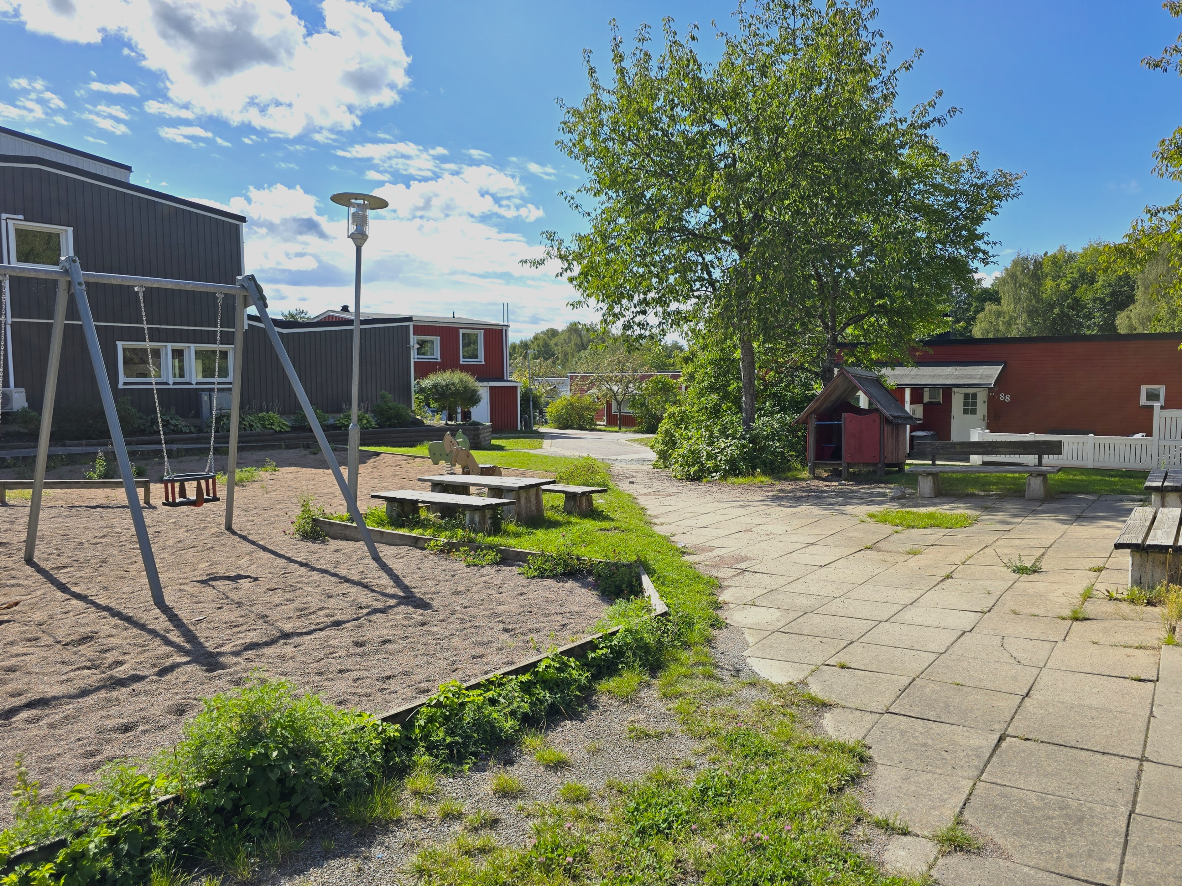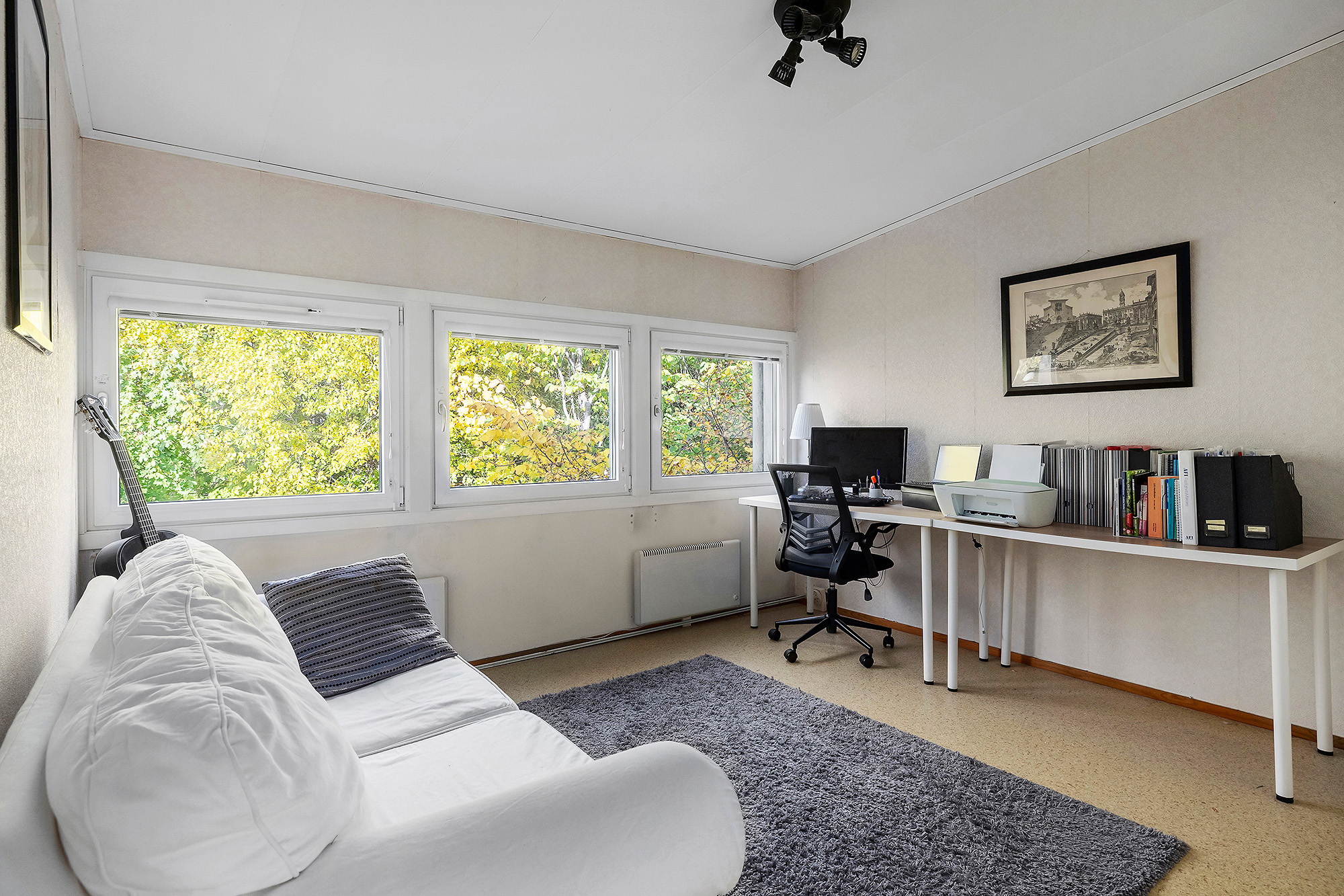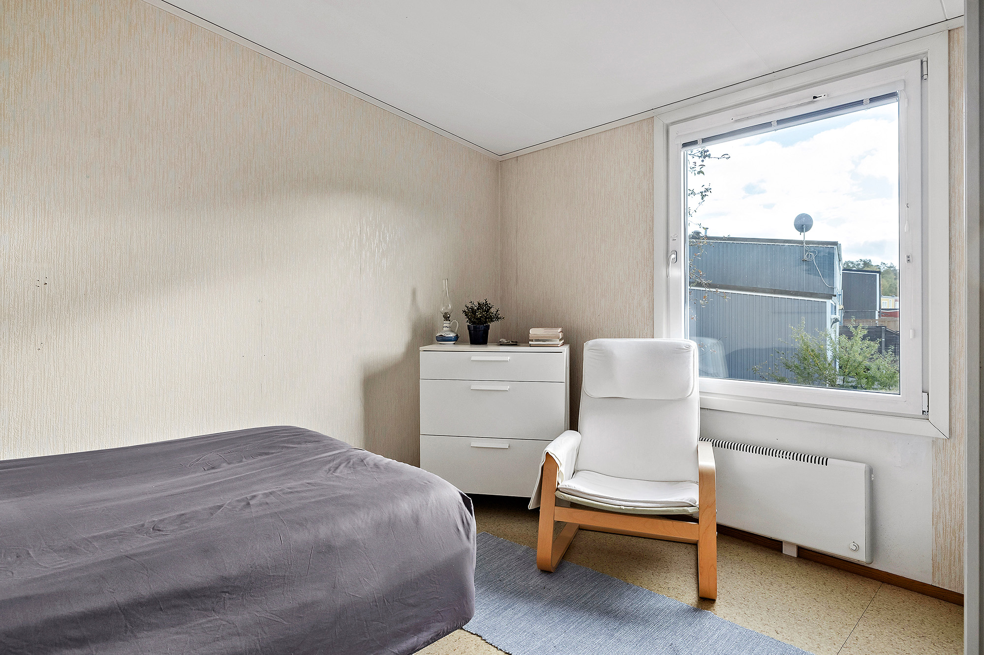 Allrum som även kan göras om till sovrum. Matta på golvet och tapetserade väggar.