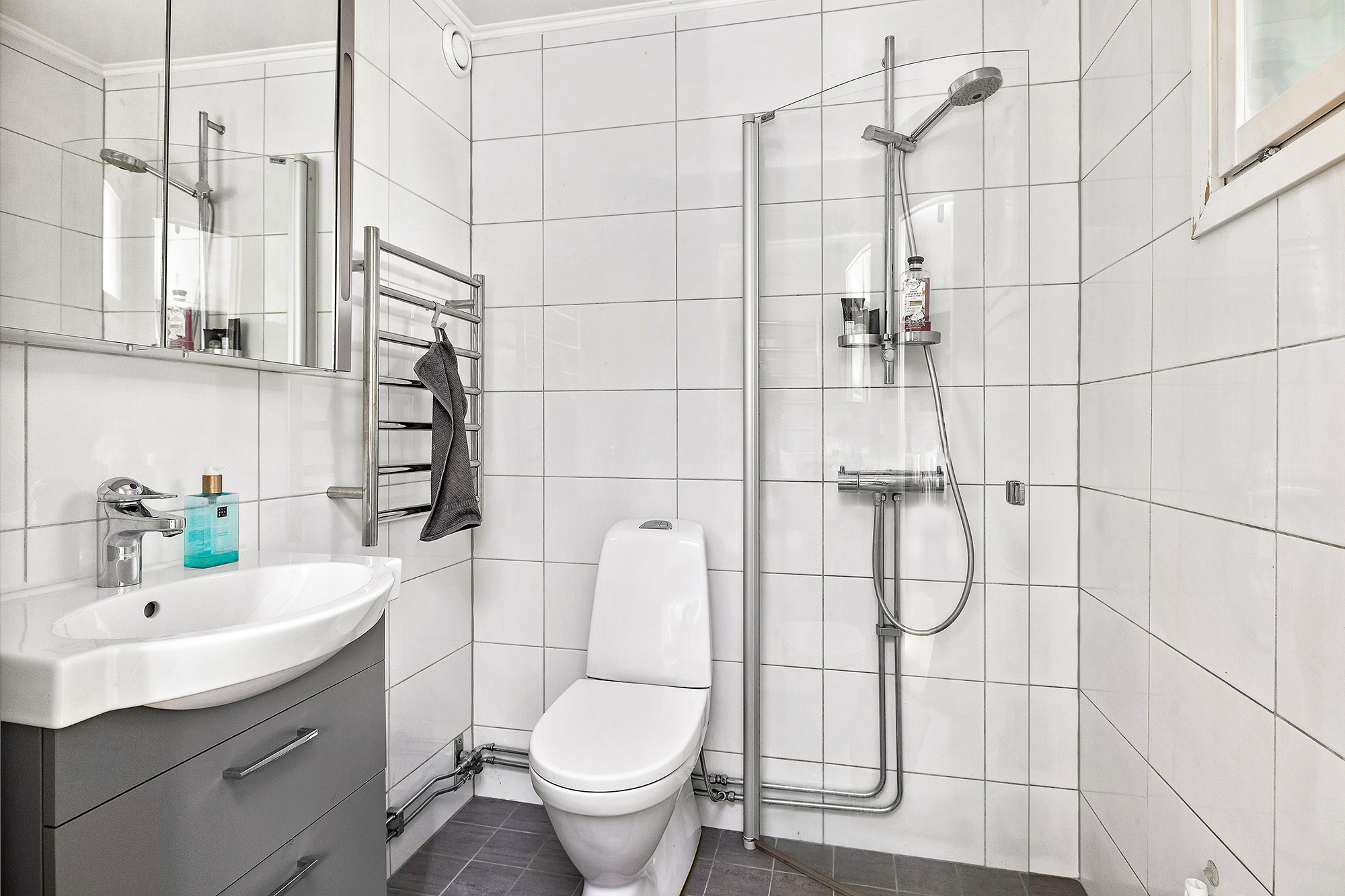 Modernt och stilrent badrum med golvvärme och uppvärmd handdukstork. Handfatskommod med tillhörande förvaring och badrumsskåp med spegelluckor ovan. Ett fönster ger extra ljusinsläpp och vädringsmöjlighet. Infällda spotlights i tak.