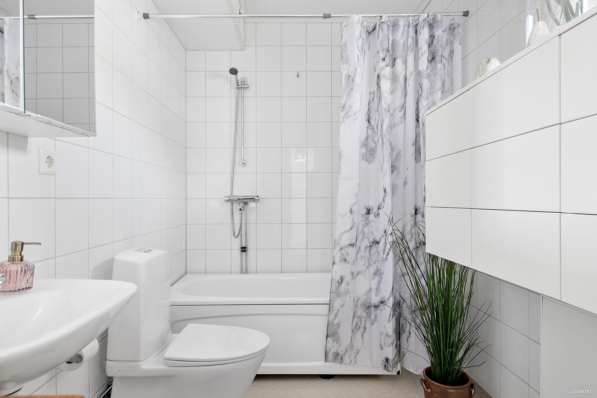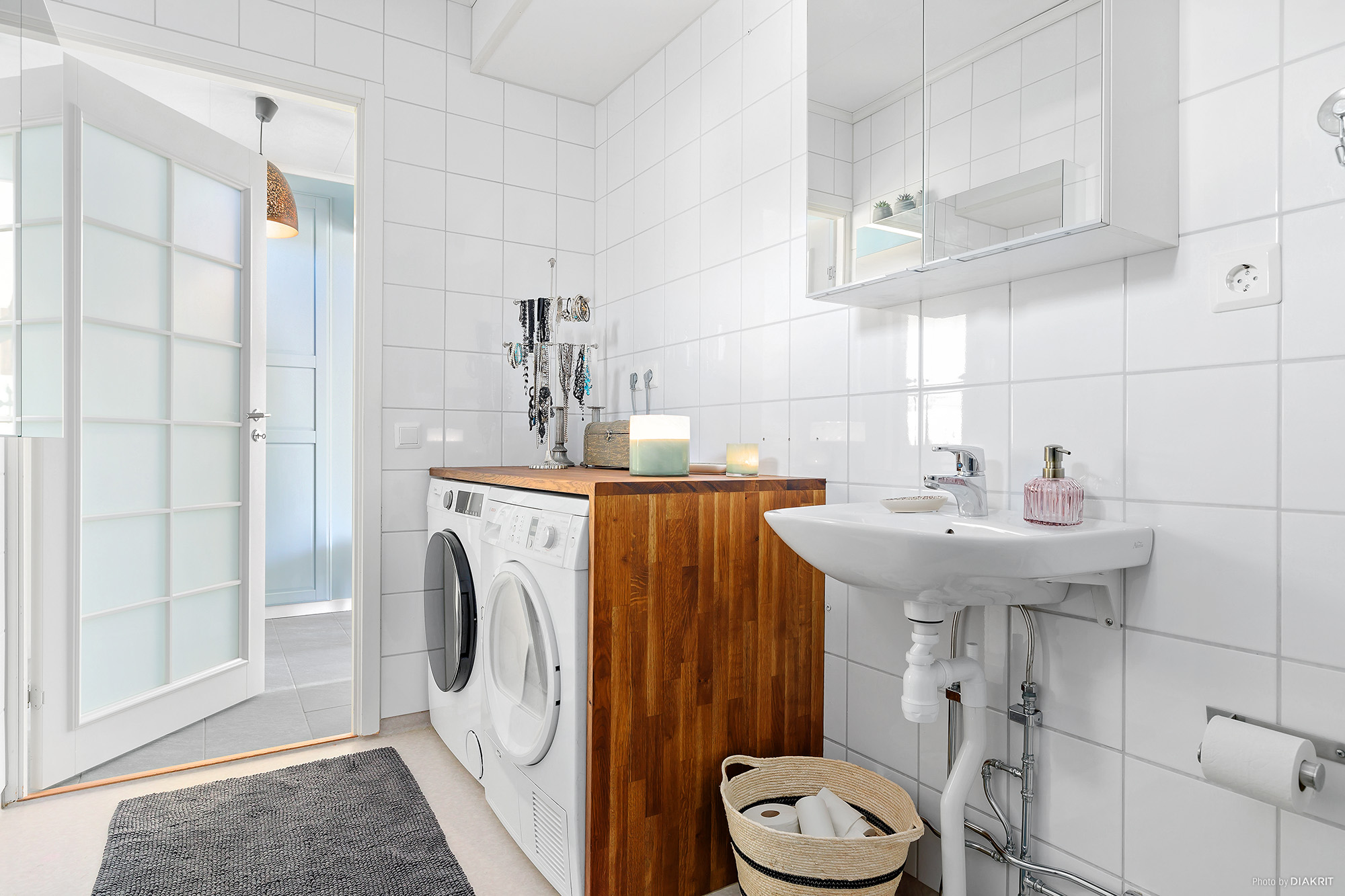 Rymligt och funktionellt badrum med egen tvättdel. Här finns även ett litet fönster som ger extra ljus och vädringsmöjlighet. Badkar, ny wc-stol, handfat med spegelskåp samt handdukshängare. Tvättdel med tvättmaskin och arbetsbänk. De finns även extra skåp för förvaring. Vitt kakel på väggarna och ljus matta på golvet. Ny frostad dörr till badrummet som ger extra ljusinsläpp.
