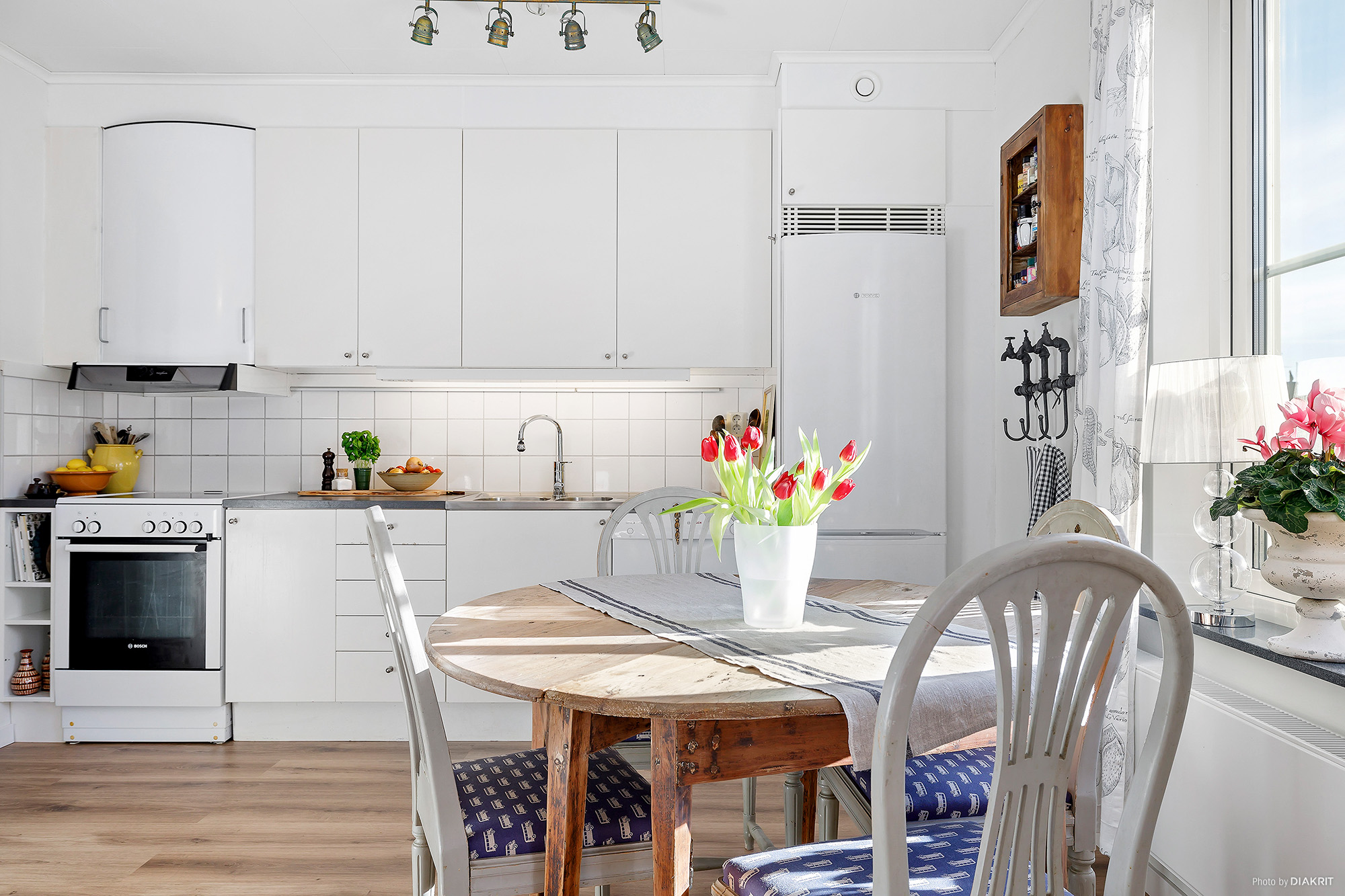Ljust och trivsamt kök med öppen planlösning mot vardagsrum med utgång till en stor balkong i söder. Köket går i vitt med vitt kakel ovanför bänkskivan som är i rostfritt och laminat. I köket finner du spis från 2024 med ugn, fläkt, kombinerad kyl/frys samt diskmaskin. Vitmålade väggar och nytt laminatgolv.