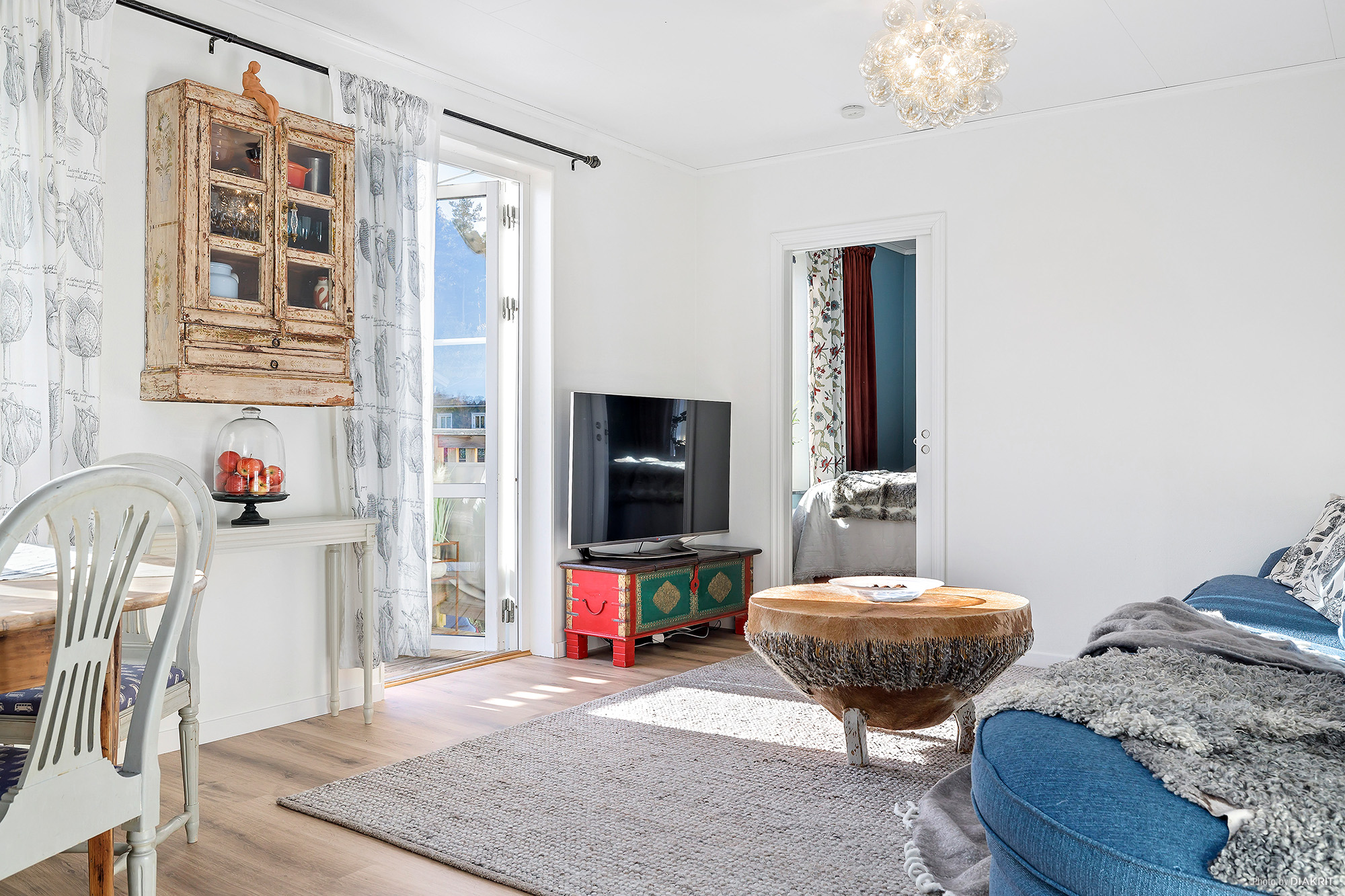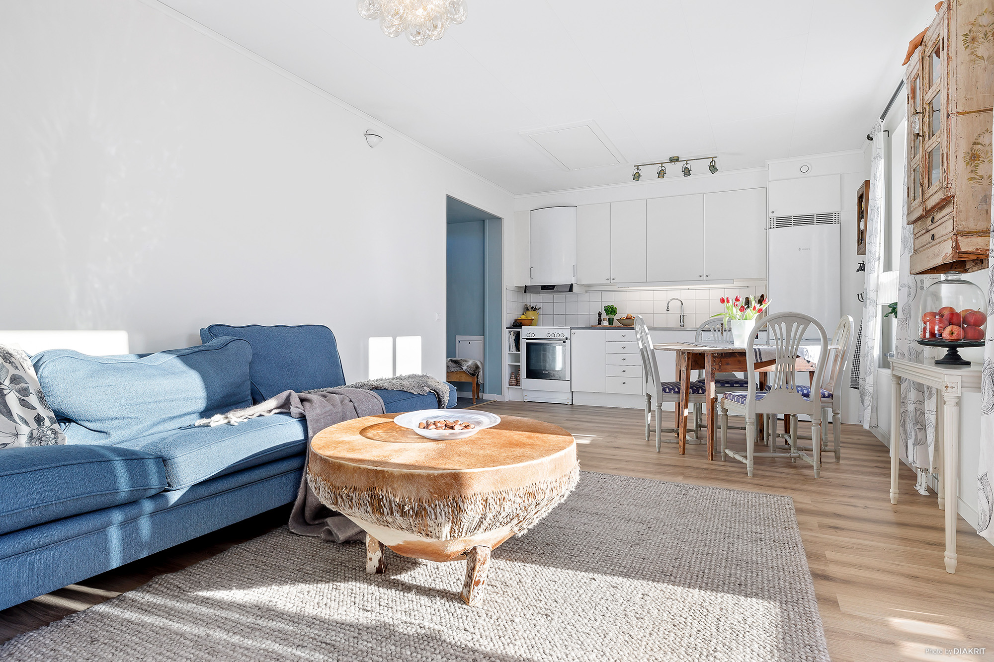 Vardagsrum med öppen mot köket vilket ger härlig rymd och ljus från flera fönster och balkongen. Vitmålade väggar och nytt laminatgolv.