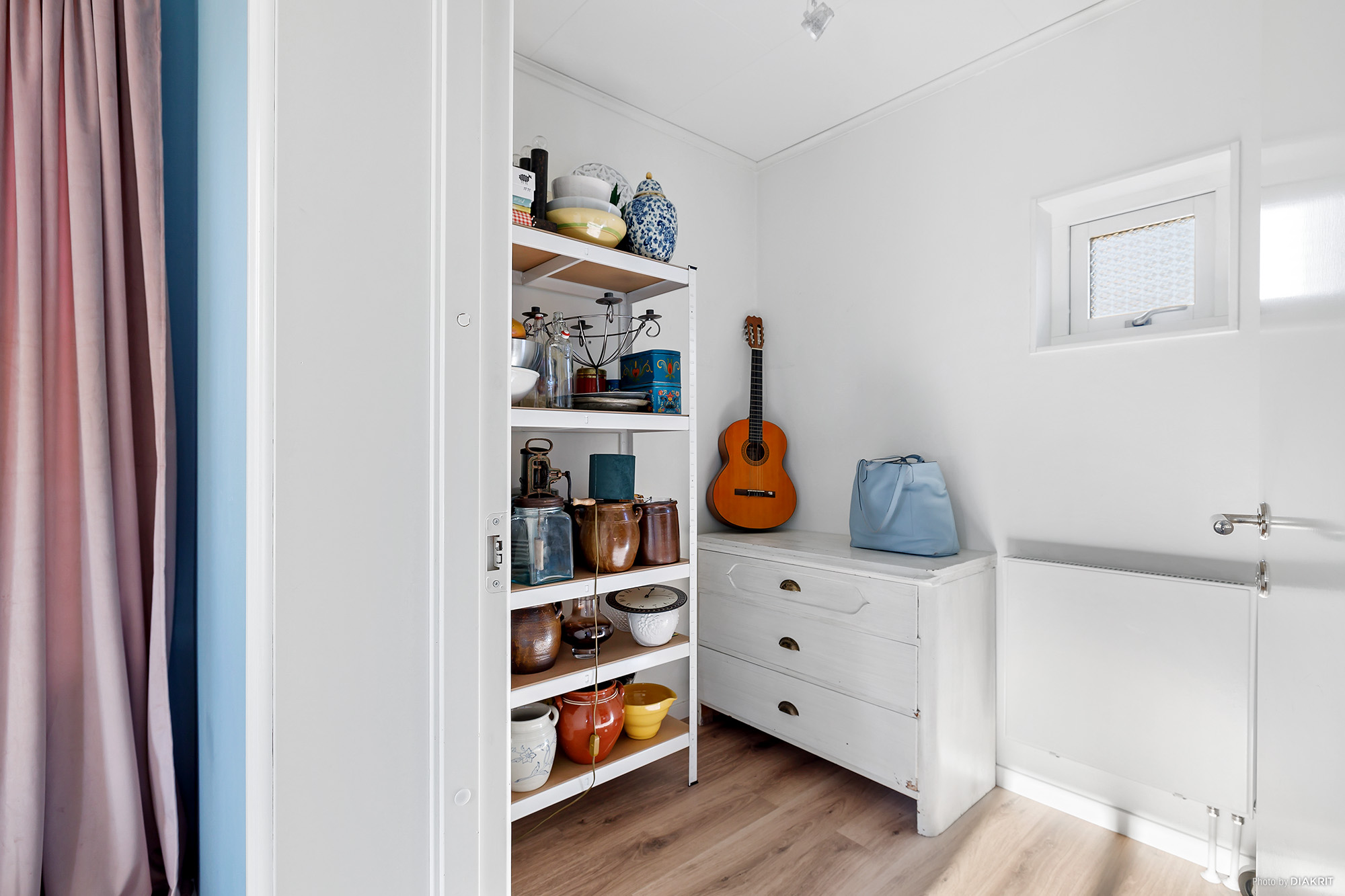 Rymlig klädkammare som med fördel kan användas till kontor eller ett litet barnrum då rummet har fönster. Vitmålade väggar och nytt laminatgolv.