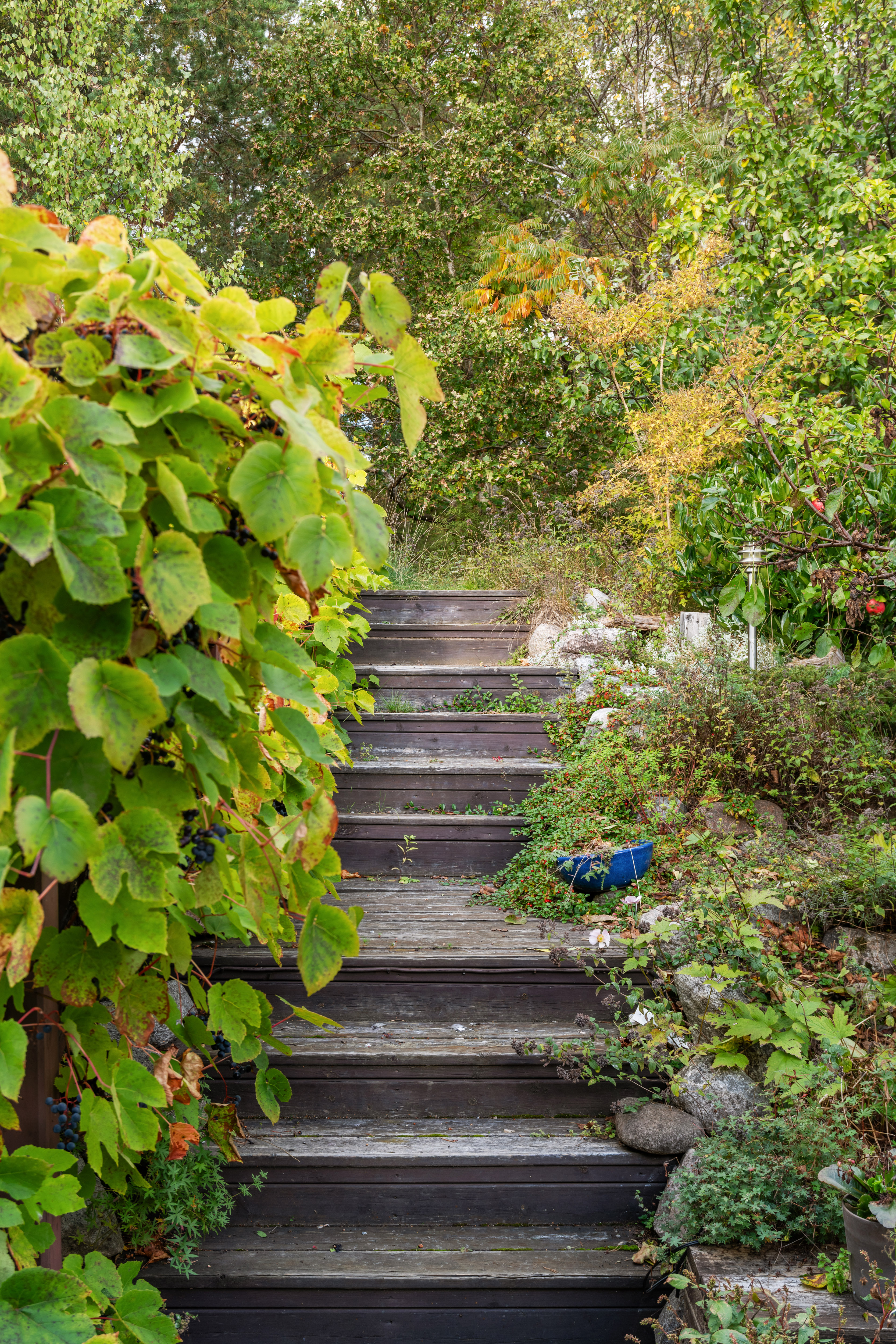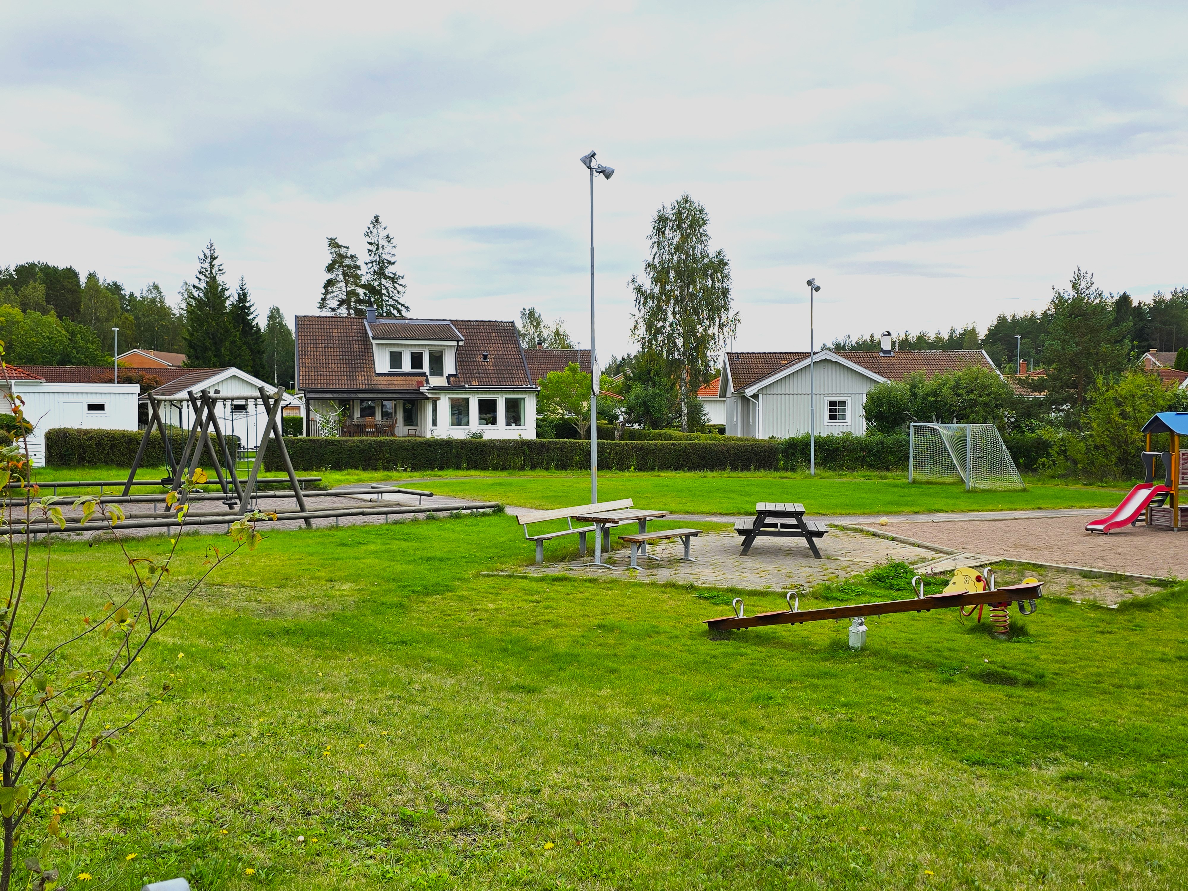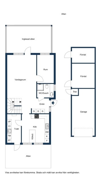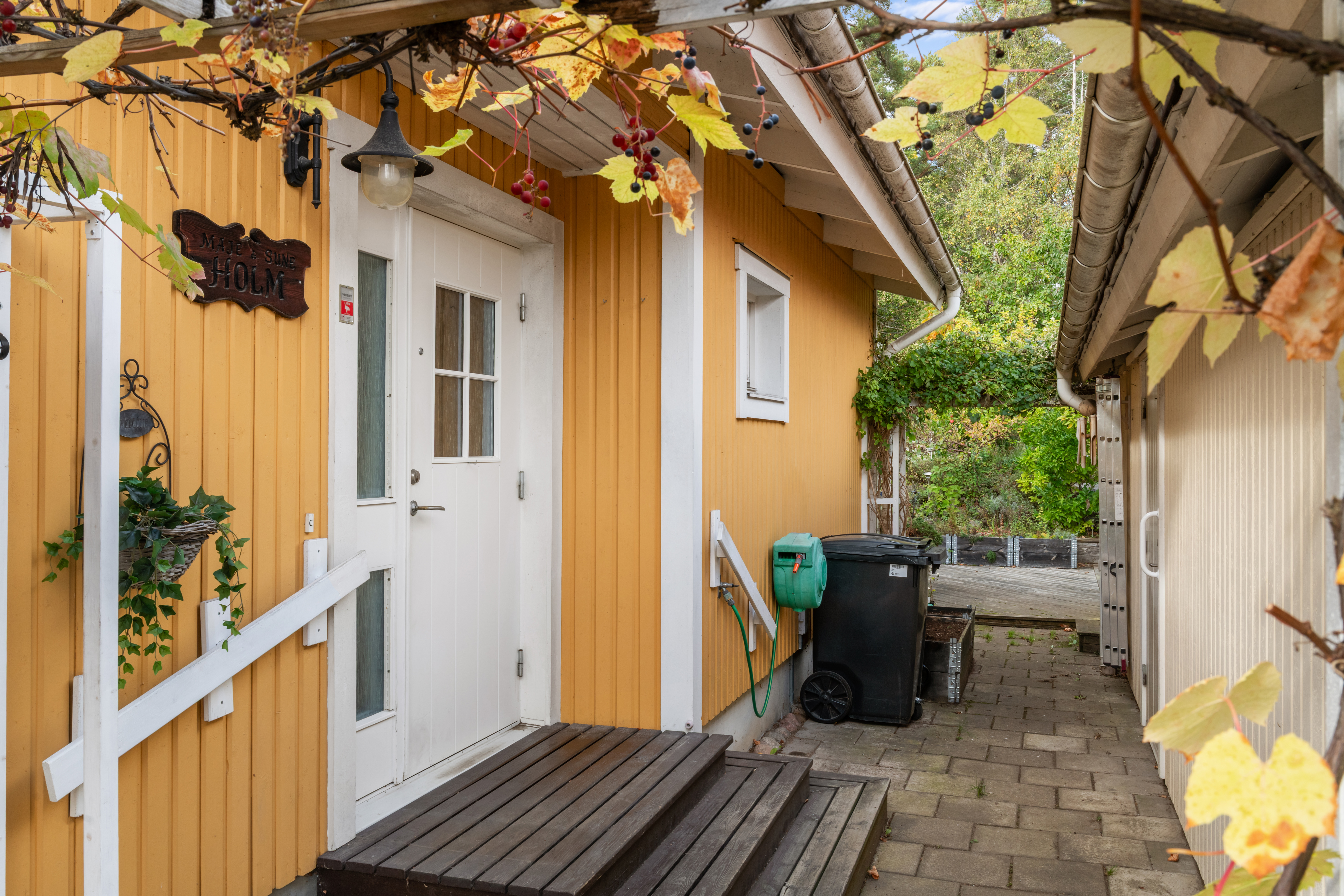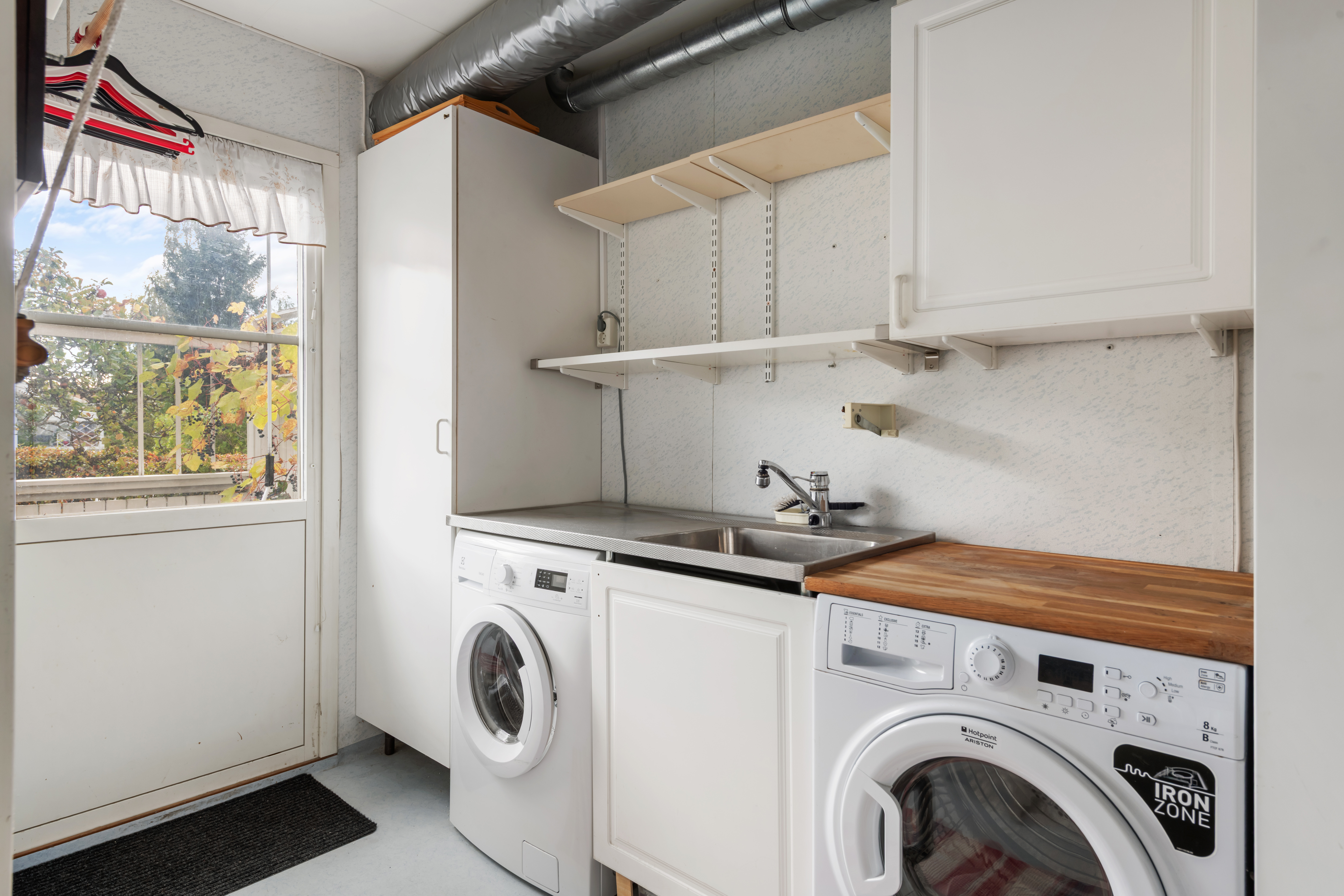 Även tvättstugan är trivsam och praktisk med skåp och hyllplan för förvaring, samt tvättmaskin och torktumlare. Tvättho och groventré till framsidan och uteplats. Matta poå golvet och ljus tapet på väggarna.
