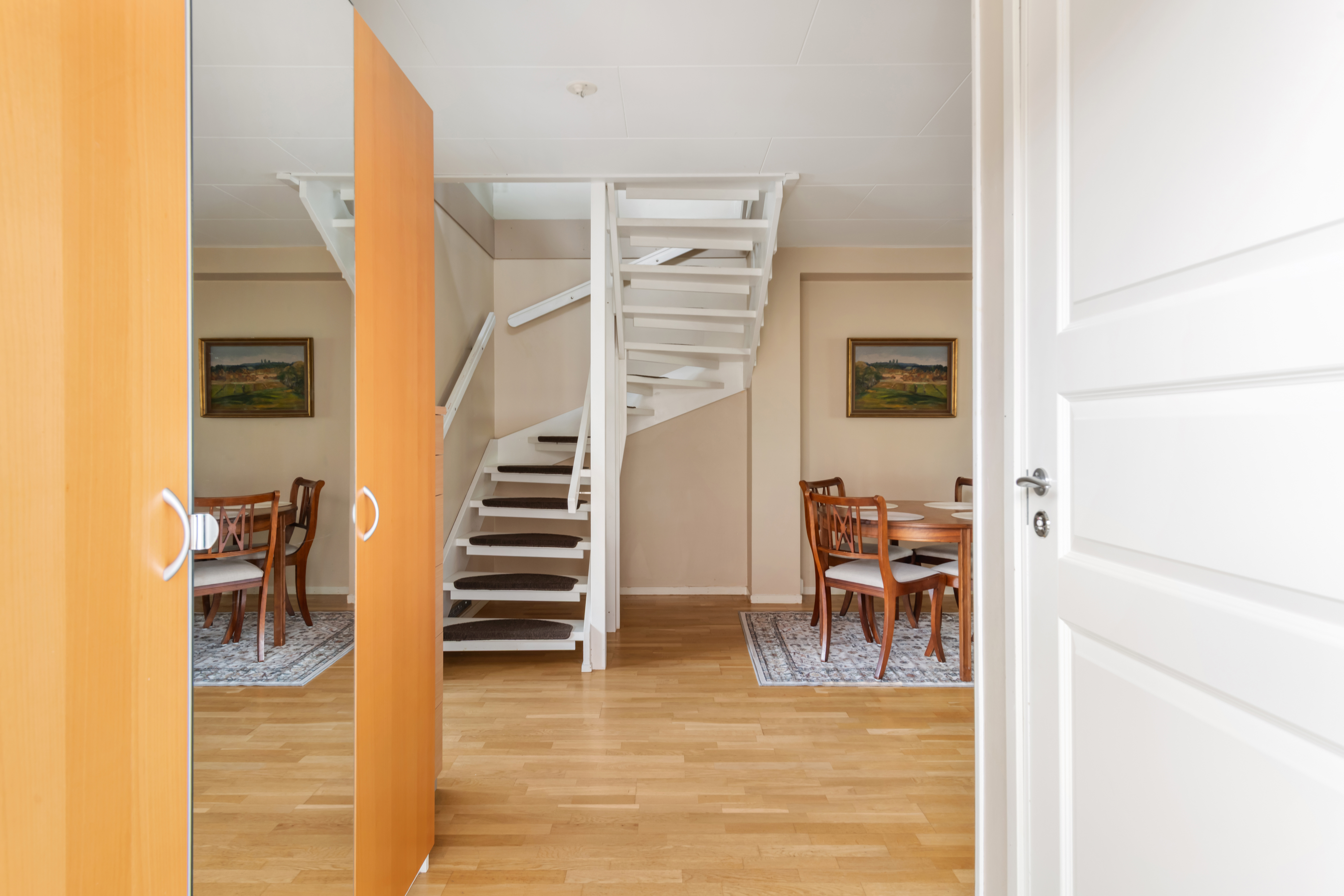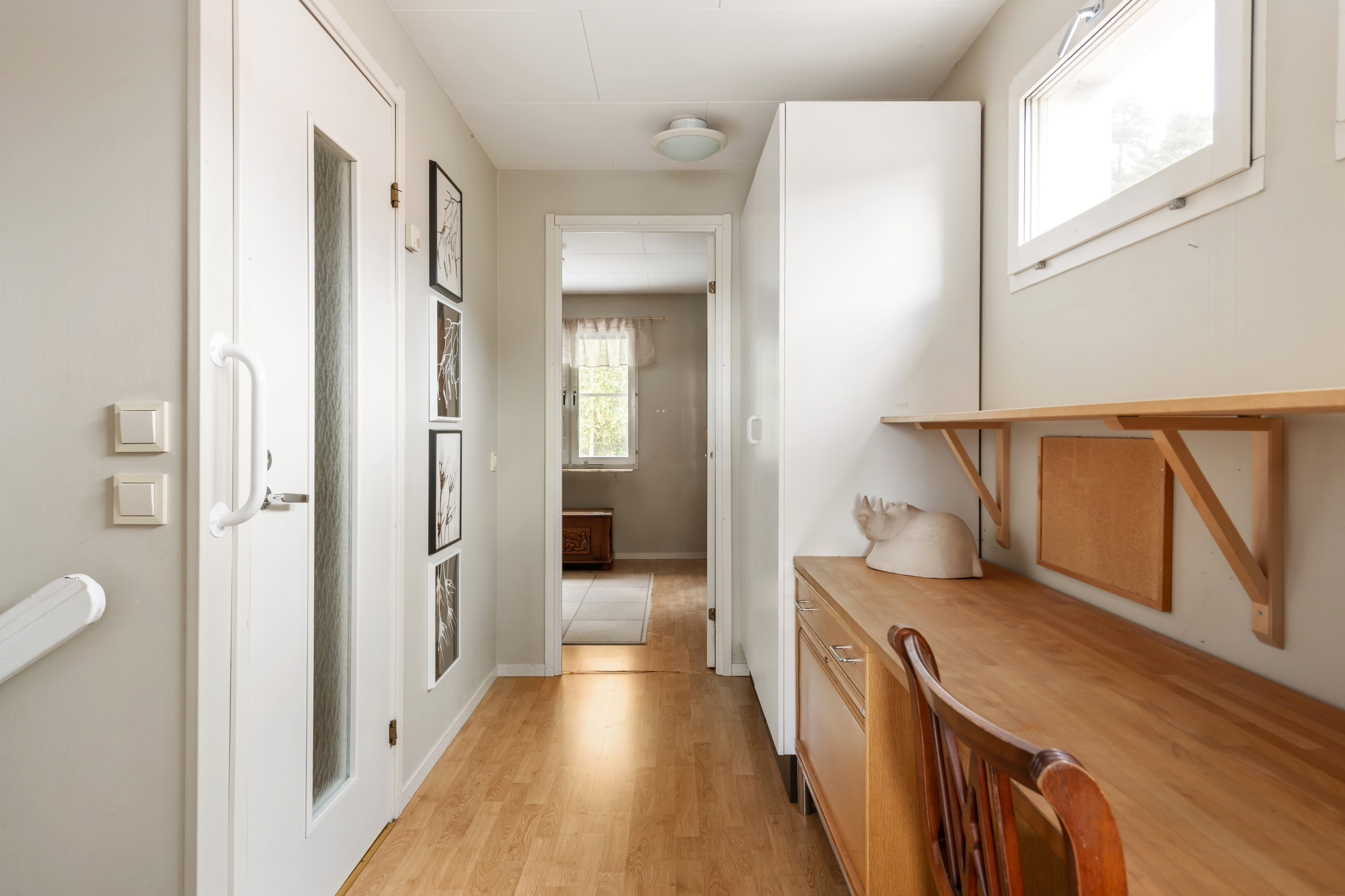 Utrymme med plats för t.ex. kontor eller extra förvaring. Här finns idag två garderober. Två fönster ger extra ljus. Trälaminat på golvet och ljusa tapeter på väggarna.