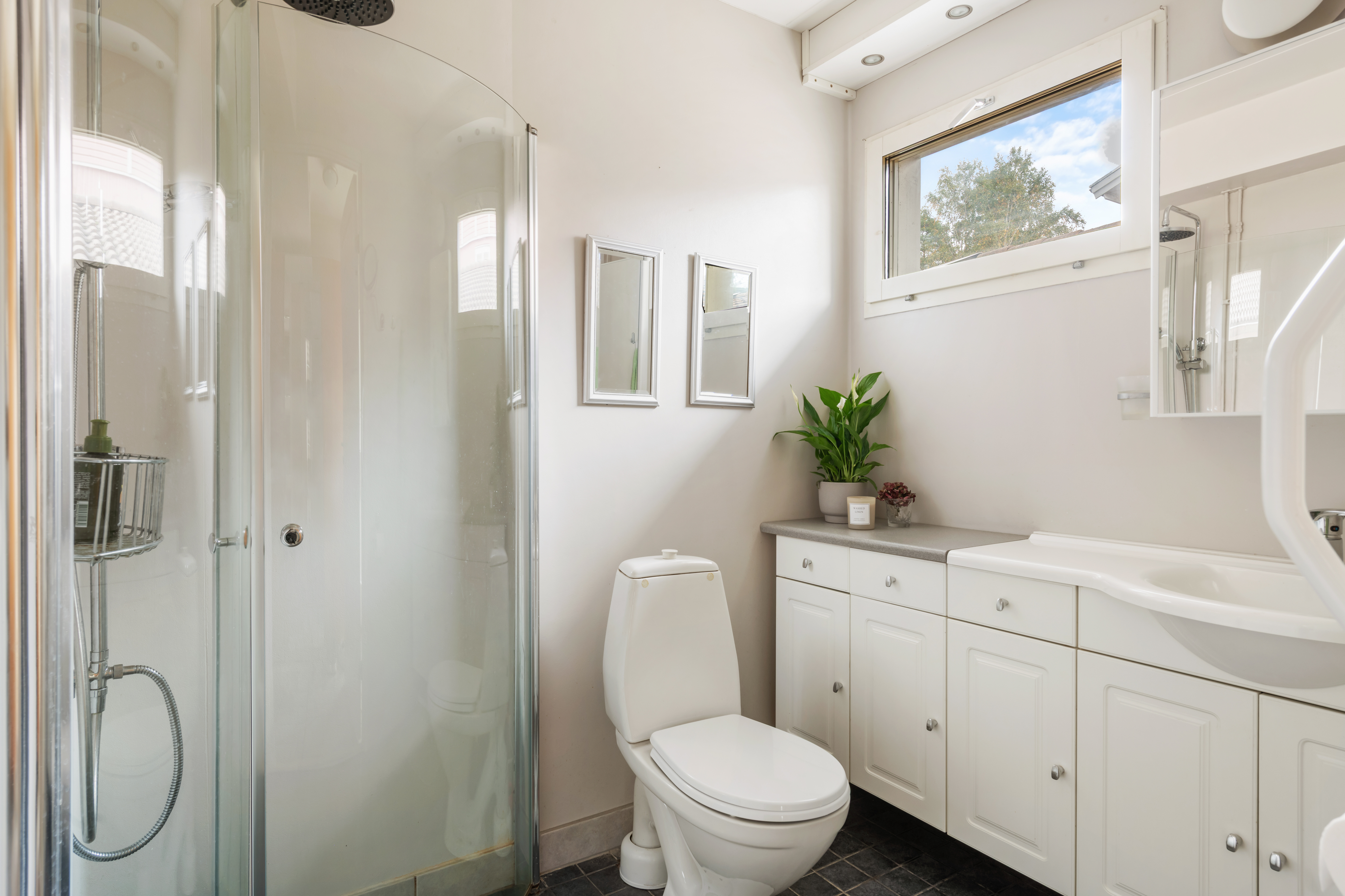 Badrum med stor handfatskomod med flera skåp och bänk som sträcker sig längs ena väggen. Fönster som ger både extra ljus och vädringsmöjlighet. Skåp med spegellucka ovan kommod. Dusch med takdusch bakom vikbara dörrar i glas. Klinkergolv (lagts ovanpå befintlig våtrumsmatta) och ljus våtrumstapet på väggarna.