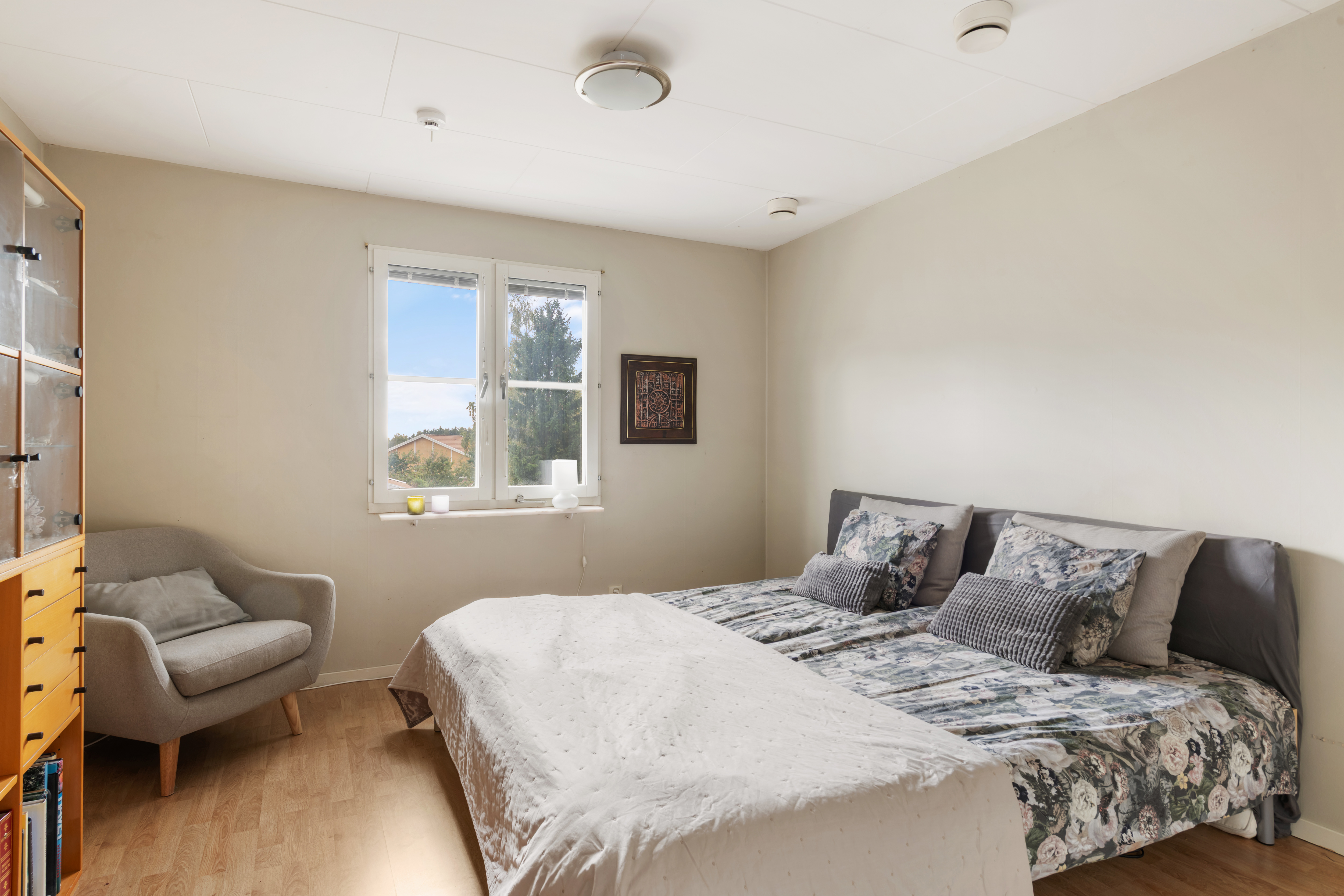 Även detta sovrum är enkelt att möblera. Trälaminat på golvet och ljusa tapeter på väggarna.