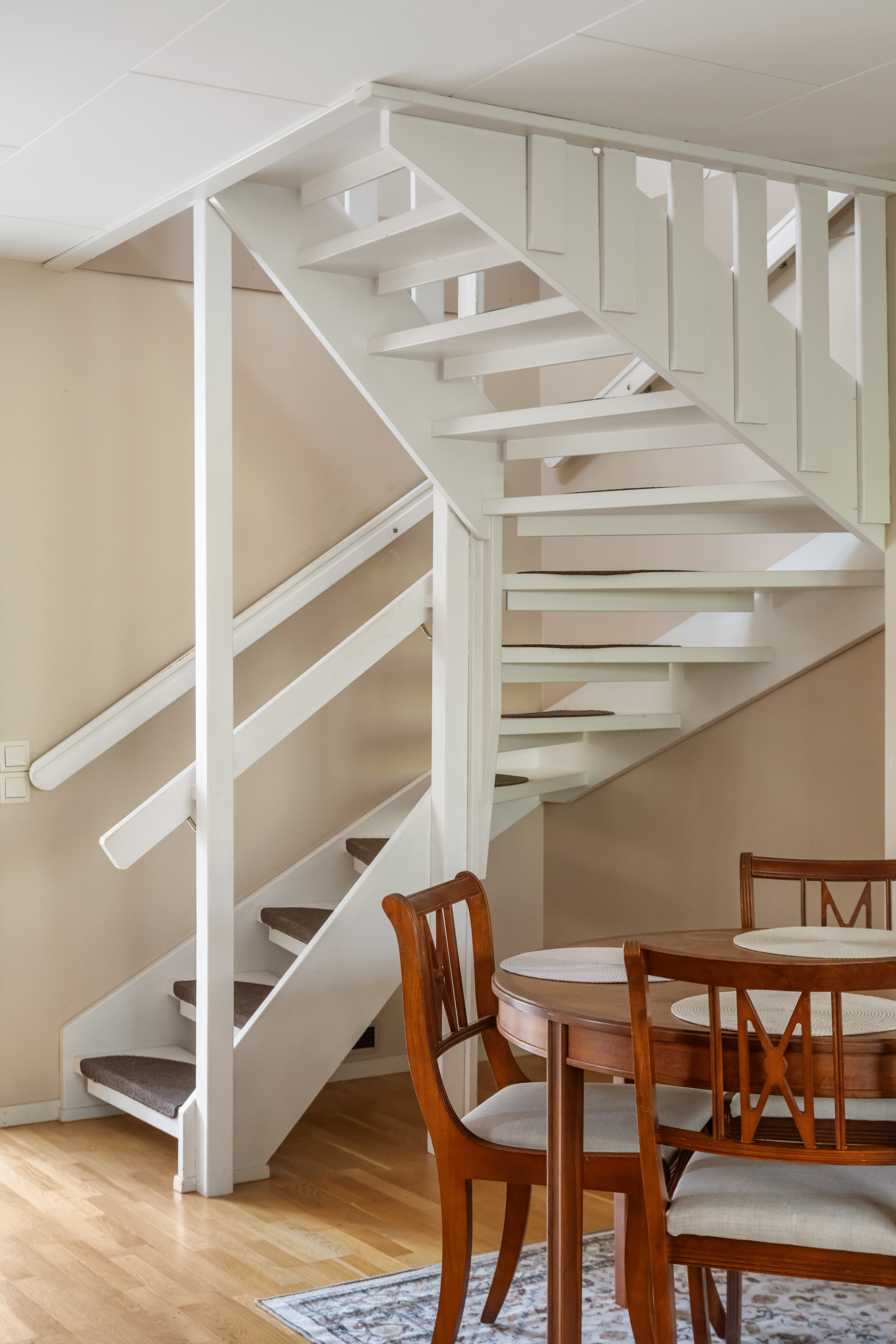 Rymligt vardagsrum som är enkelt att möblera. Trevlig social planlösning med direkt anknytning till både kök och uterum samt uteplatser. Ekparkett på golvet och ljus tapet på väggarna.