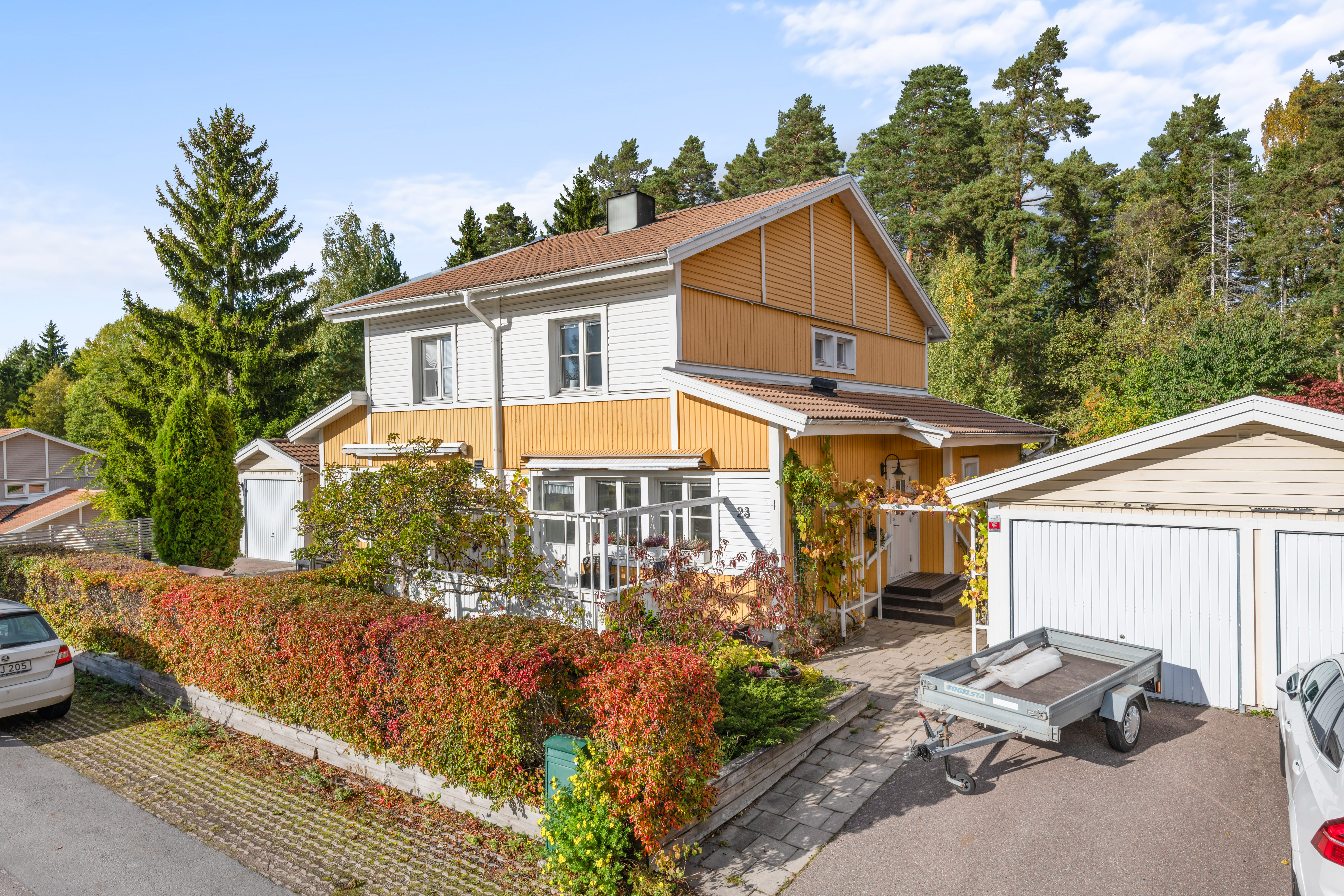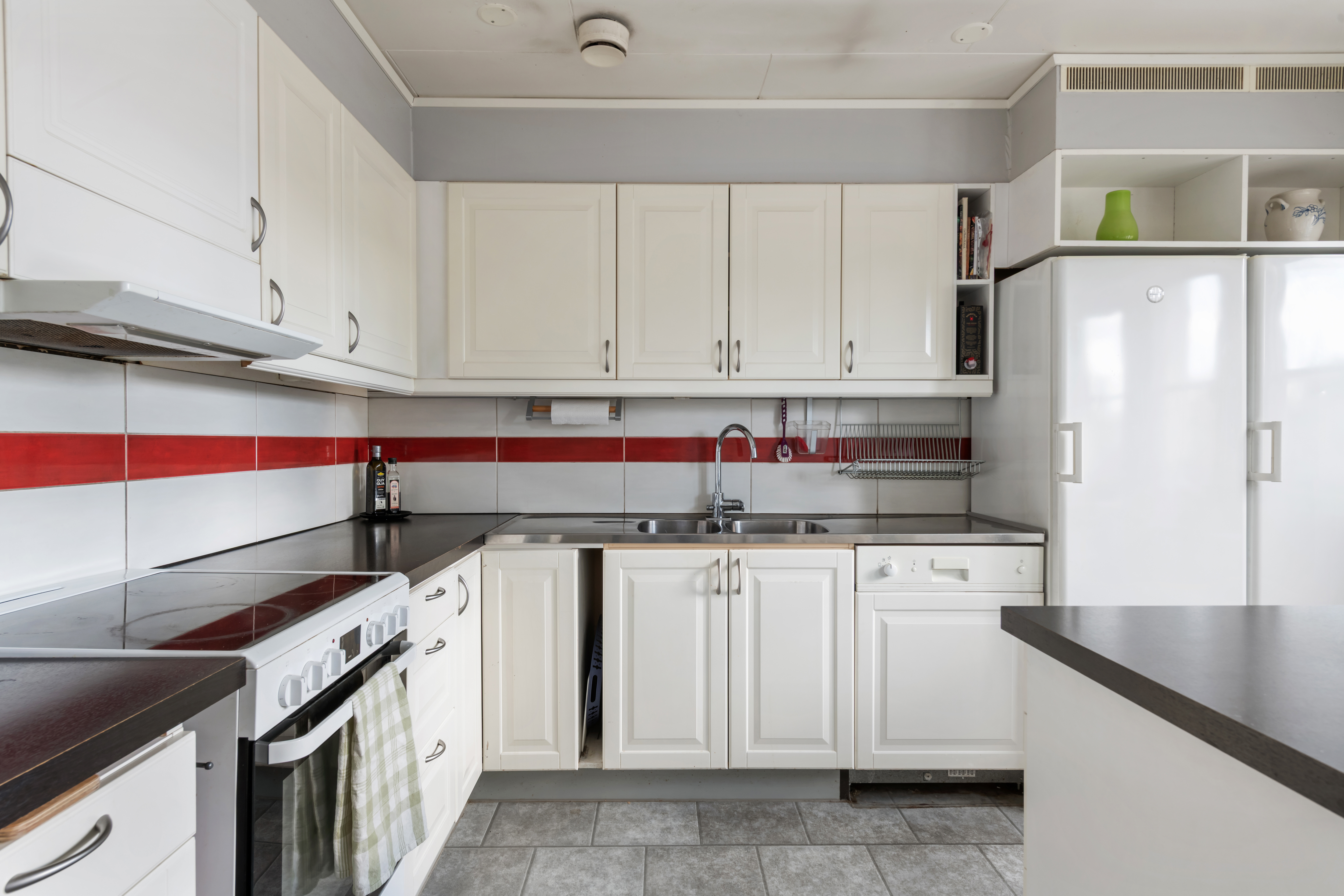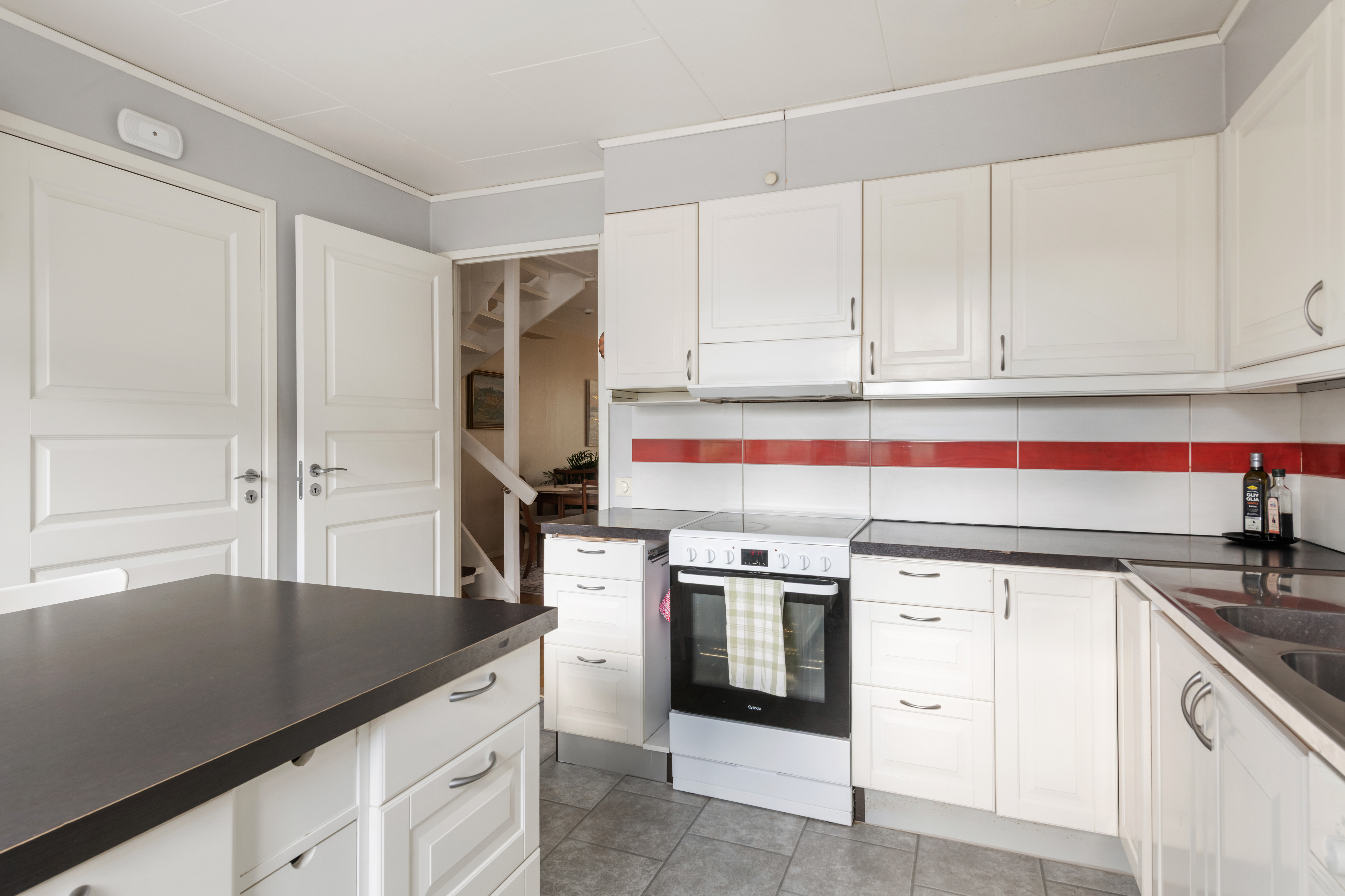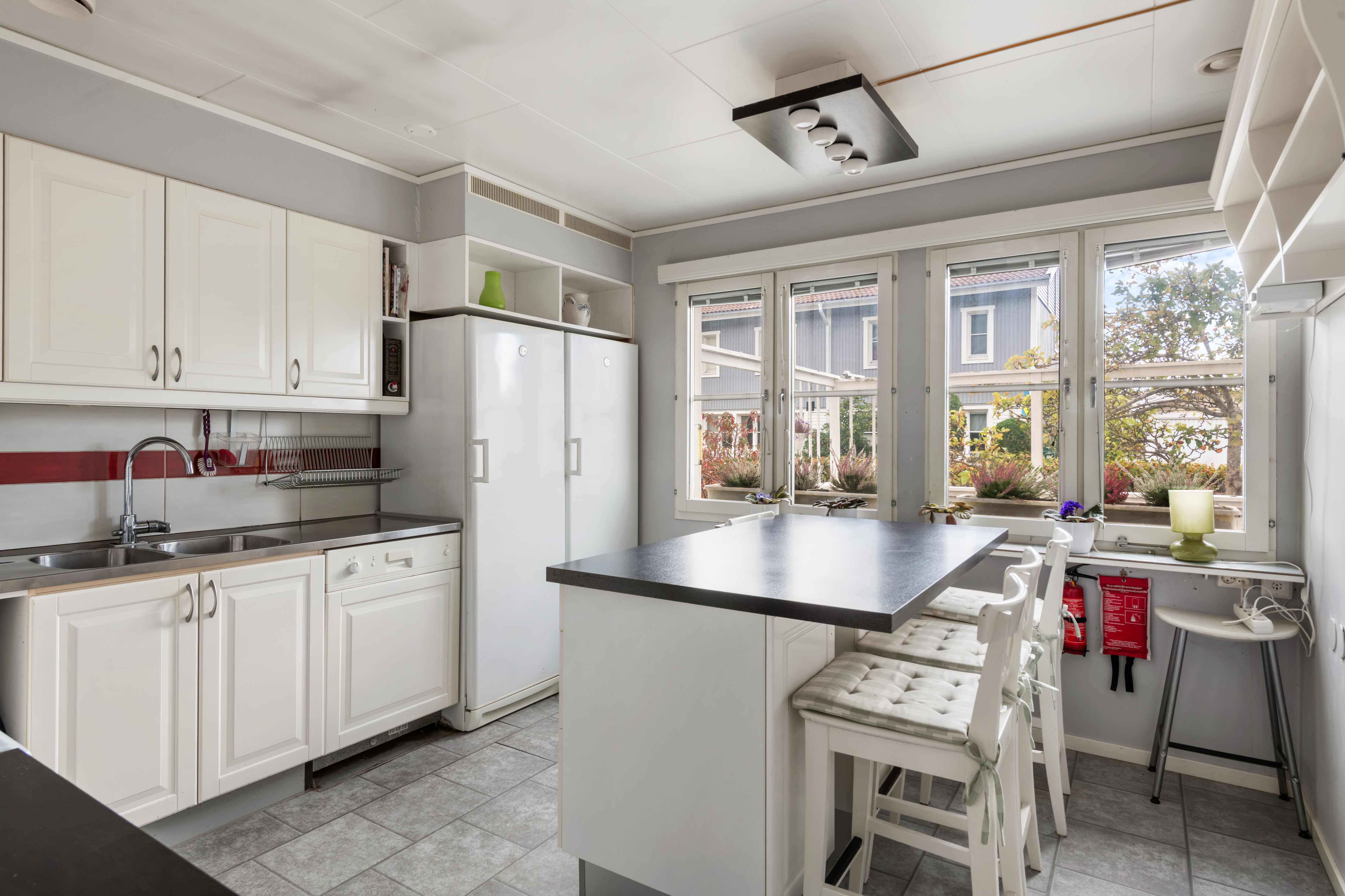 Trivsamt kök med gott om förvaring i flera skåp och lådor, samt i köksö. Köket går i vitt med vitt stänkskydd ovan diskbänk samt laminatgolv. Ljusa tapeter på väggarna och stora fönsterpartier ger extra ljus och rymd. Här finns kyl och frys i fullhöjd, diskmaskin, dubbel diskho, ugn med häll samt spisfläkt. Från köket nås även tvättstugan med groventré till framsidan.