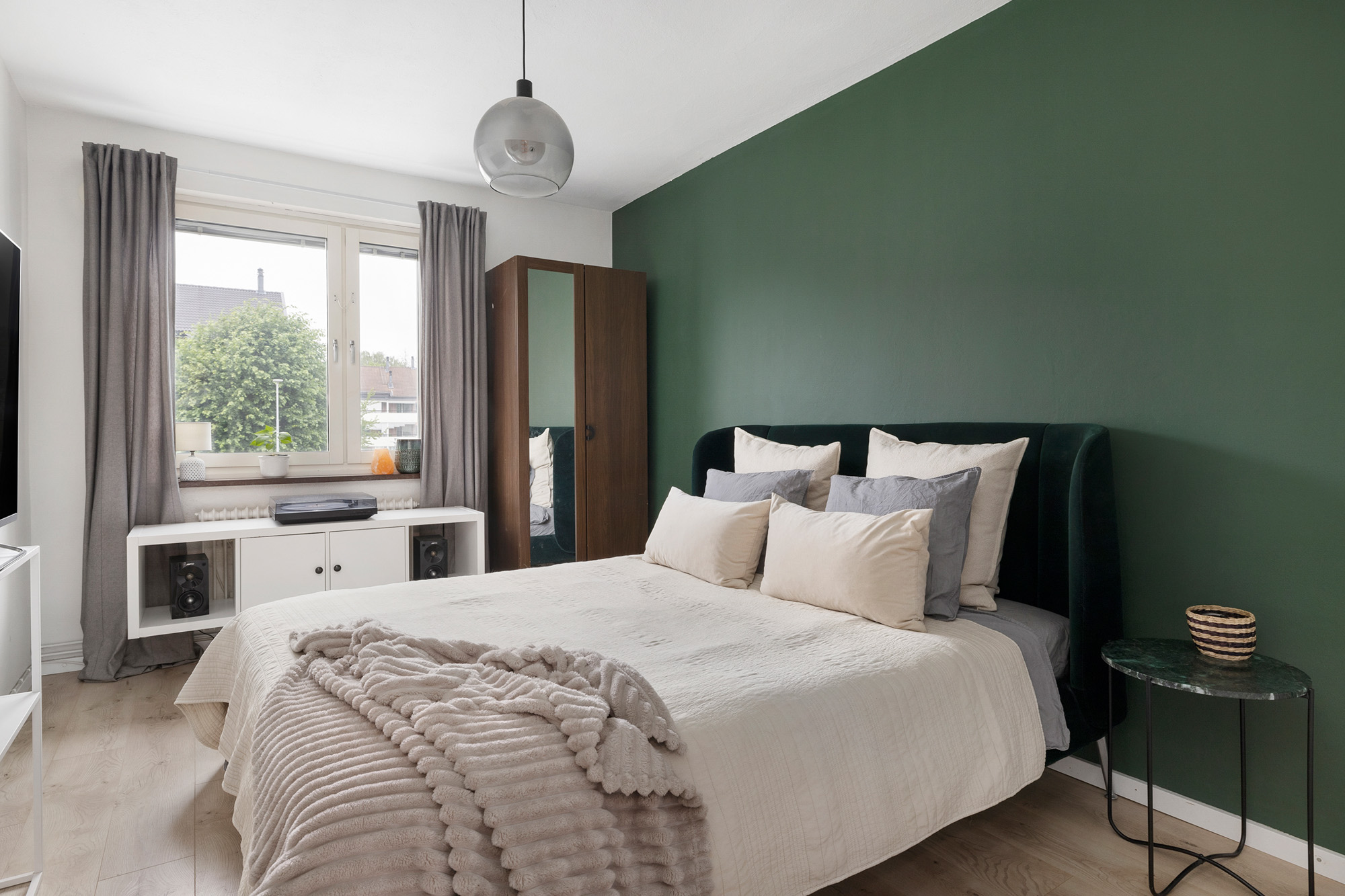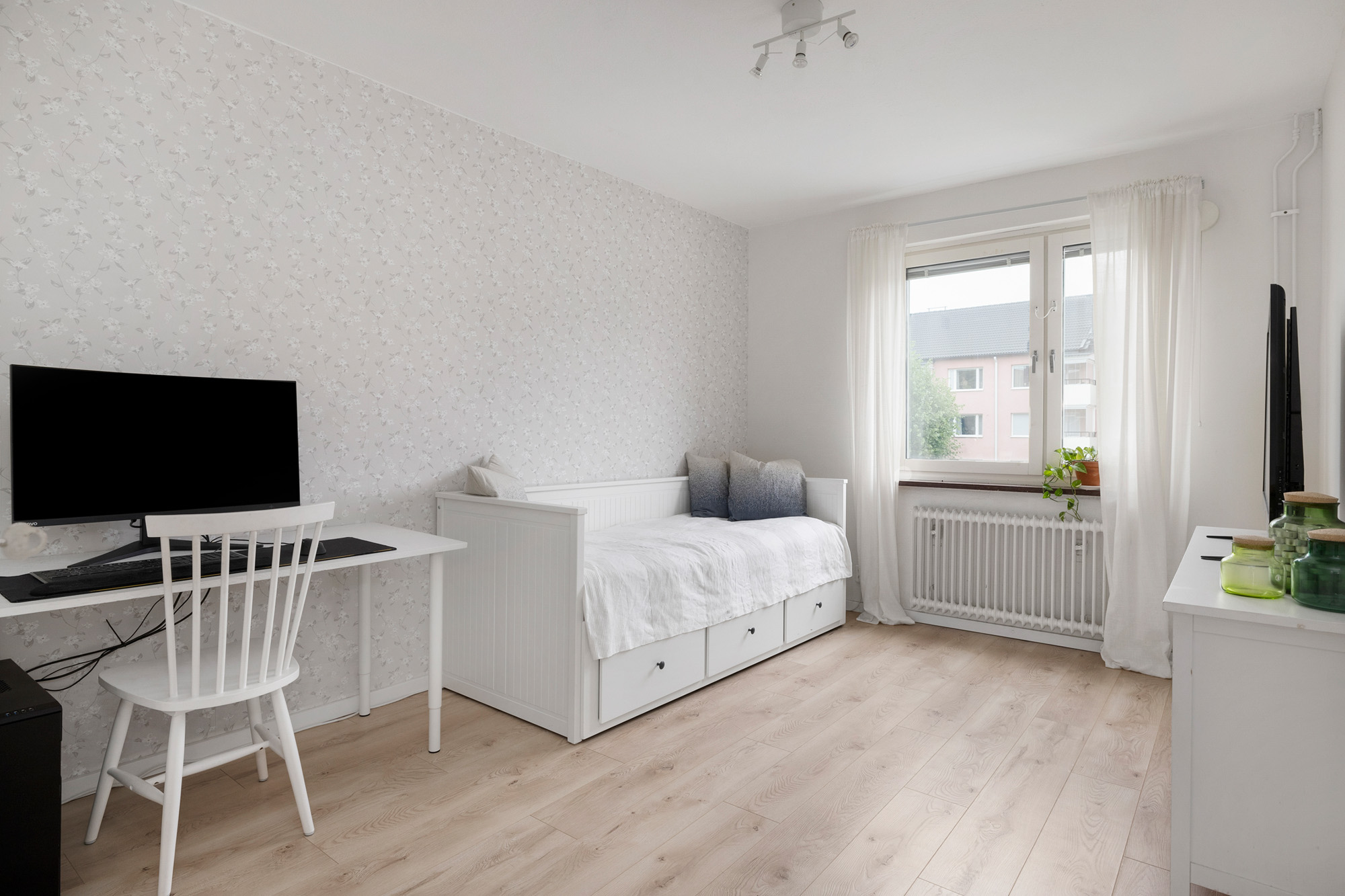 Även detta sovrum är rymligt och rymmer det mesta som t.ex. säng, skrivbord och möbler för förvaring. Trälaminat på golvet och ljust målade väggar tillsammans med en fondtapet.