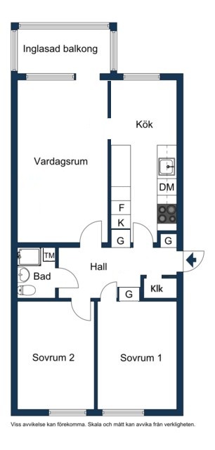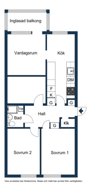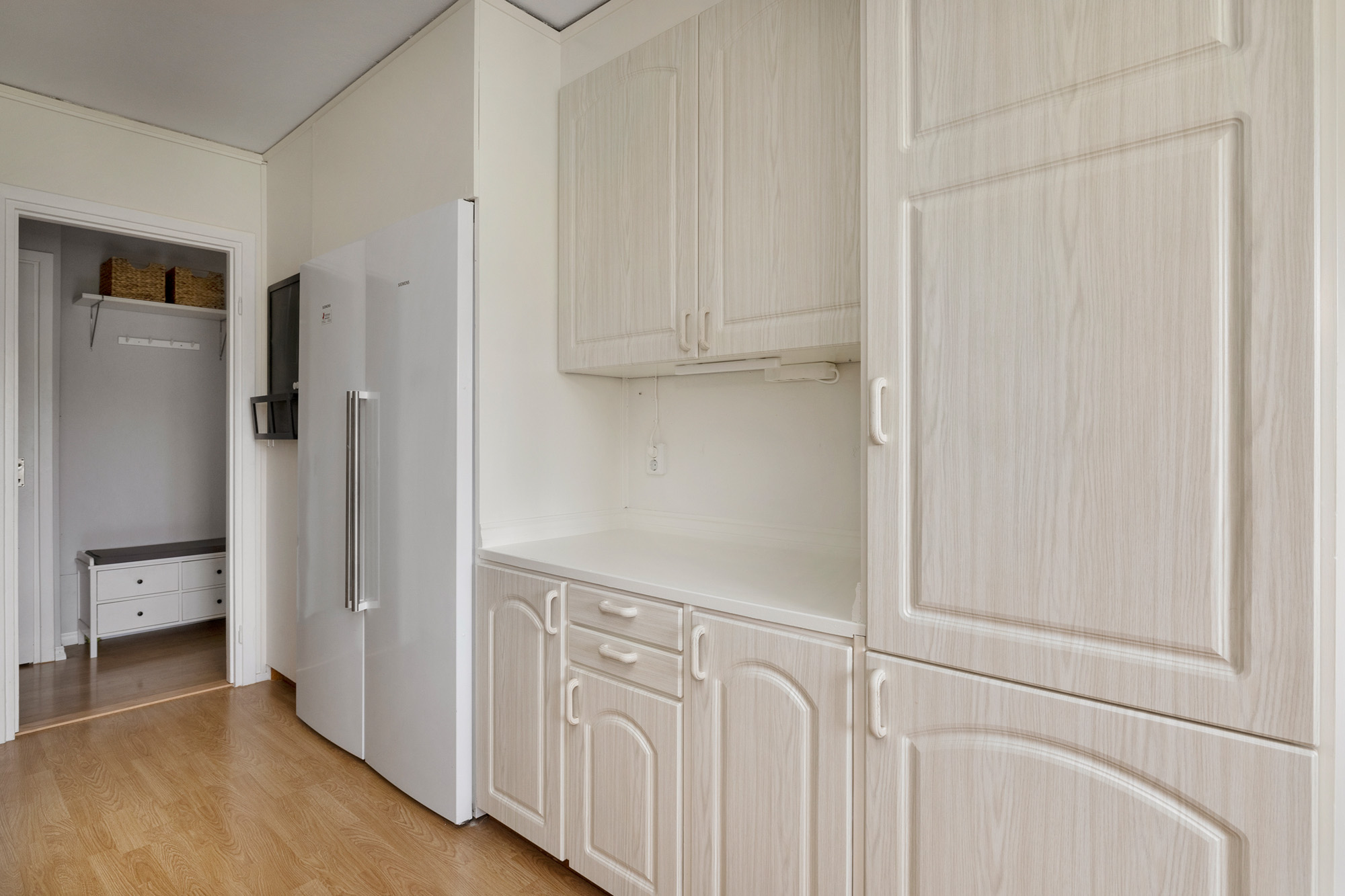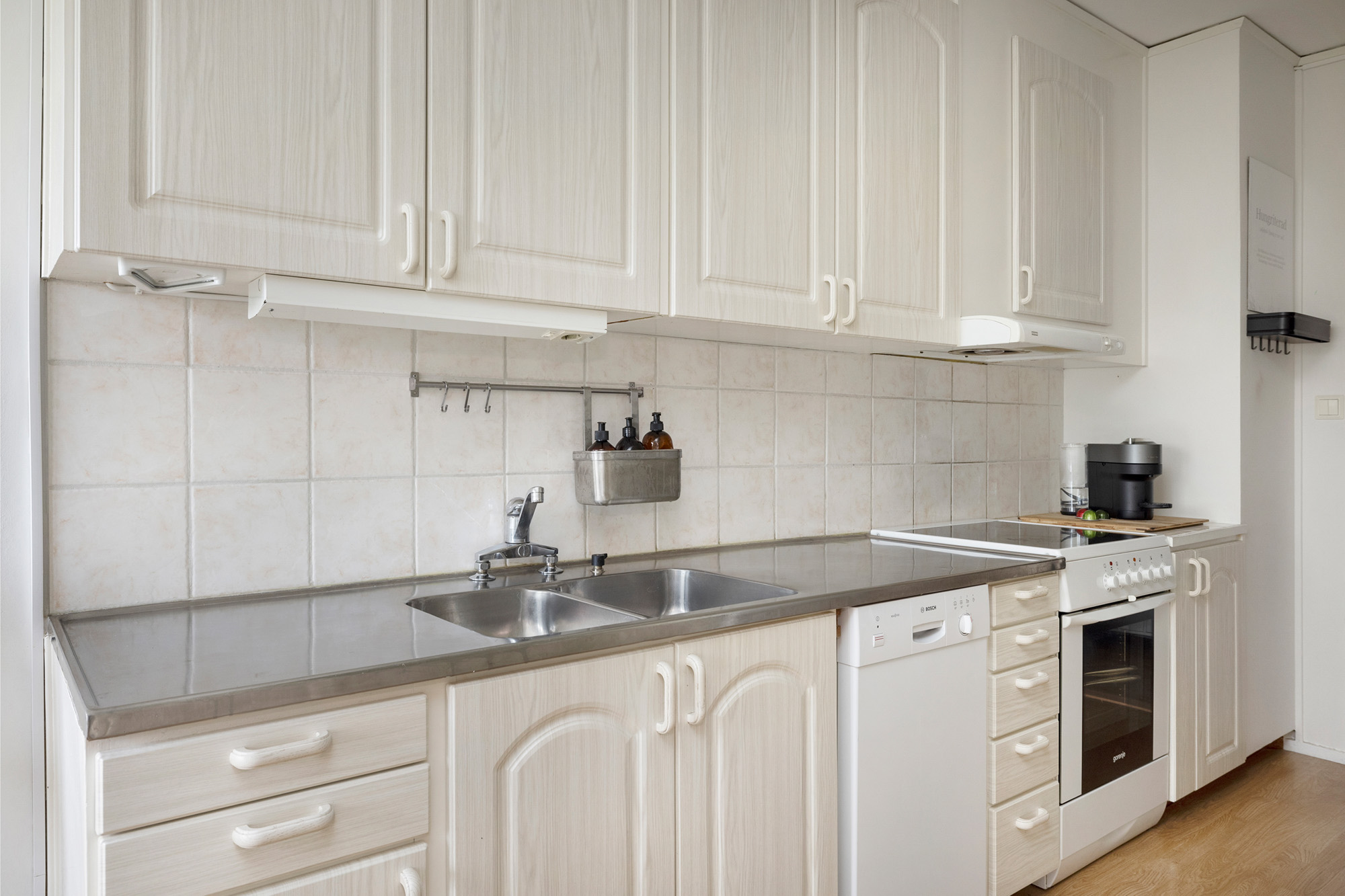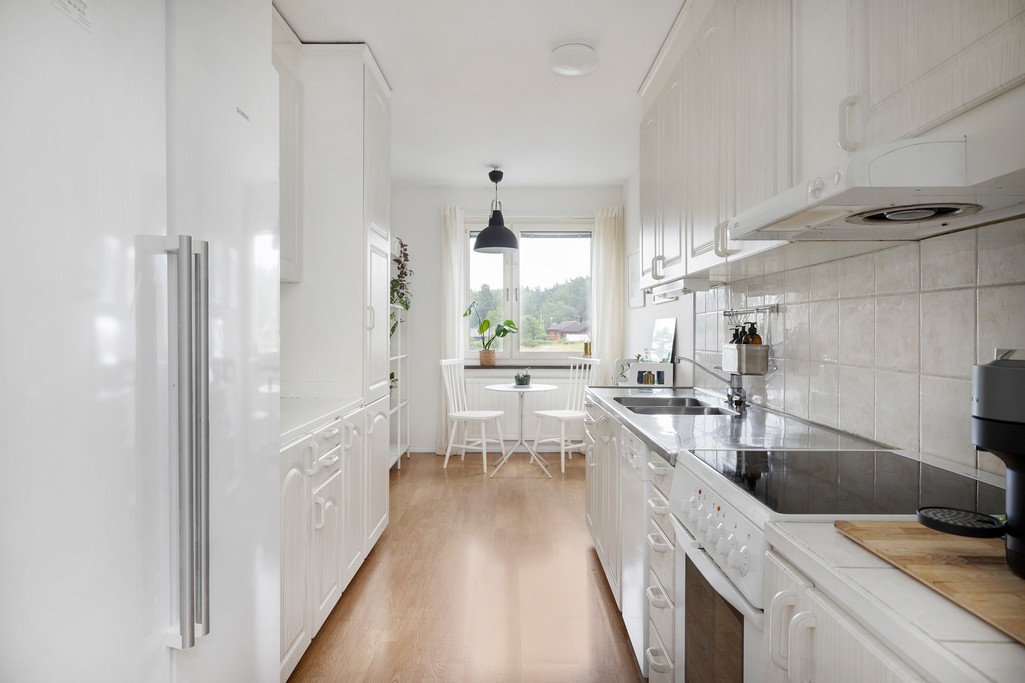 Trivsamt kök med gott om arbetsyta på två köksbänkar och bra förvaring i flera skåp och lådor. Här finns även en matplats för 4-6 personer med utsikt mot föreningens gård. Matplatsen har social planlösning mot vardagsrummet vilket skapar en mycket trevlig yta och mycket ljus och rymd från flera fönsterpartier samt tillgången till balkongen. Maskinparken i köket består av kyl och frys i fullhöjd, diskmaskin, ugn med spishäll och fläkt. Målade väggar, laminatgolv och ett vitt kakel ovan köksbänk.