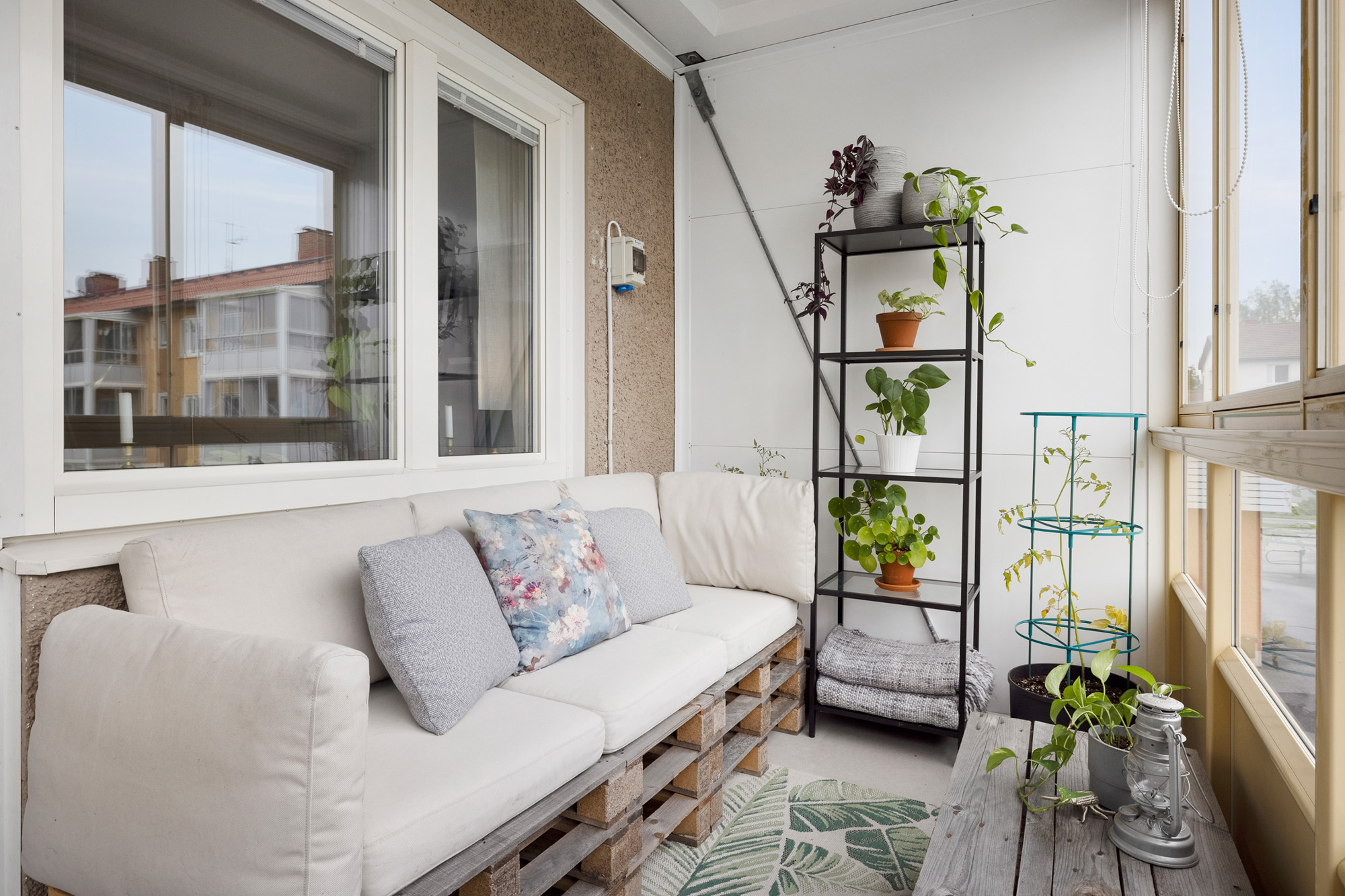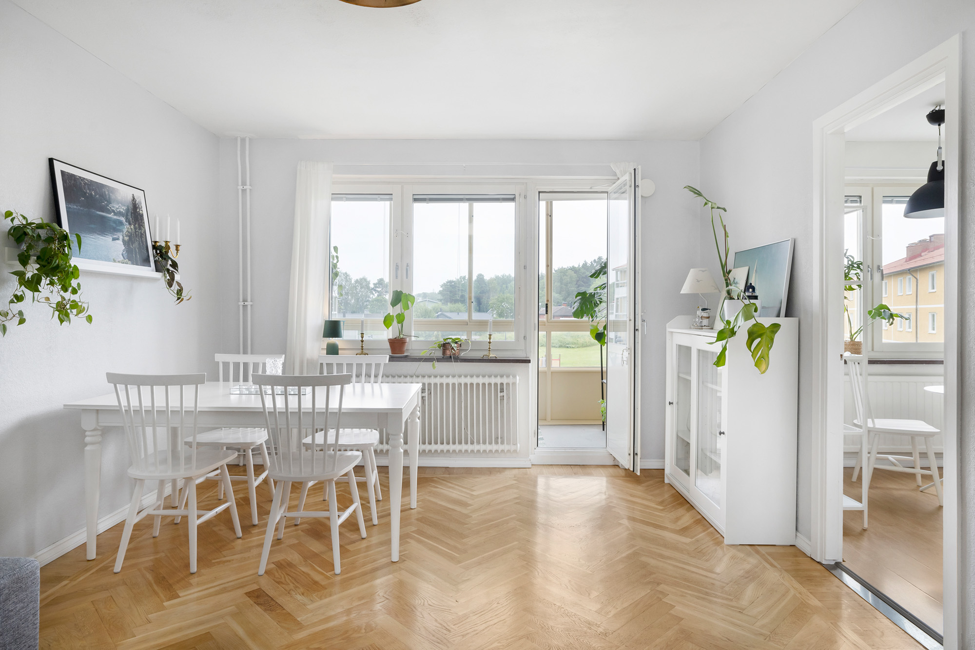 Vardagsrummet erbjuder gott om yta för disponering och möblering, med utgång till den inglasade balkongen. Här ryms det mesta. Och vid behov kan utrymmet förslagsvis delas av för att göra plats åt en separat sovdel eller kontor. Ljust målade väggar och fiskbensparkett på golvet.
