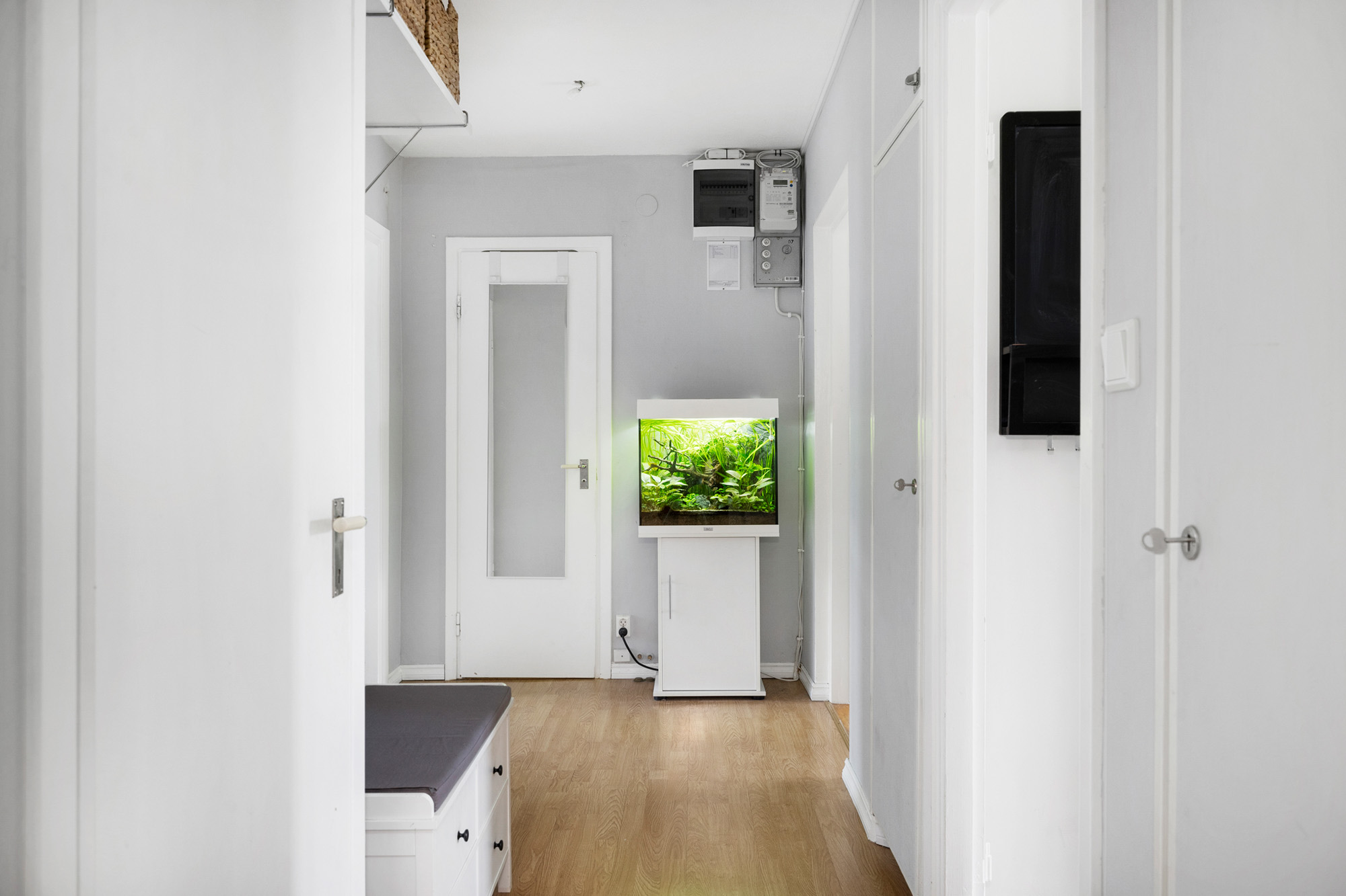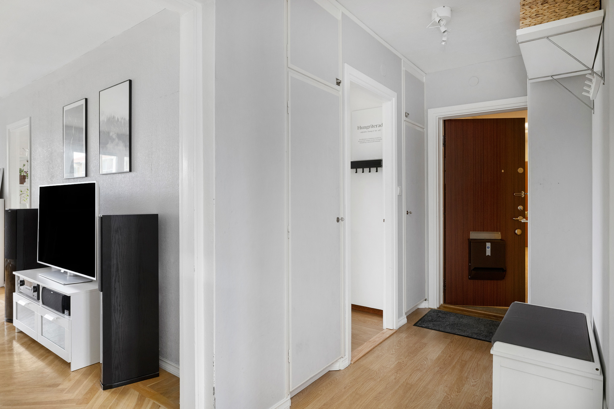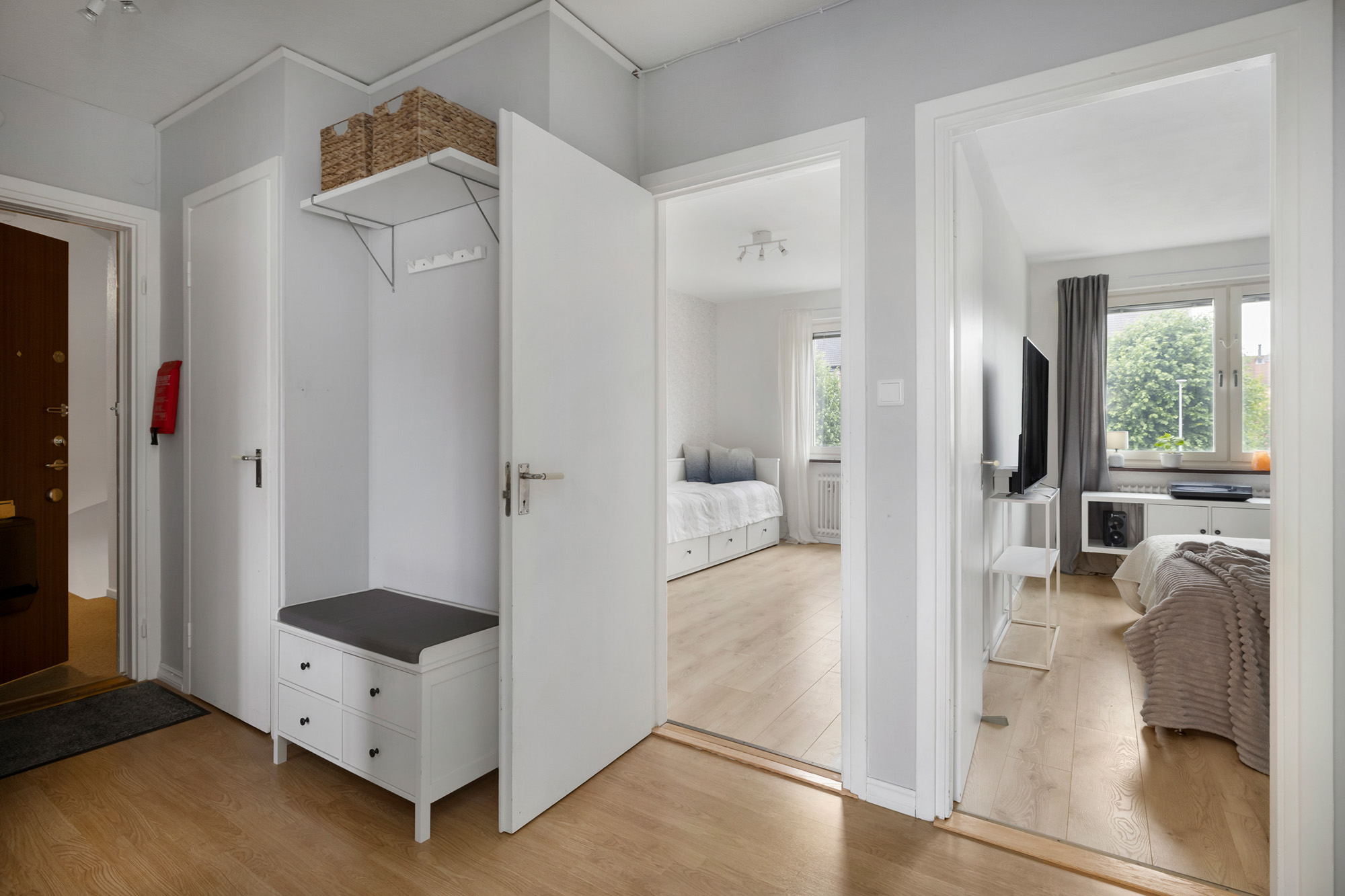Entré via säkerhetsdörr. Välkomnande hall som tack vare ytan rymmer flera förvaringsmöjligheter i form av en klädkammare, tillsammans med två inbyggda garderober med överskåp. Det finns även plats för skoställ och hatthylla mm. På golvet ligger laminat och väggarna är målade.
