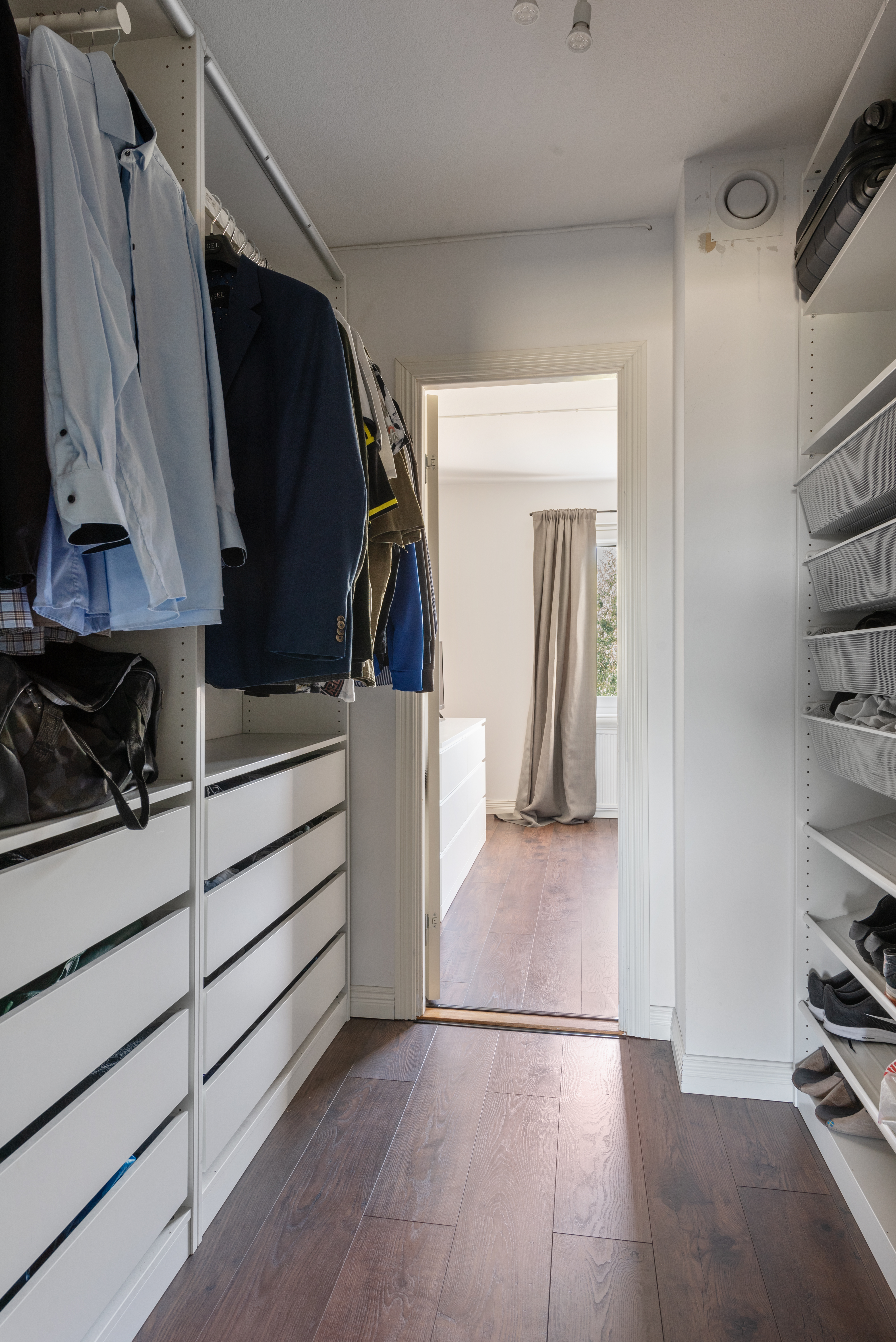 Entré via säkerhetsdörr. Hall med gott om svängrum. Plats för hatthylla och skoställ samt övrig möblering. Vitmålade väggar och laminatgolv som går enhetligt i hela lägenheten. Förvaringsdel med mycket bra förvaring. Garderobssektioner med lådor, klädhängare, korgar, hyllor och skoställ. Detta är även en passage till Sovrum 1.