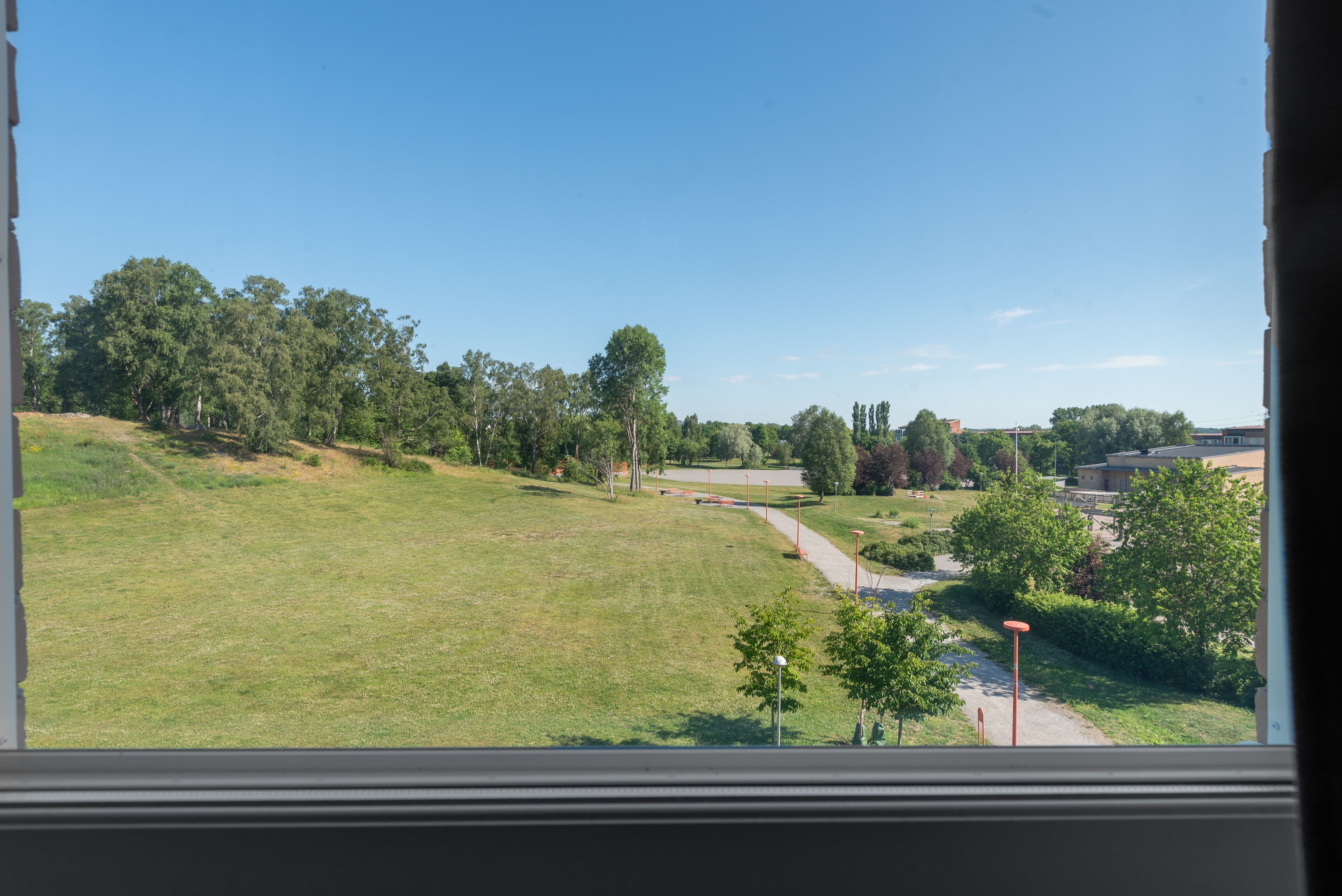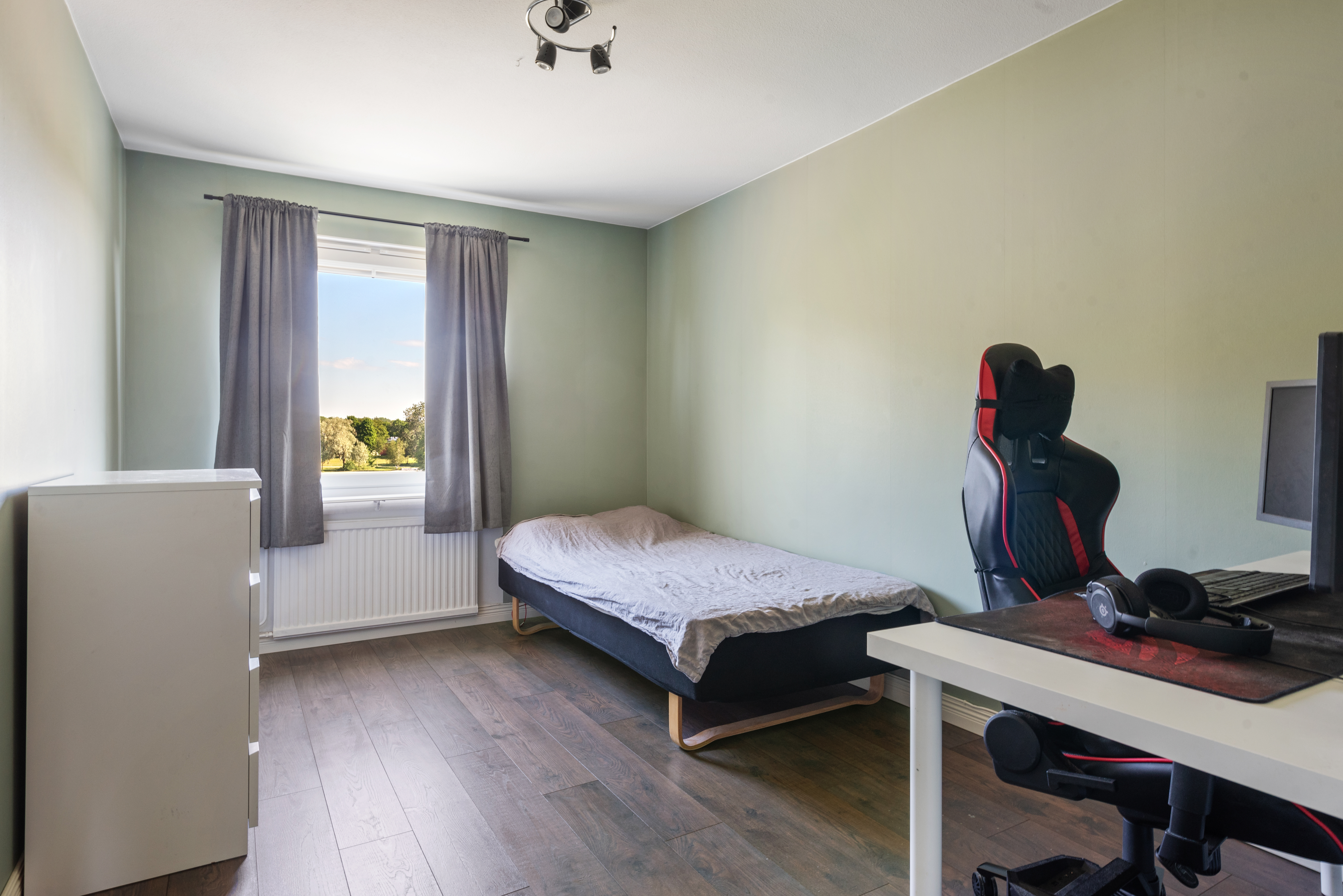 Rymligt sovrum med plats för det mesta. Fin och fri utsikt mot Kanonkullen. Laminatgolv och målade väggar.