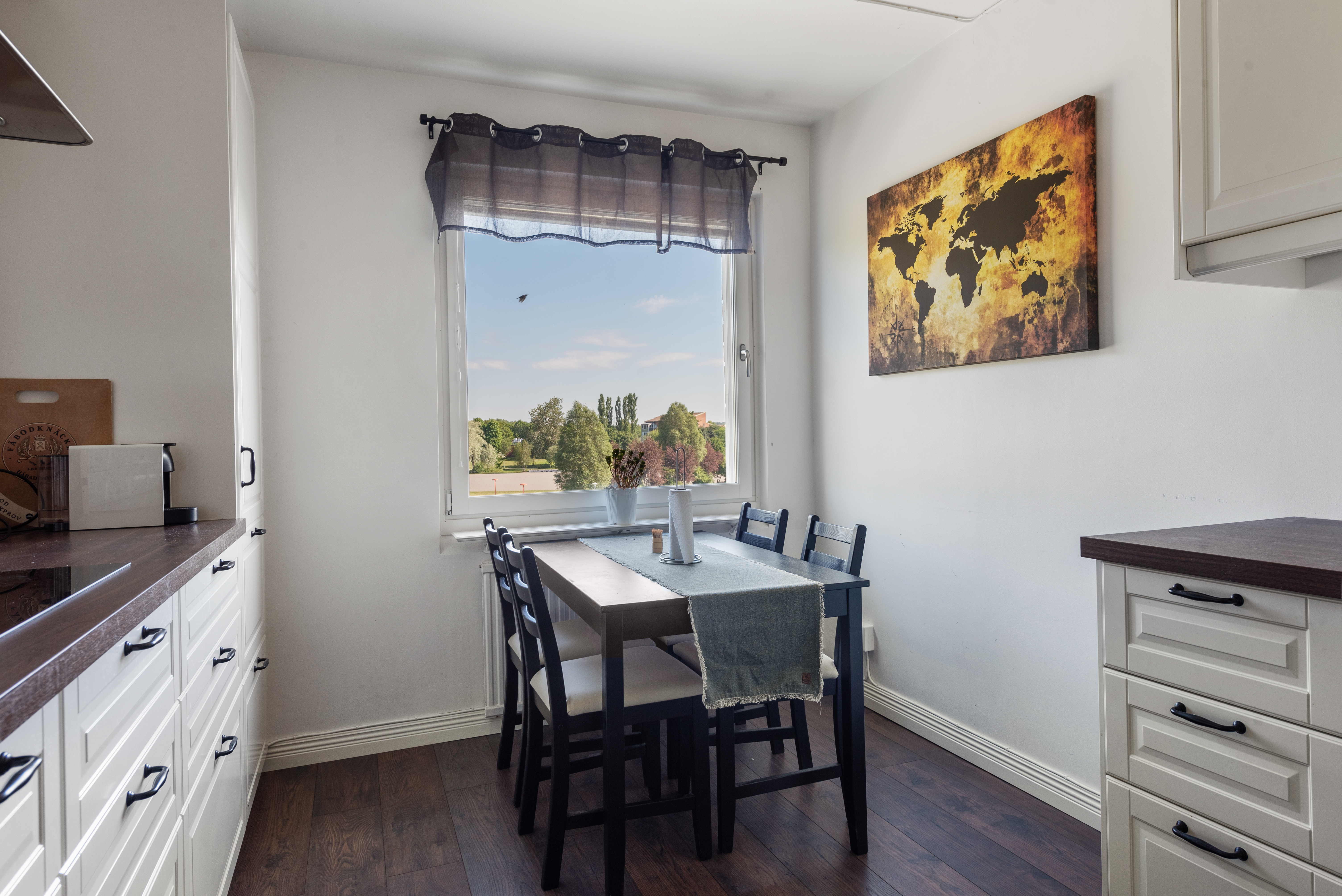 Trivsamt kök från 2016 med matplats och många skåp och lådor för förvaring. Matplatsen har fin utsikt mot Kanonkullen. Köket går i vitt med vitt kakel ovan diskbänk och vitmålade väggar samt rostfri maskinpark. Kyl och frys i fullhöjd, inbyggnadsugn och micro i arbetsvänlig höjd, diskmaskin, spishäll, fläkt.