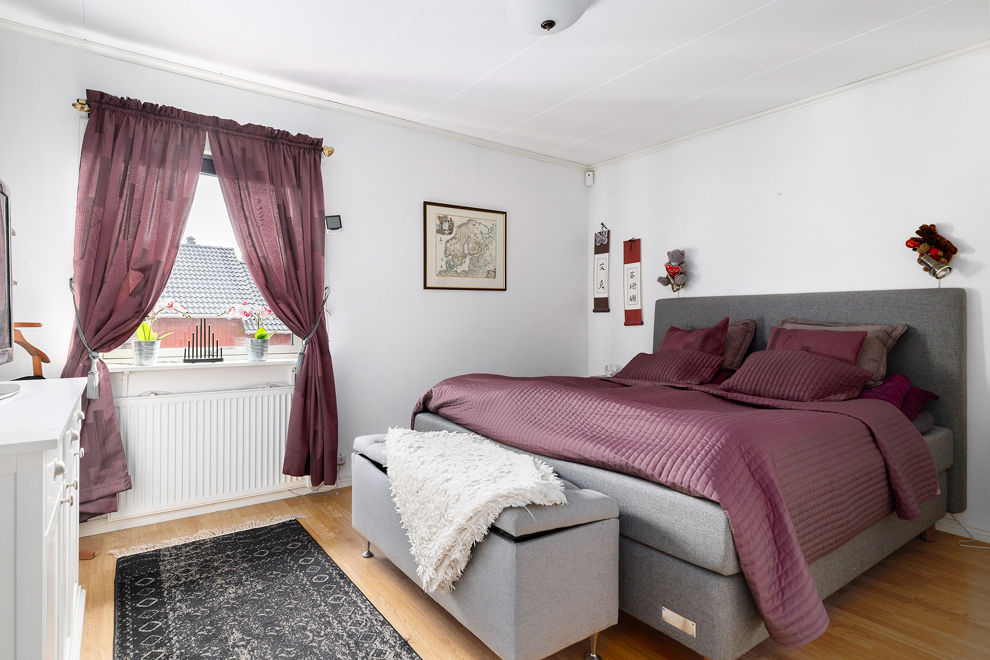 Även detta sovrum är enkelt att möblera och har trälaminat på golvet och ljust målade väggar.