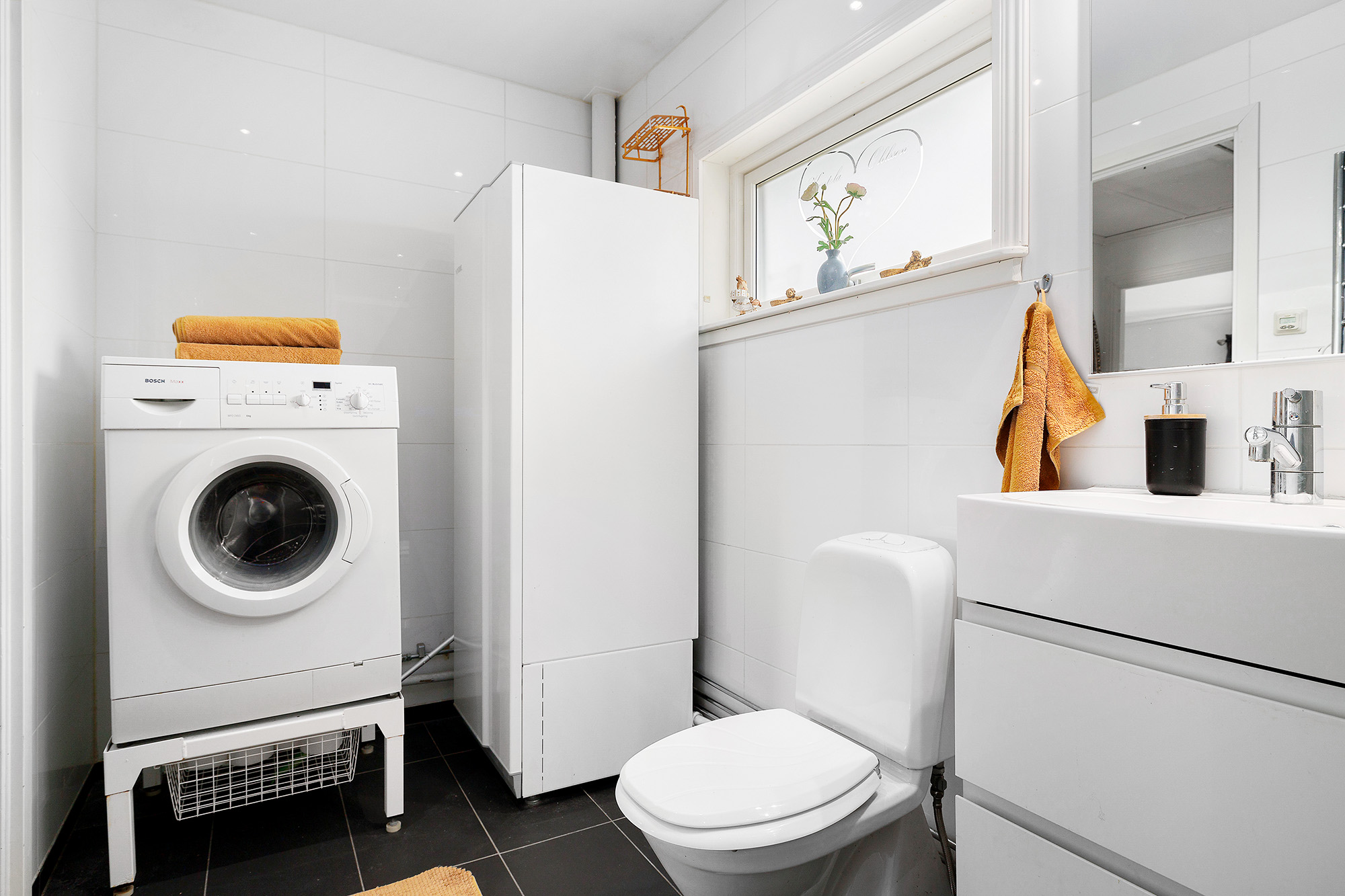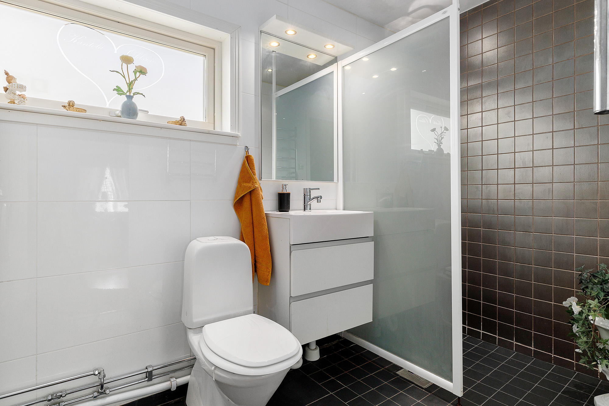 Stilrent badrum, helkaklat med vitt kakel på väggarna och kakel i duschen som matchar klinkergolvet. Badrummet har golvvärme. Stort fönster ger extra ljus och vädringsmöjlighet. Handfatskommod med tillhörande förvaring och spegel med inbyggd belysning. Belysning från spotlights i taket. Här står även varmvattenberedaren och en tvättmaskin.