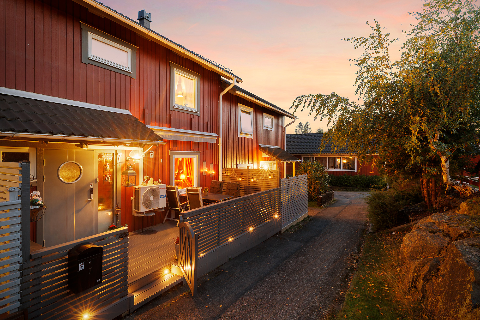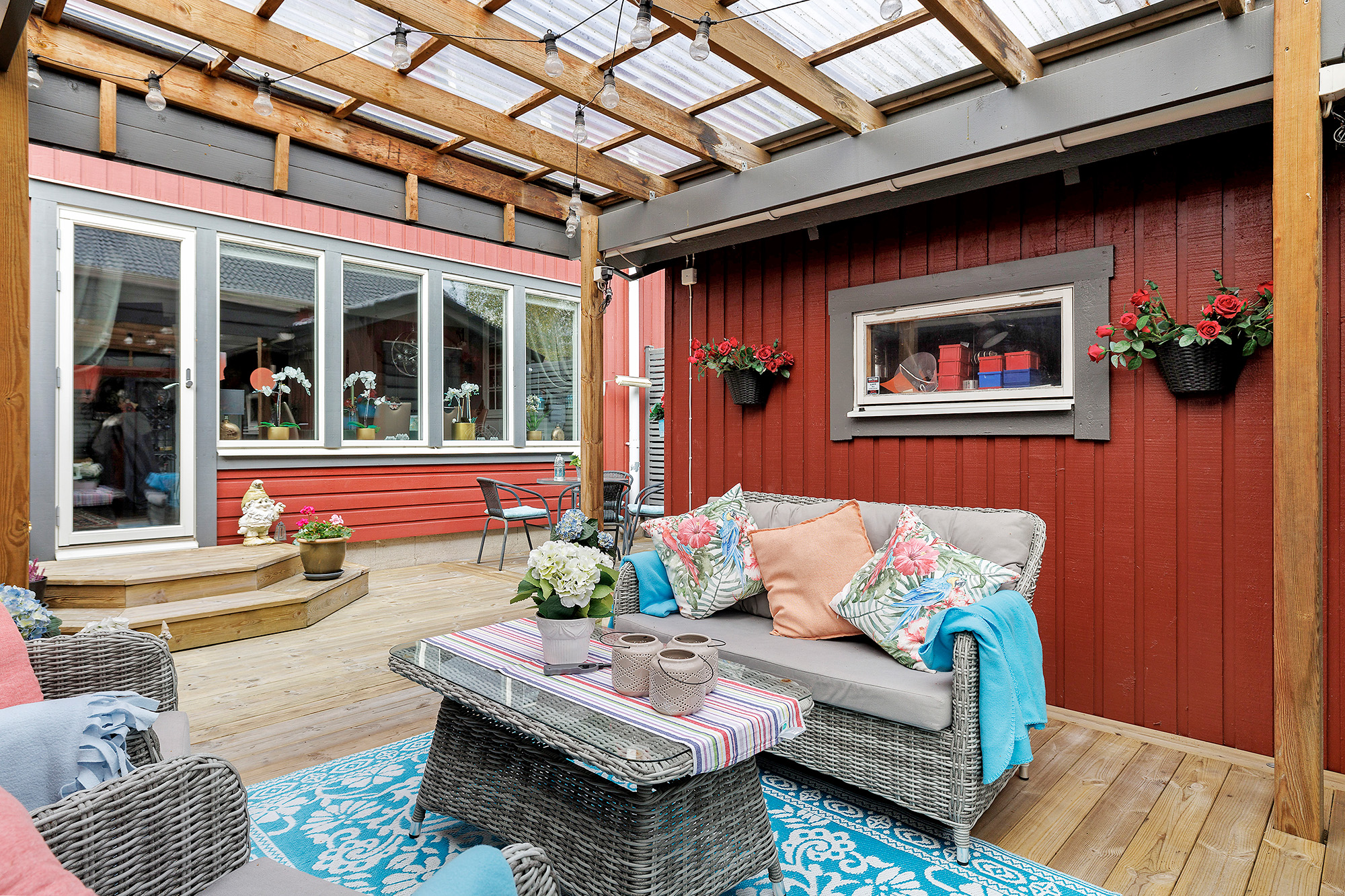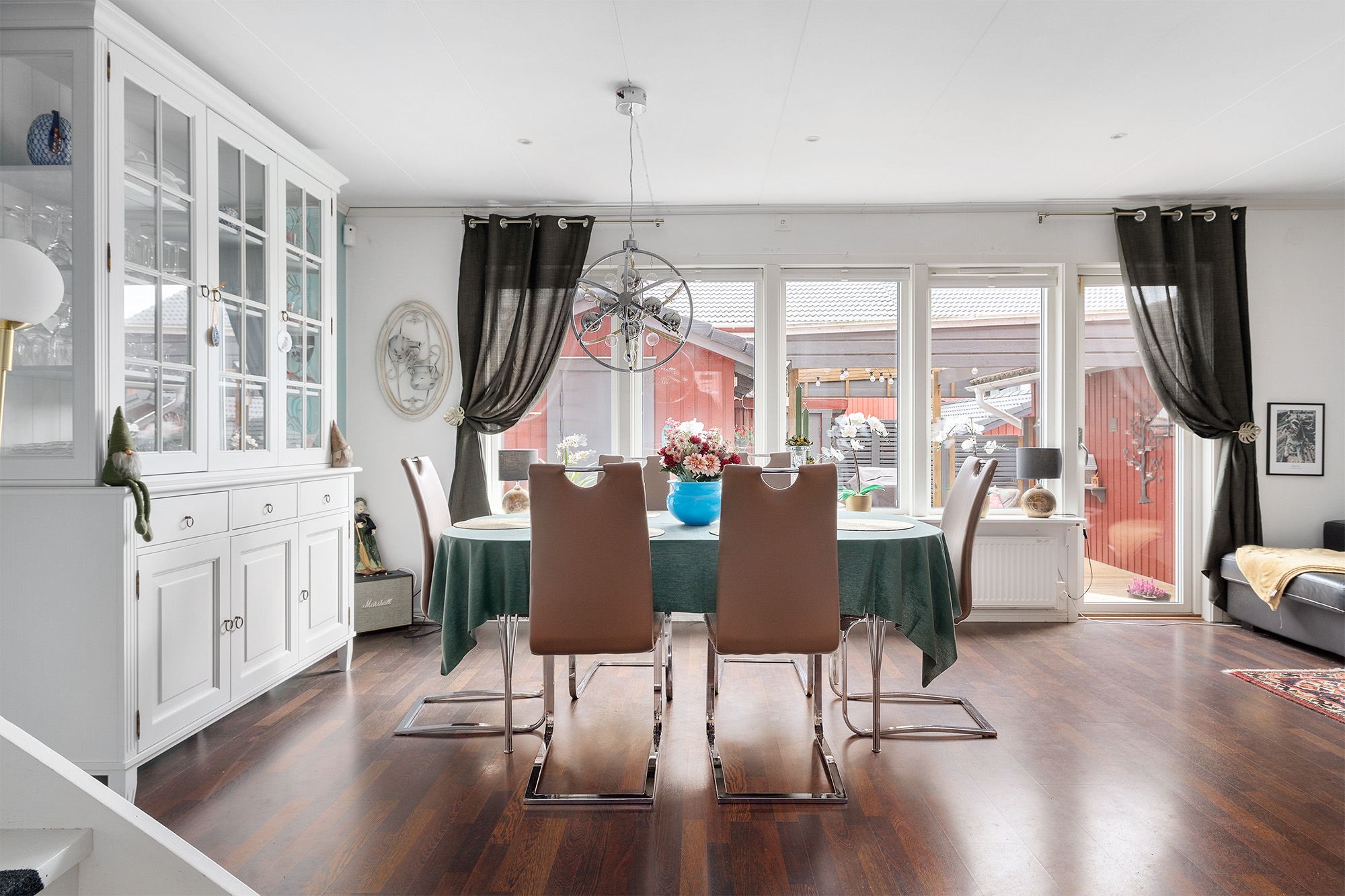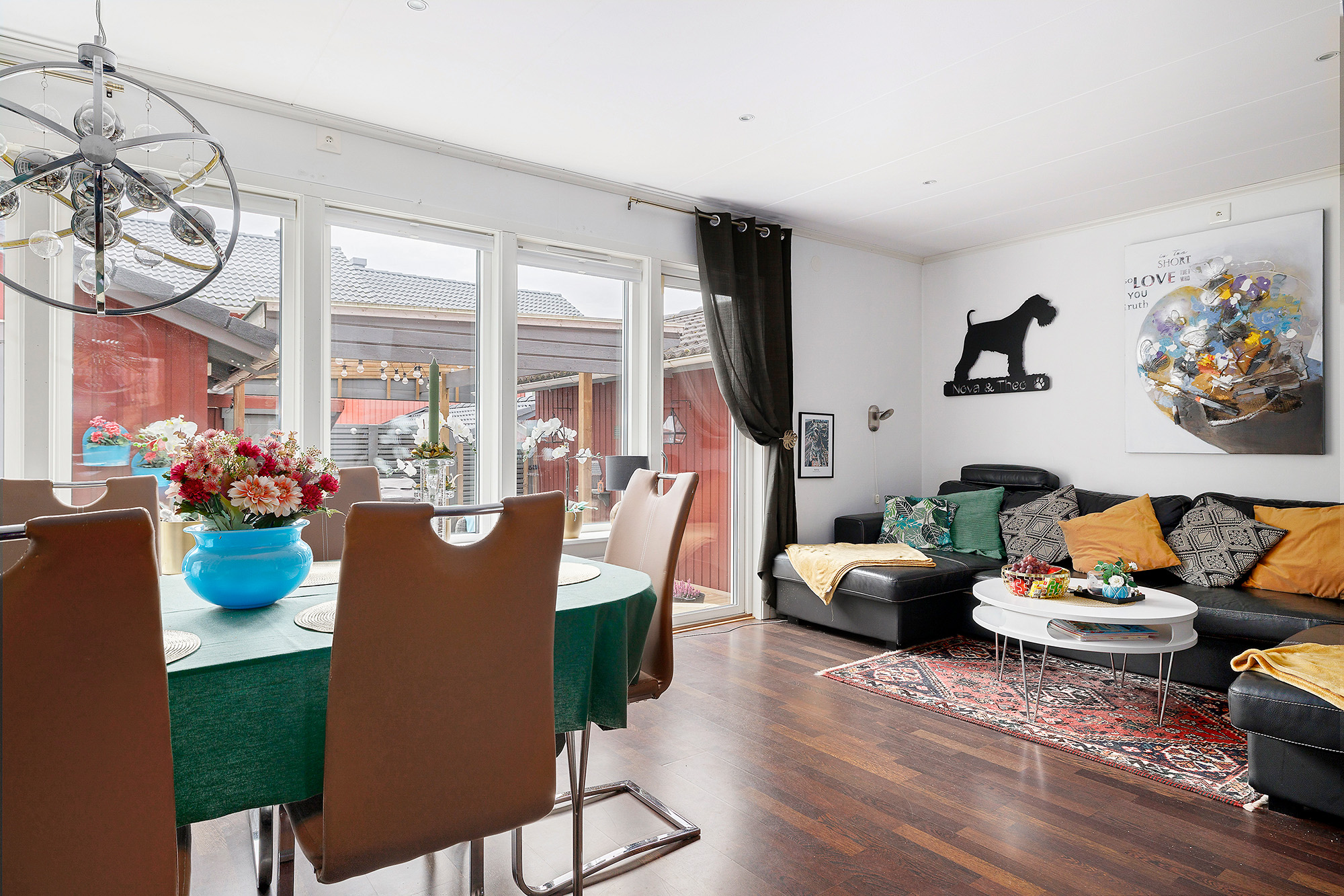 Ljust och rymligt vardagsrum med utgång till baksidans uteplats och förråd. Här ryms både extra matbord och soffhörna. Stora fönsterpartier och spotlights i taket. Måttbeställda rullgardiner för fönstren. Trälaminat på golvet och ljust tapetserade väggar.