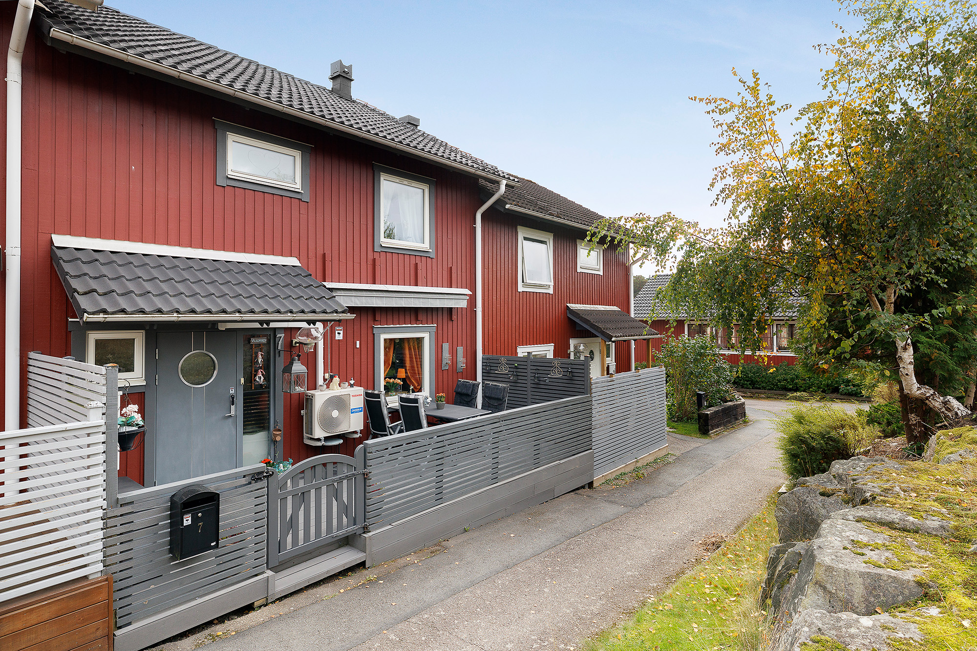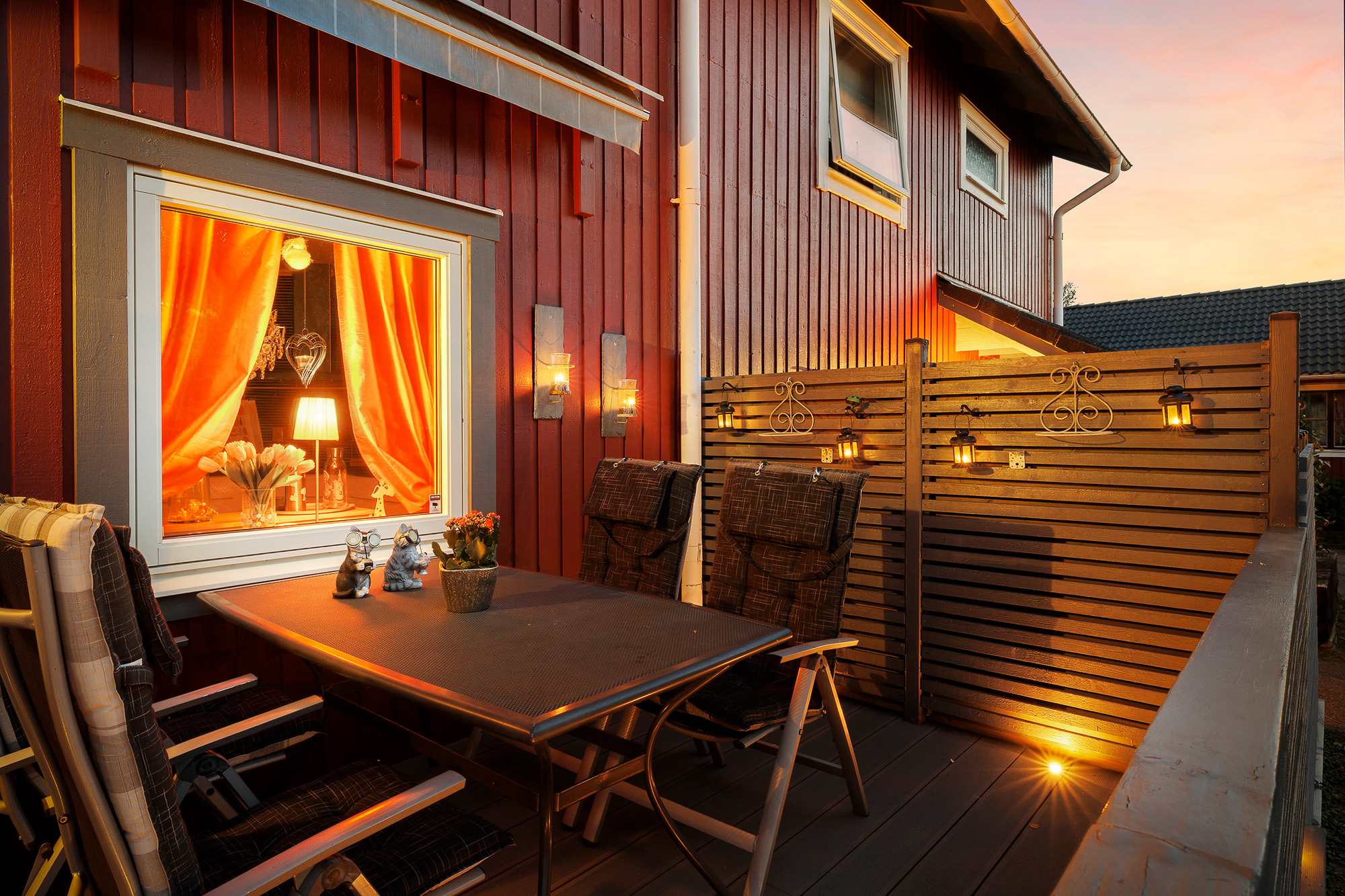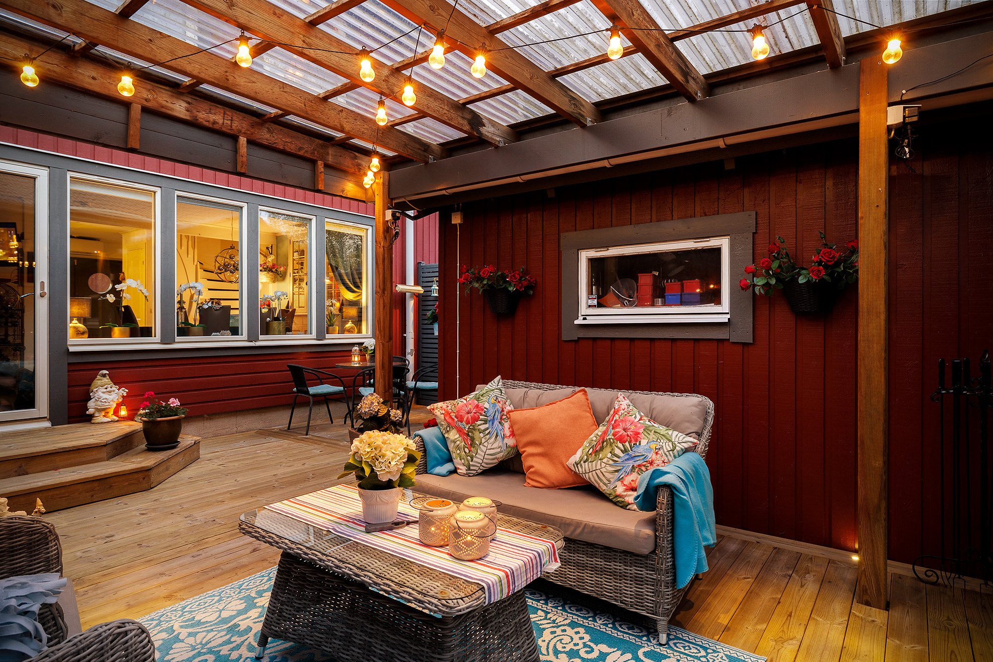 Ljust och rymligt vardagsrum med utgång till baksidans uteplats och förråd. Här ryms både extra matbord och soffhörna. Stora fönsterpartier och spotlights i taket. Måttbeställda rullgardiner för fönstren. Trälaminat på golvet och ljust tapetserade väggar.