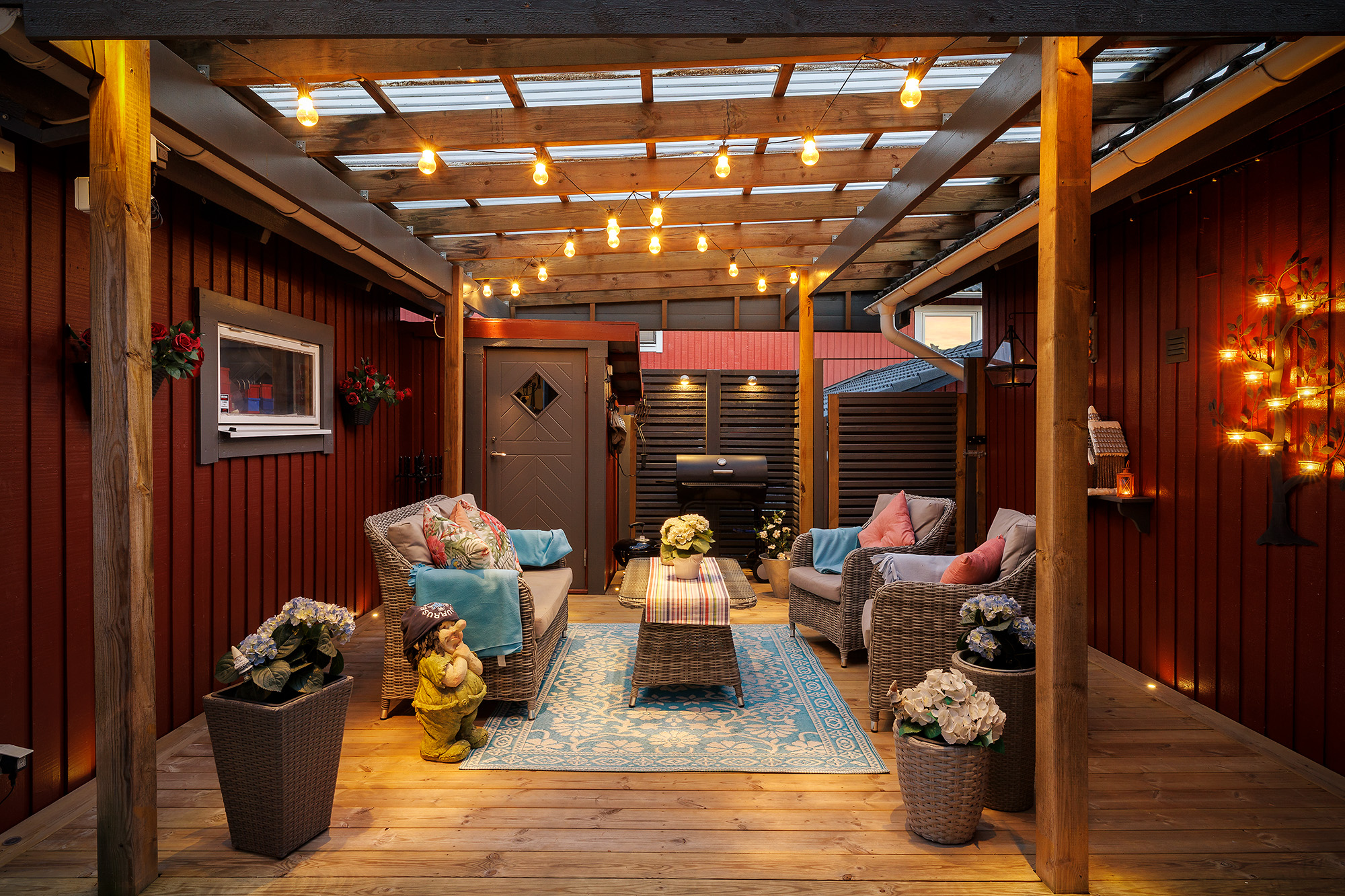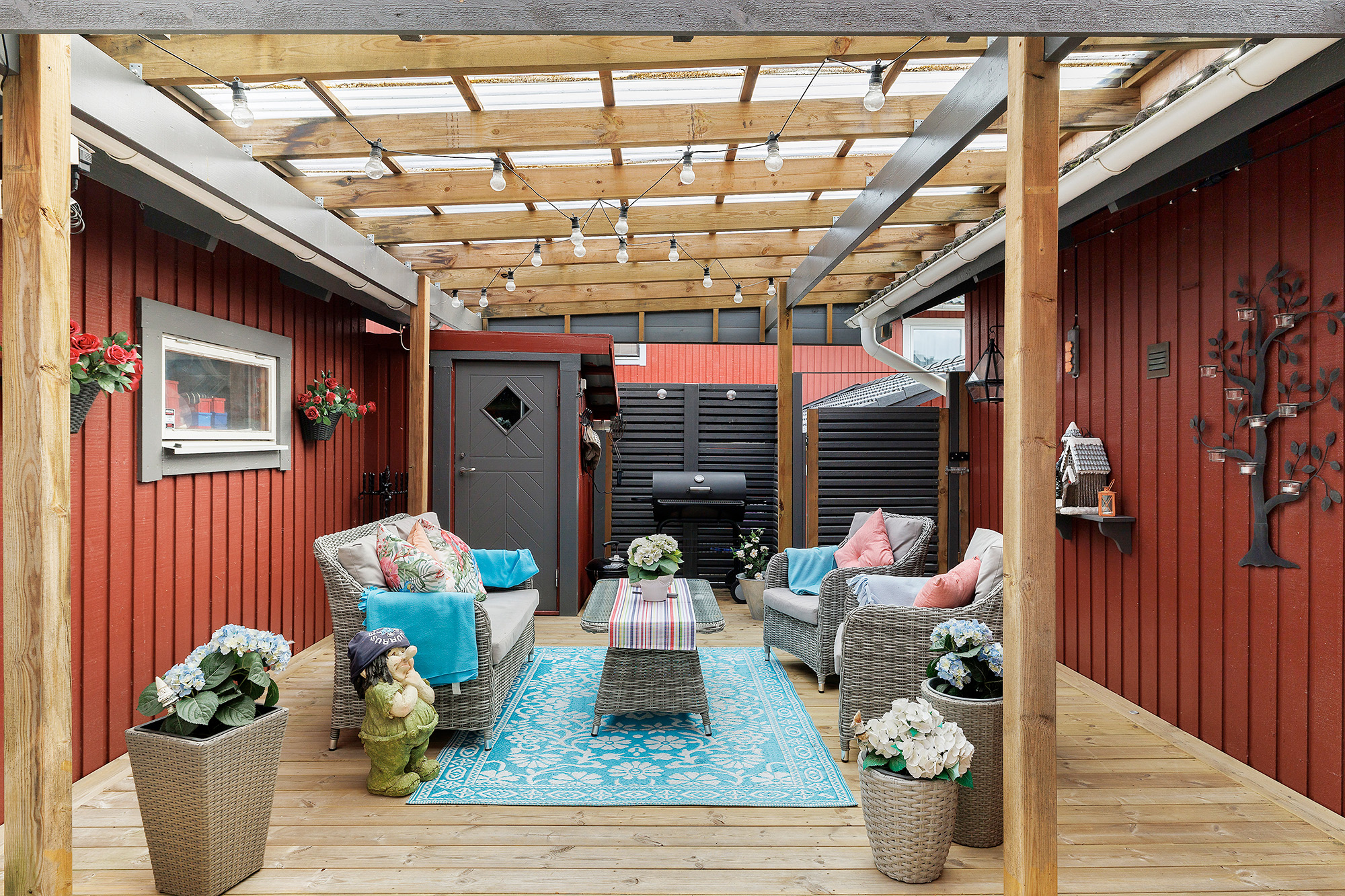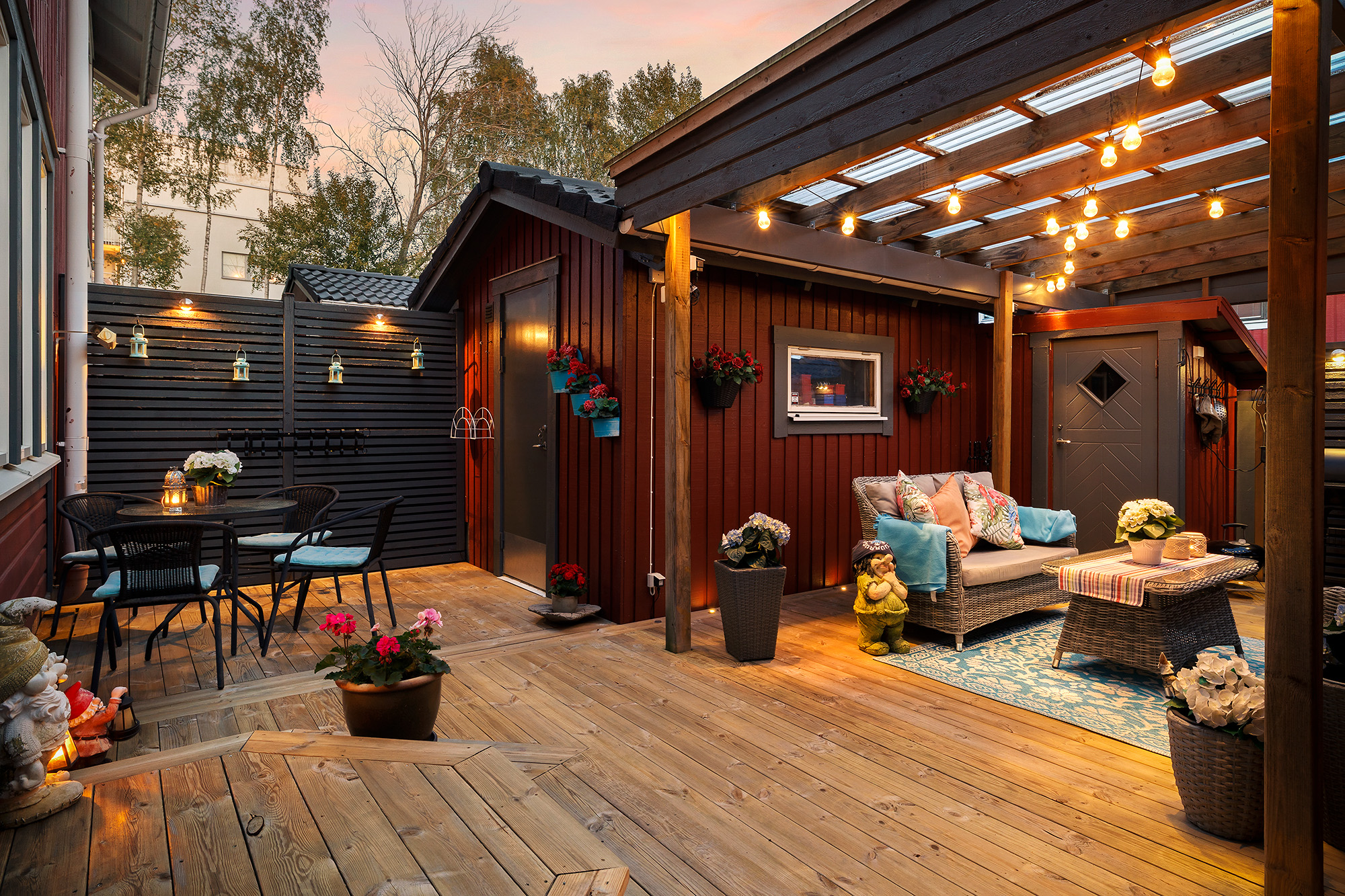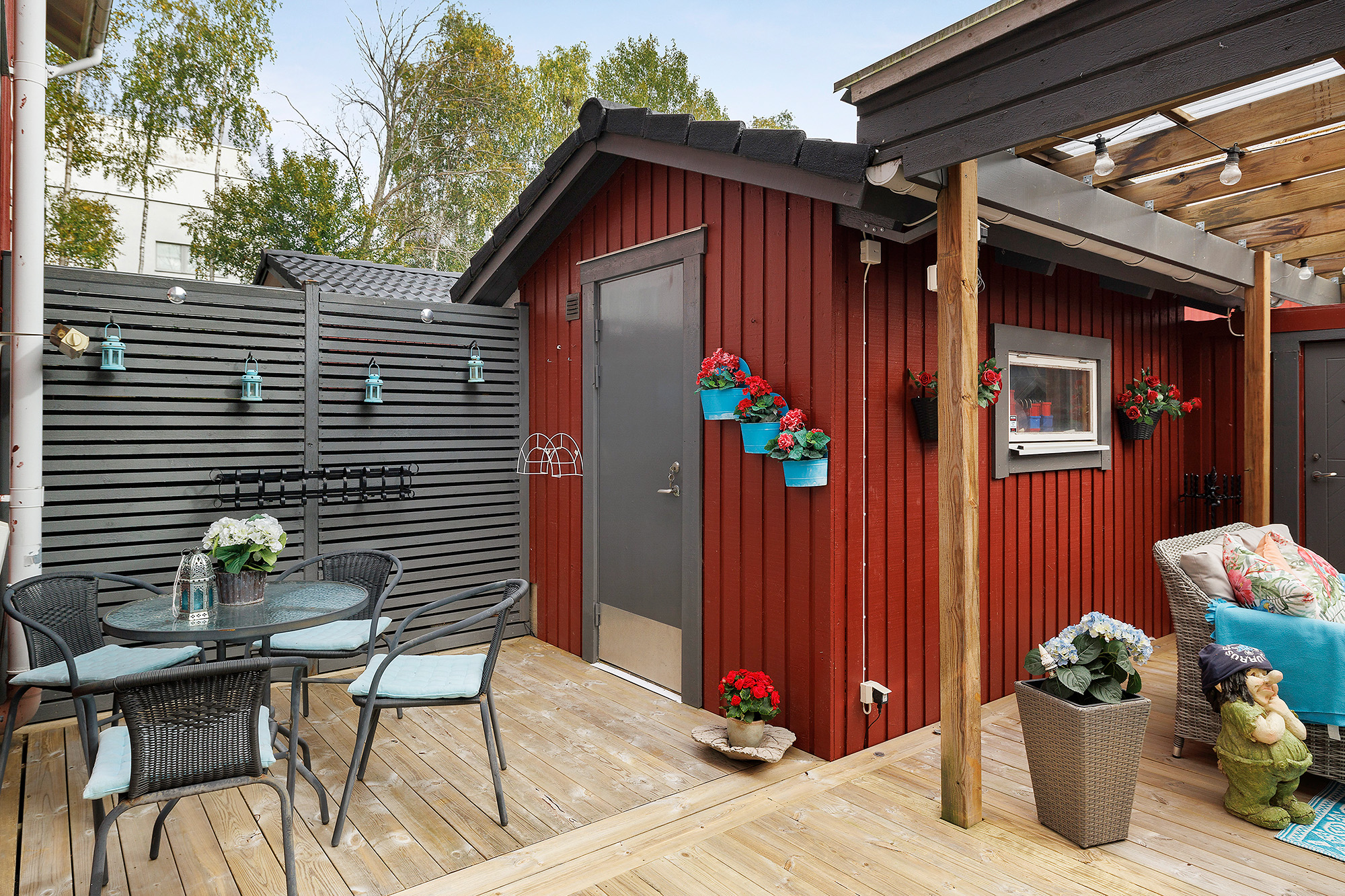 Ljust och rymligt vardagsrum med utgång till baksidans uteplats och förråd. Här ryms både extra matbord och soffhörna. Stora fönsterpartier och spotlights i taket. Måttbeställda rullgardiner för fönstren. Trälaminat på golvet och ljust tapetserade väggar.