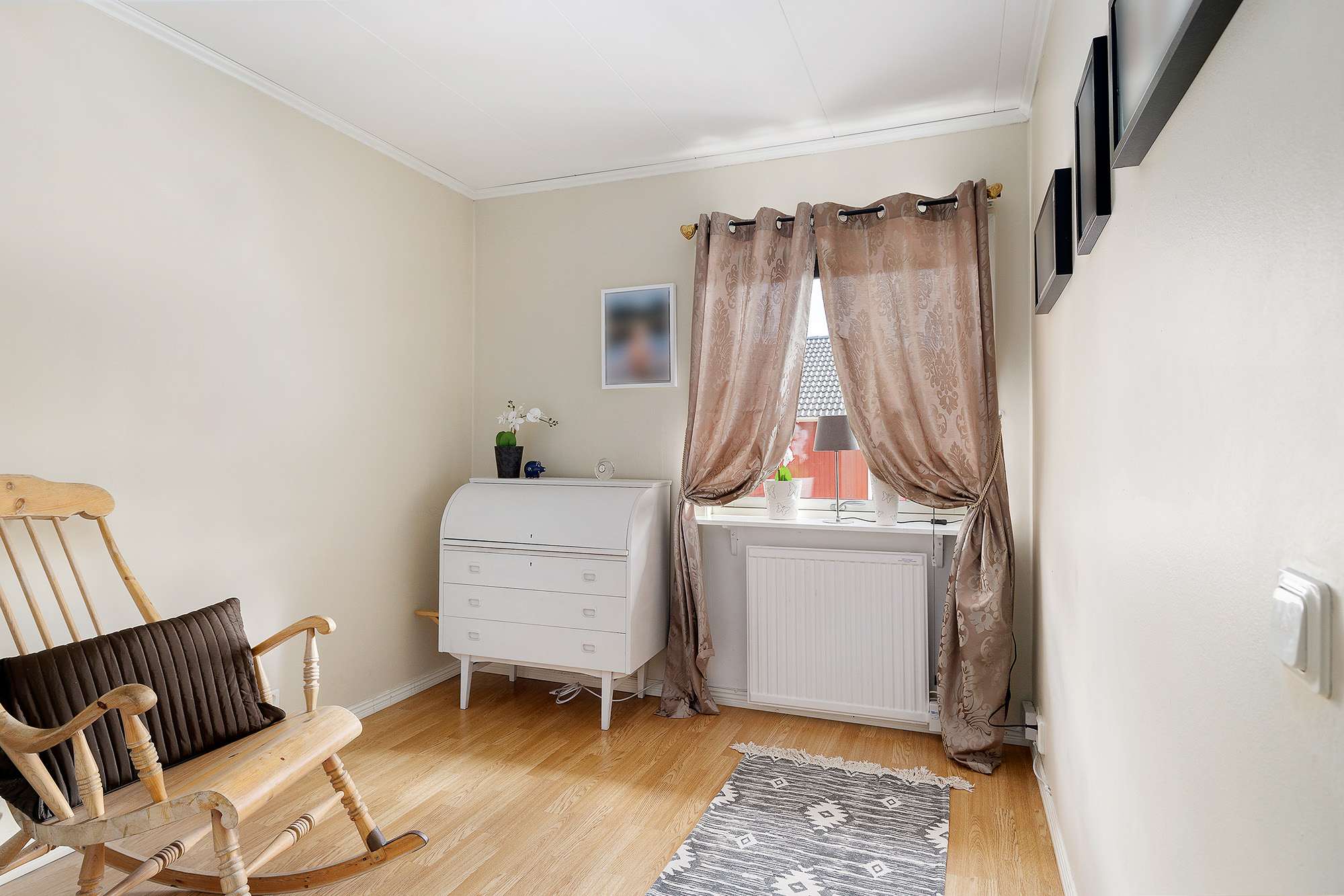 Det mindre sovrummet men fortfarande enkelt att möblera och rymmer även säng med övriga möbler. Trälaminat på golvet och ljust målade väggar.