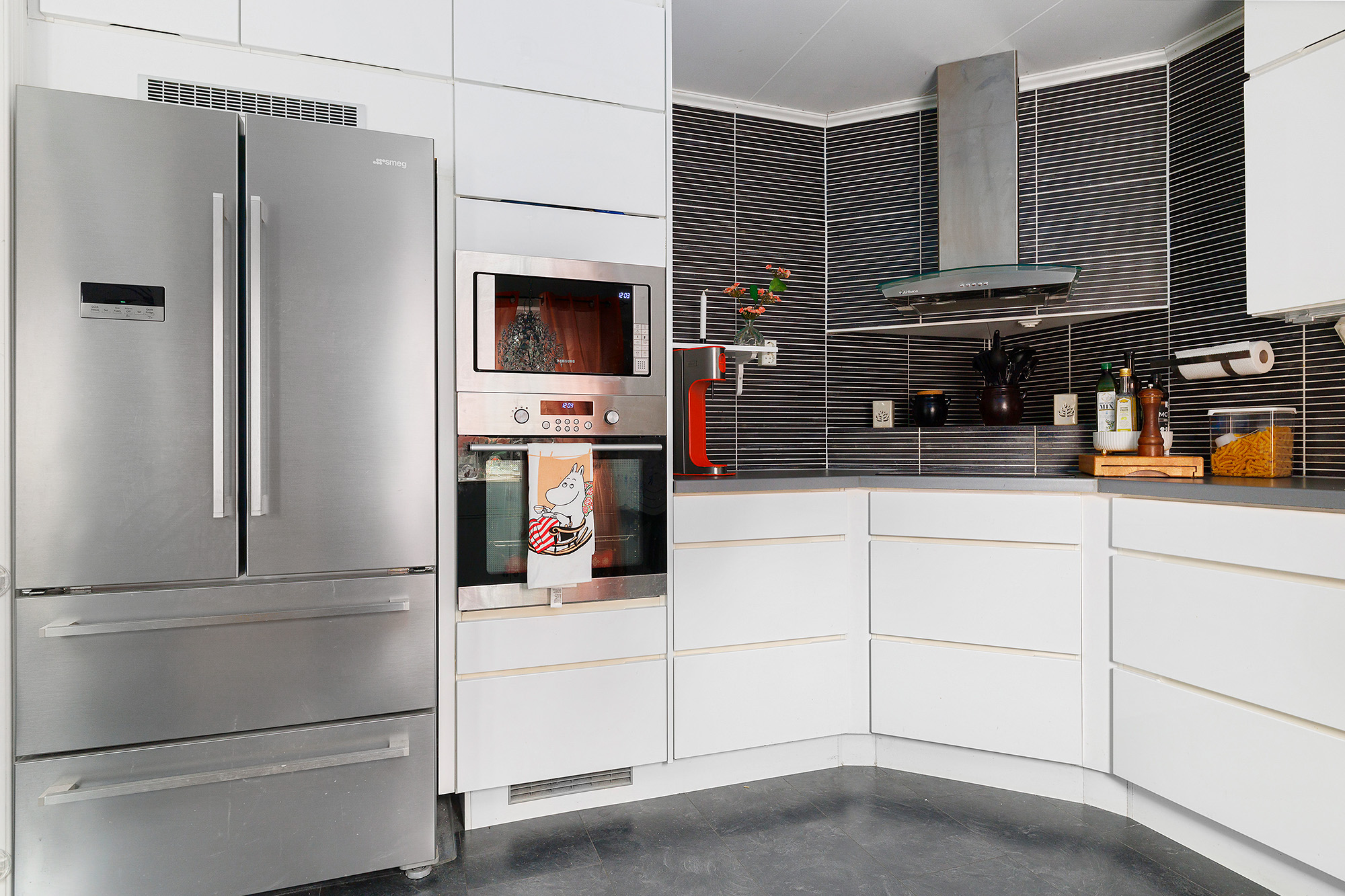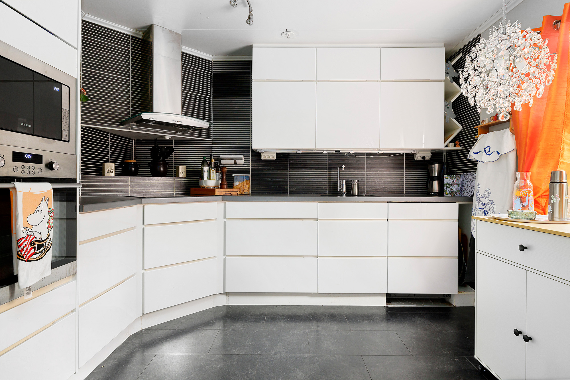 Köket går i vitt med snygt kakel ovan köksbänk och samma laminatgolv som i hallen. Här finns gott om förvaring i flera skåp och lådor. Snyggt platsbyggd avsats bakom spishäll. Maskinparken består av dubbelkyl med fryslådor under, inbyggda mocro och ugn i arbetsvänlig höjd och i rostfritt, spishäll, fläkt i rostfritt samt integrerad diskmaskin.